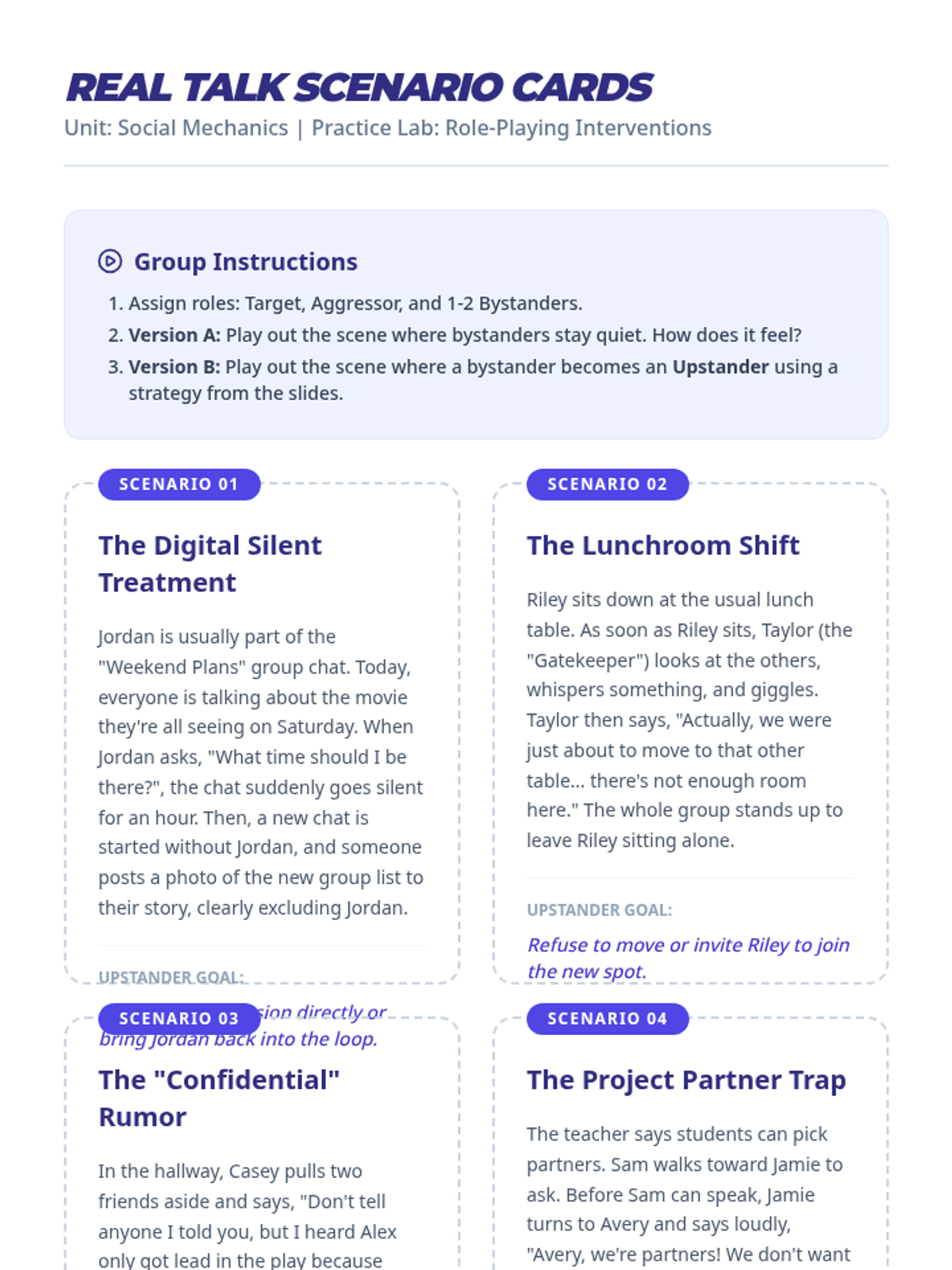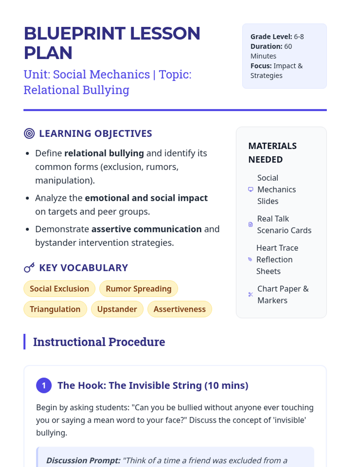 This lesson focuses on identifying relational bullying (social exclusion, rumor-spreading, friendship manipulation), understanding its deep emotional impact, and practicing specific verbal and social strategies to disrupt these patterns.