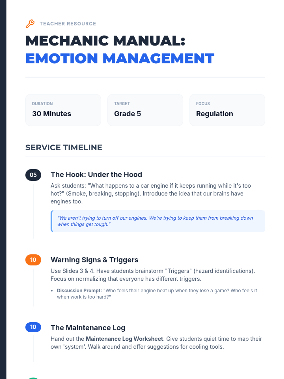 A 30-minute SEL lesson for 5th graders focused on identifying emotional triggers and applying self-regulation 'cooling' strategies using a mechanical 'Emotion Engine' metaphor.