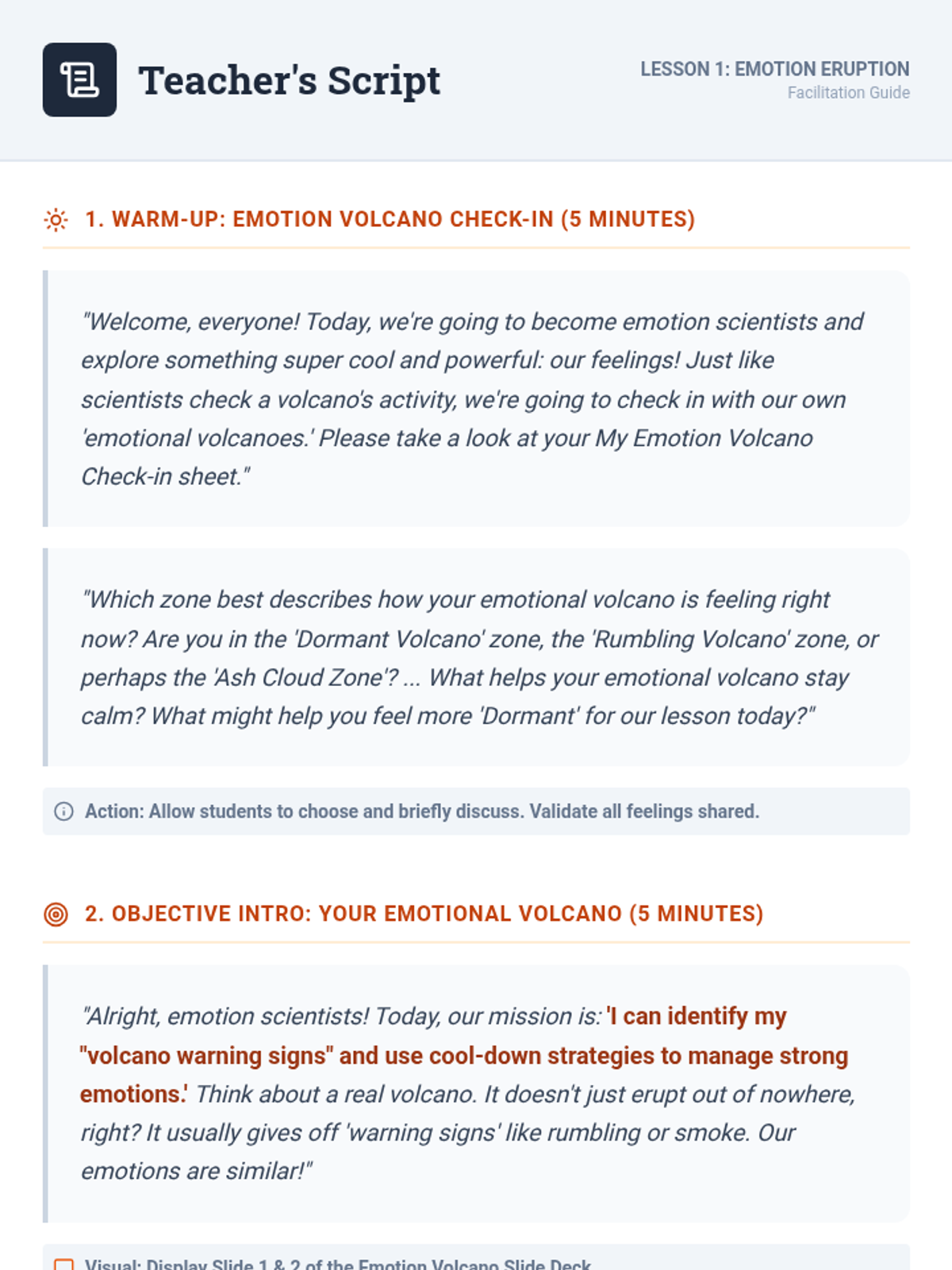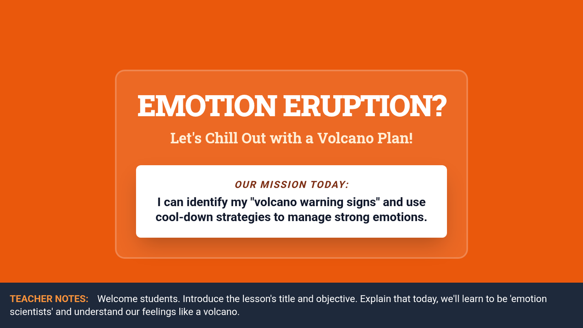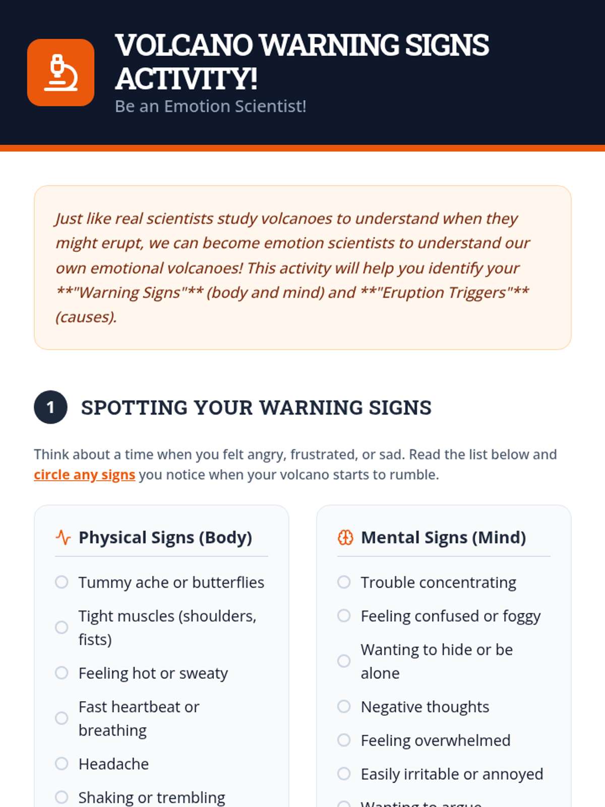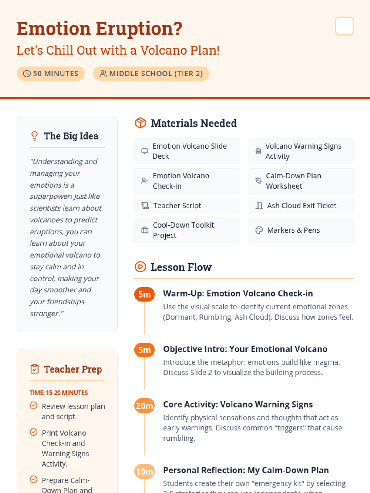 A 50-minute lesson for middle school students to understand and manage strong emotions using a volcano metaphor, focusing on identifying "warning signs" and implementing "cool-down strategies."