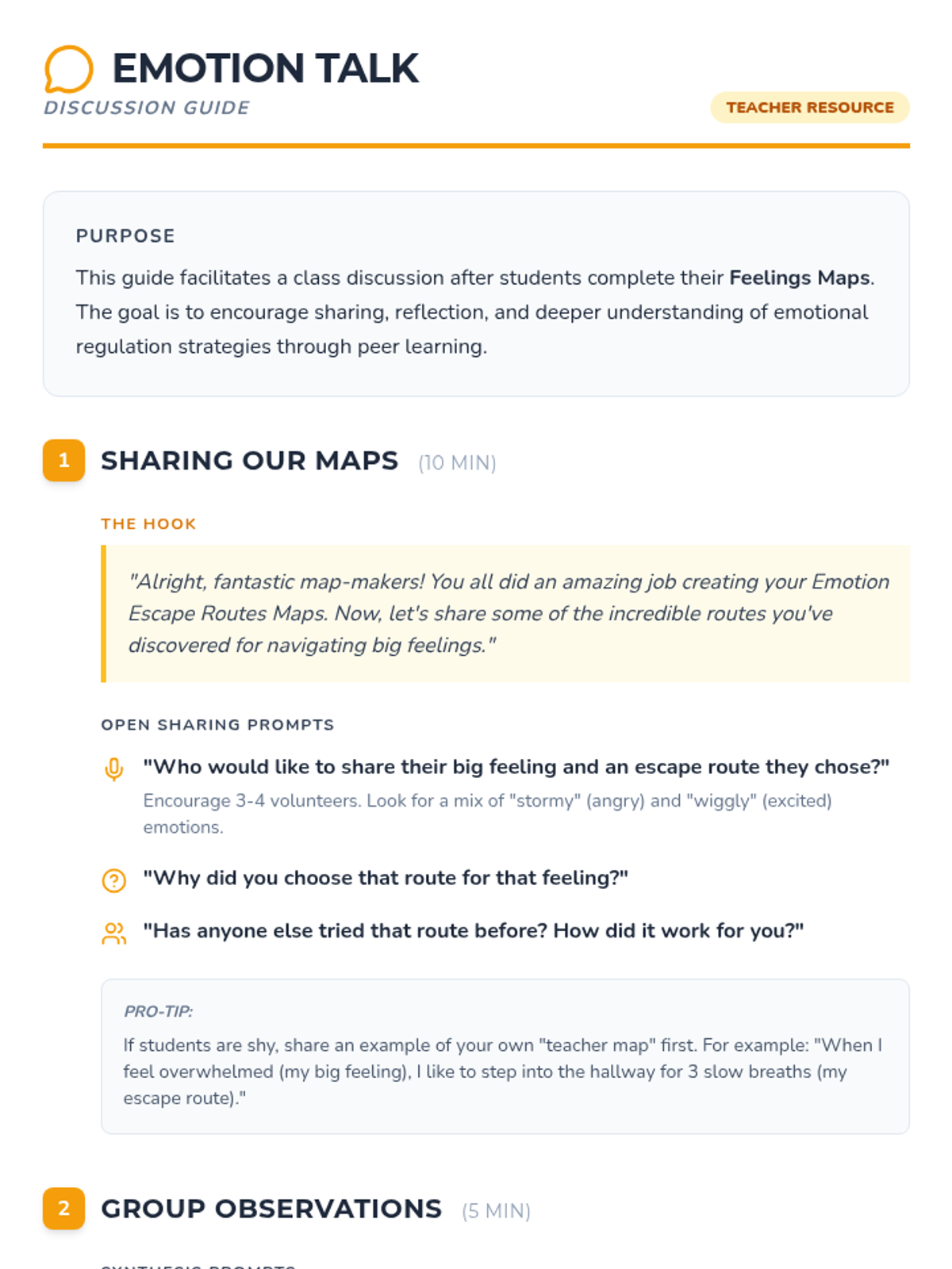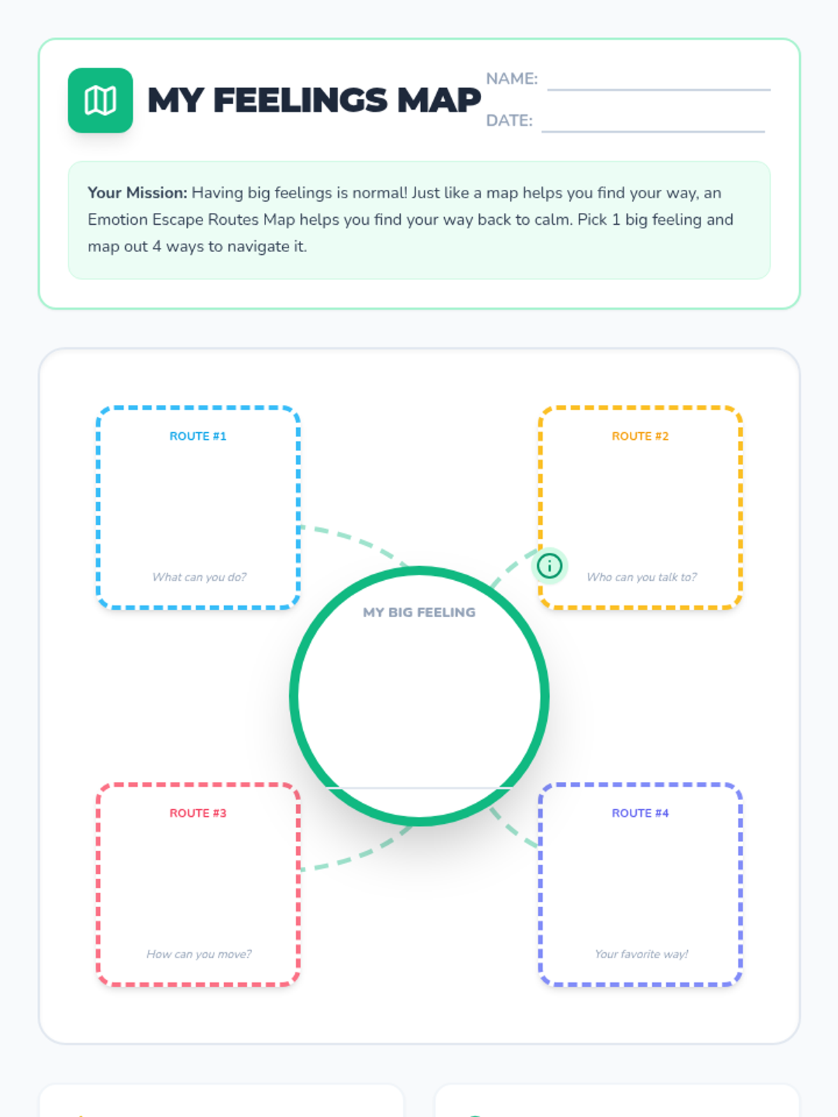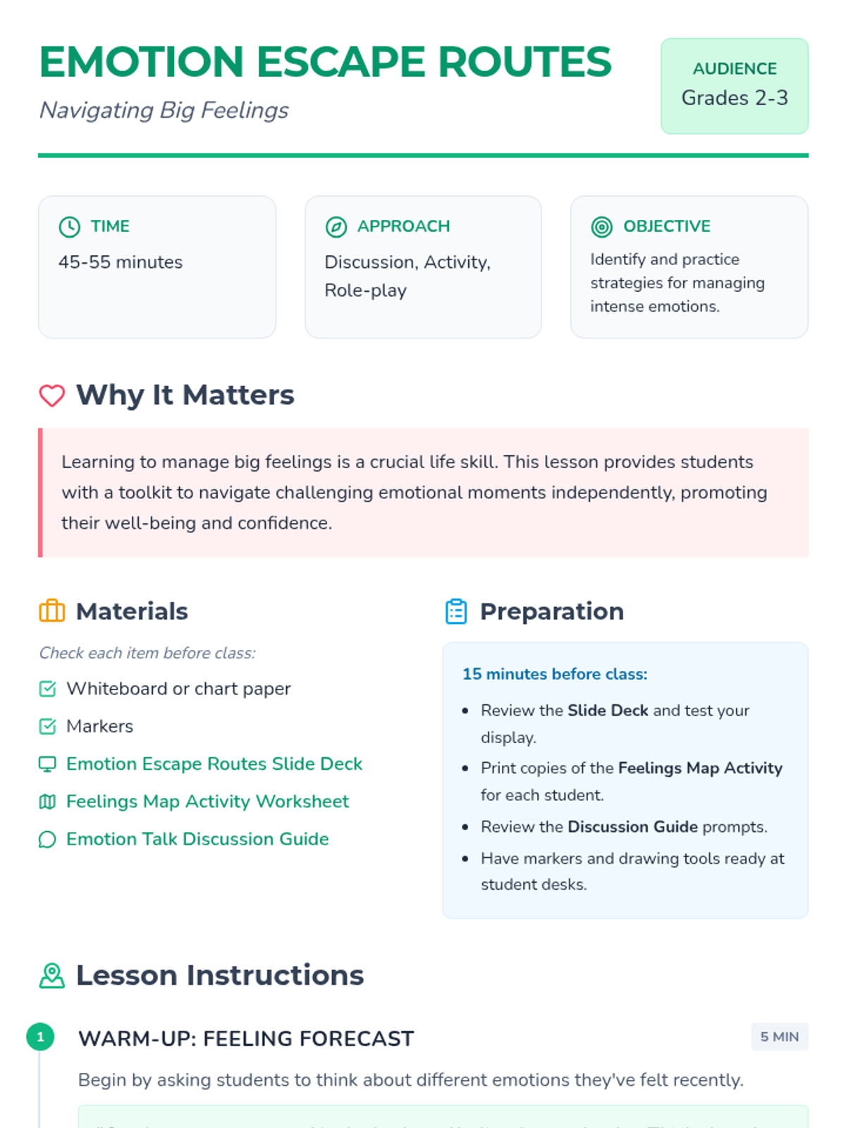 A social-emotional learning lesson for Grades 2-3 that teaches practical strategies for managing intense emotions using the metaphor of 'escape routes' and navigation.