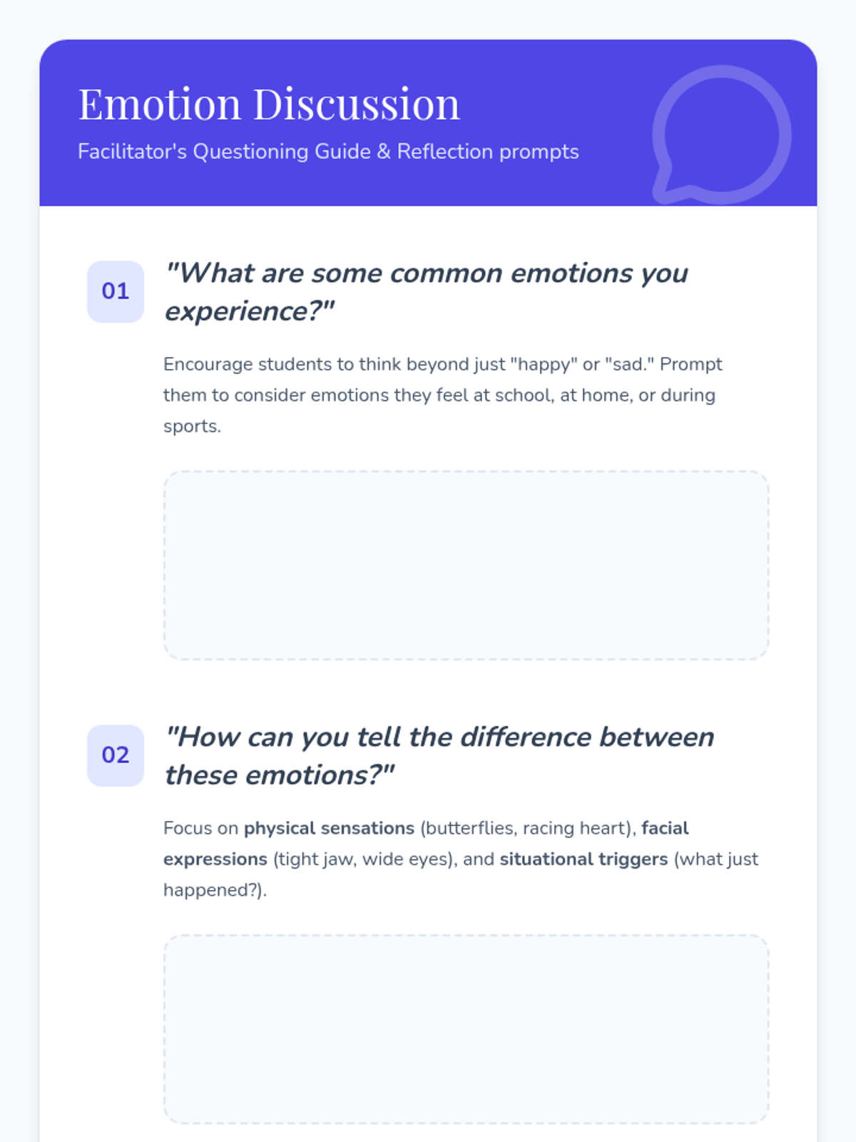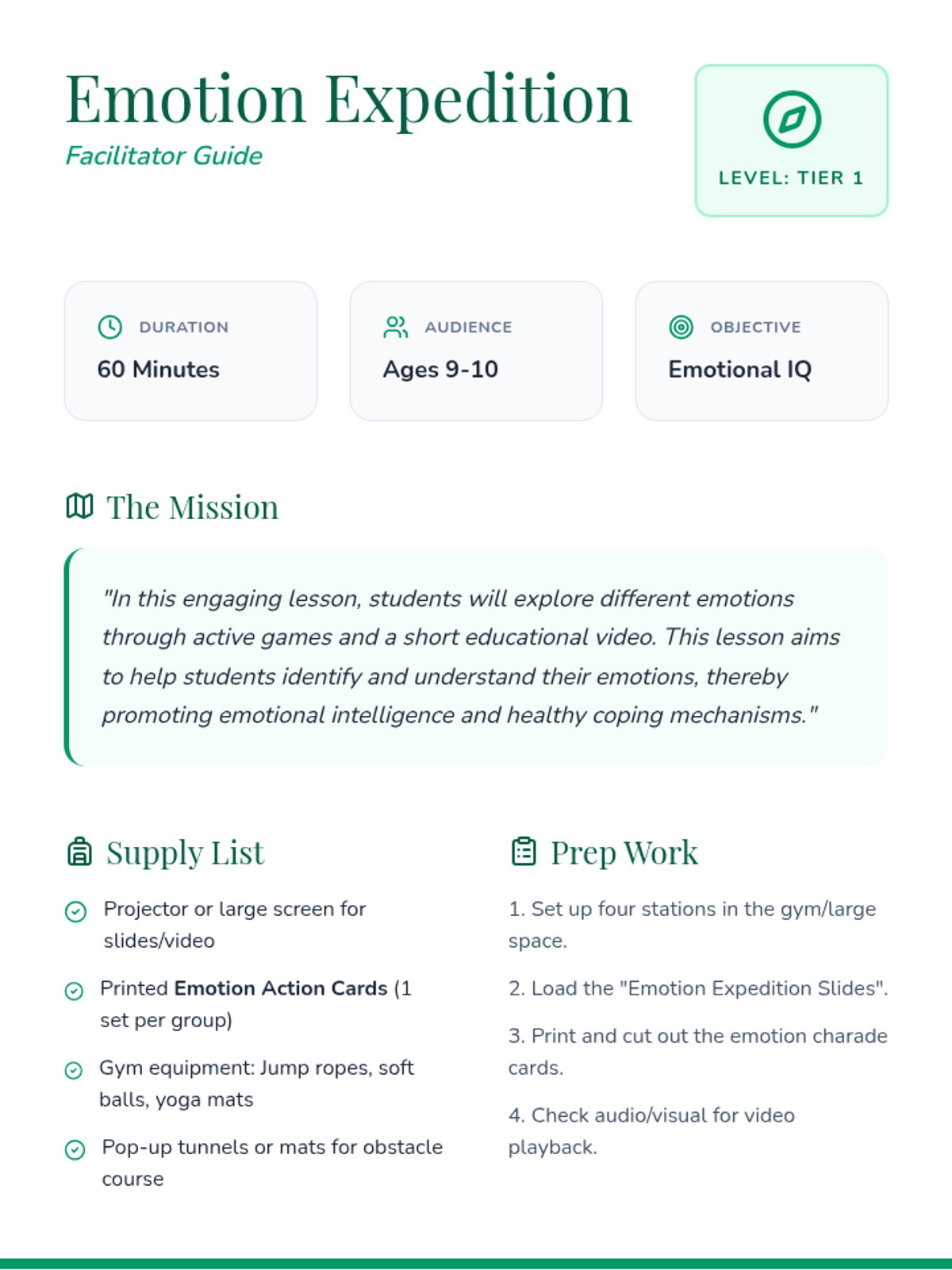 An interactive lesson where 9-10 year olds explore emotional intelligence through physical movement, video analysis, and collaborative games. Students learn to identify physical and situational cues for various emotions while building empathy and coping strategies.