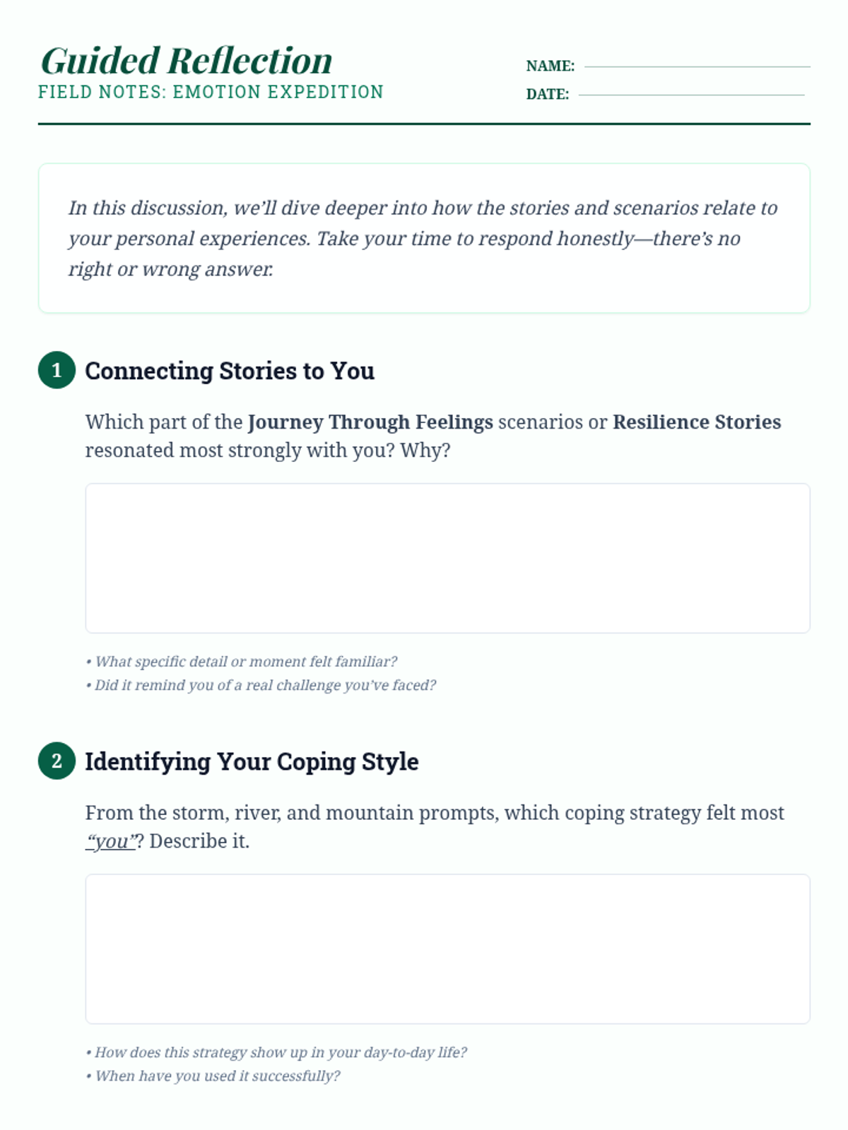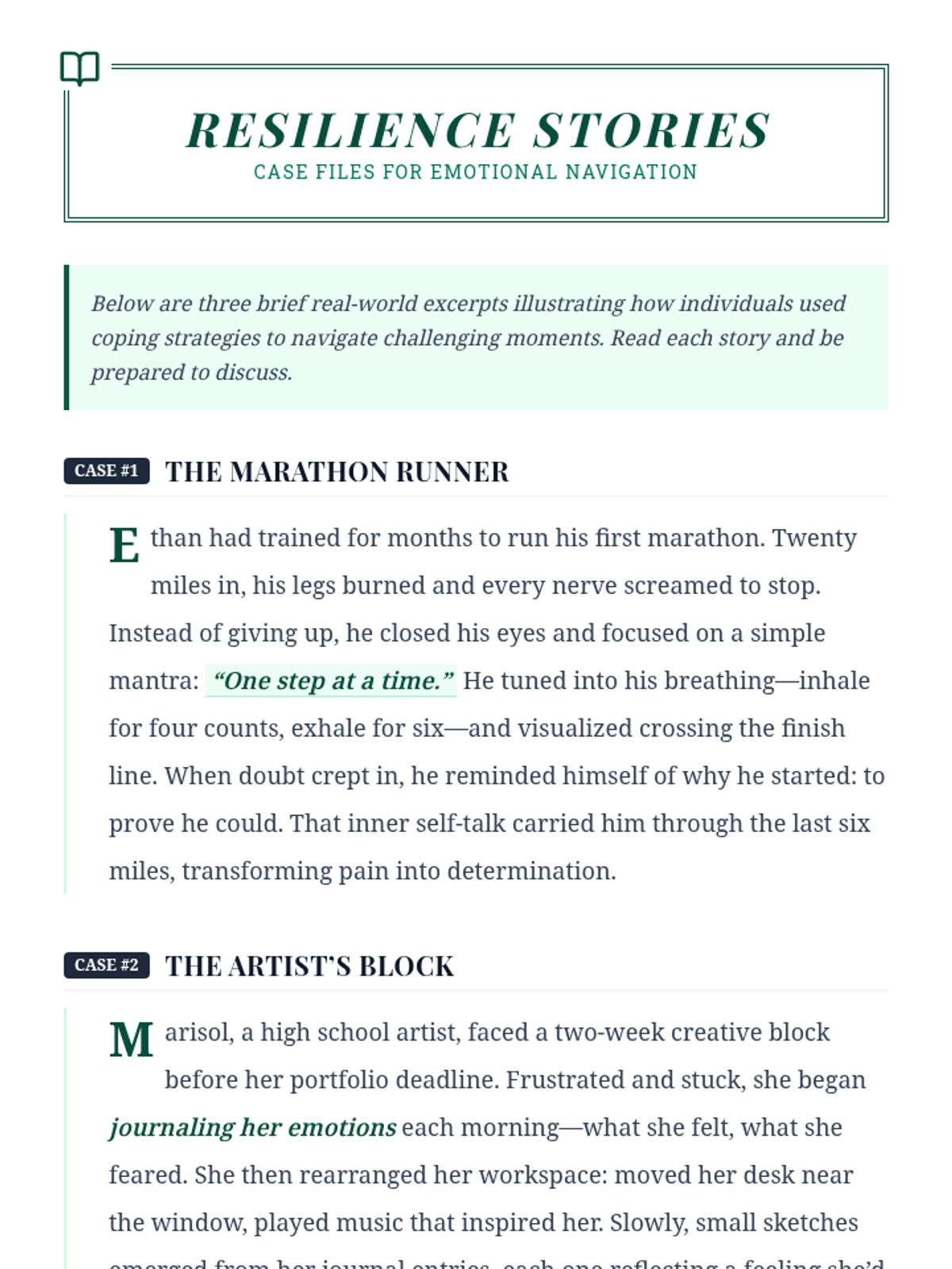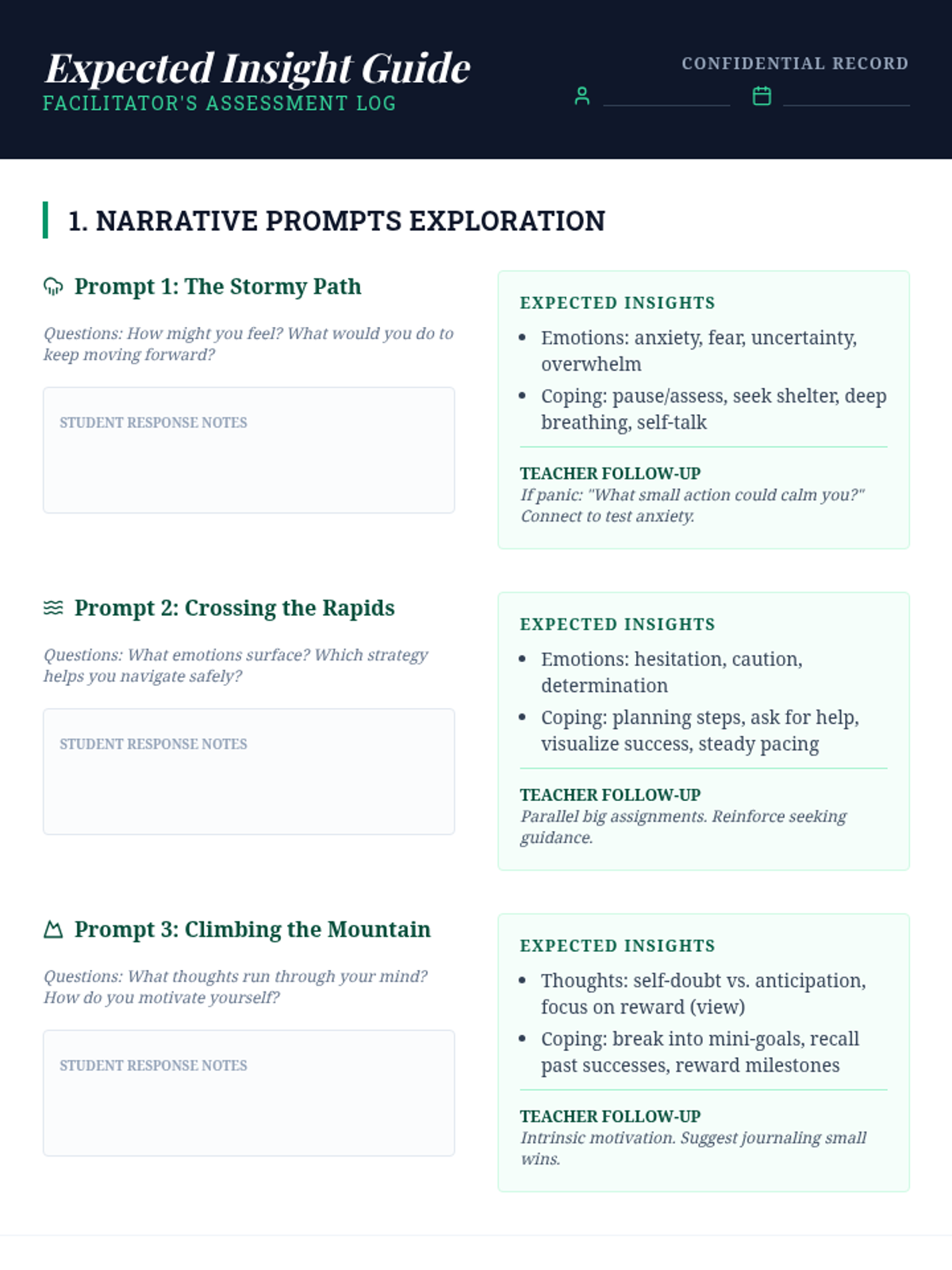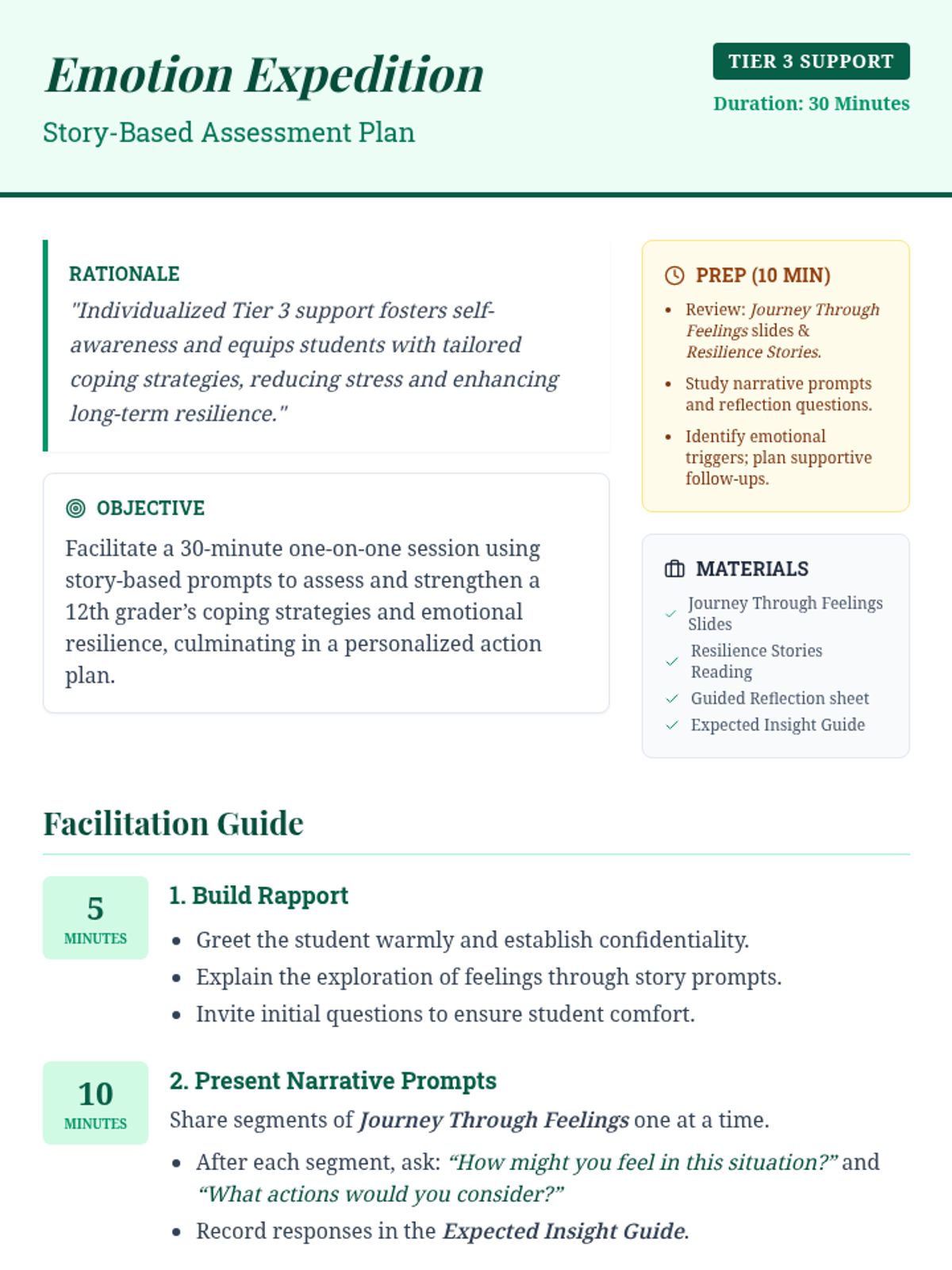 A personalized 30-minute, story-driven Tier 3 session that guides a 12th-grade student through narrative prompts to uncover coping strategies and build emotional resilience.