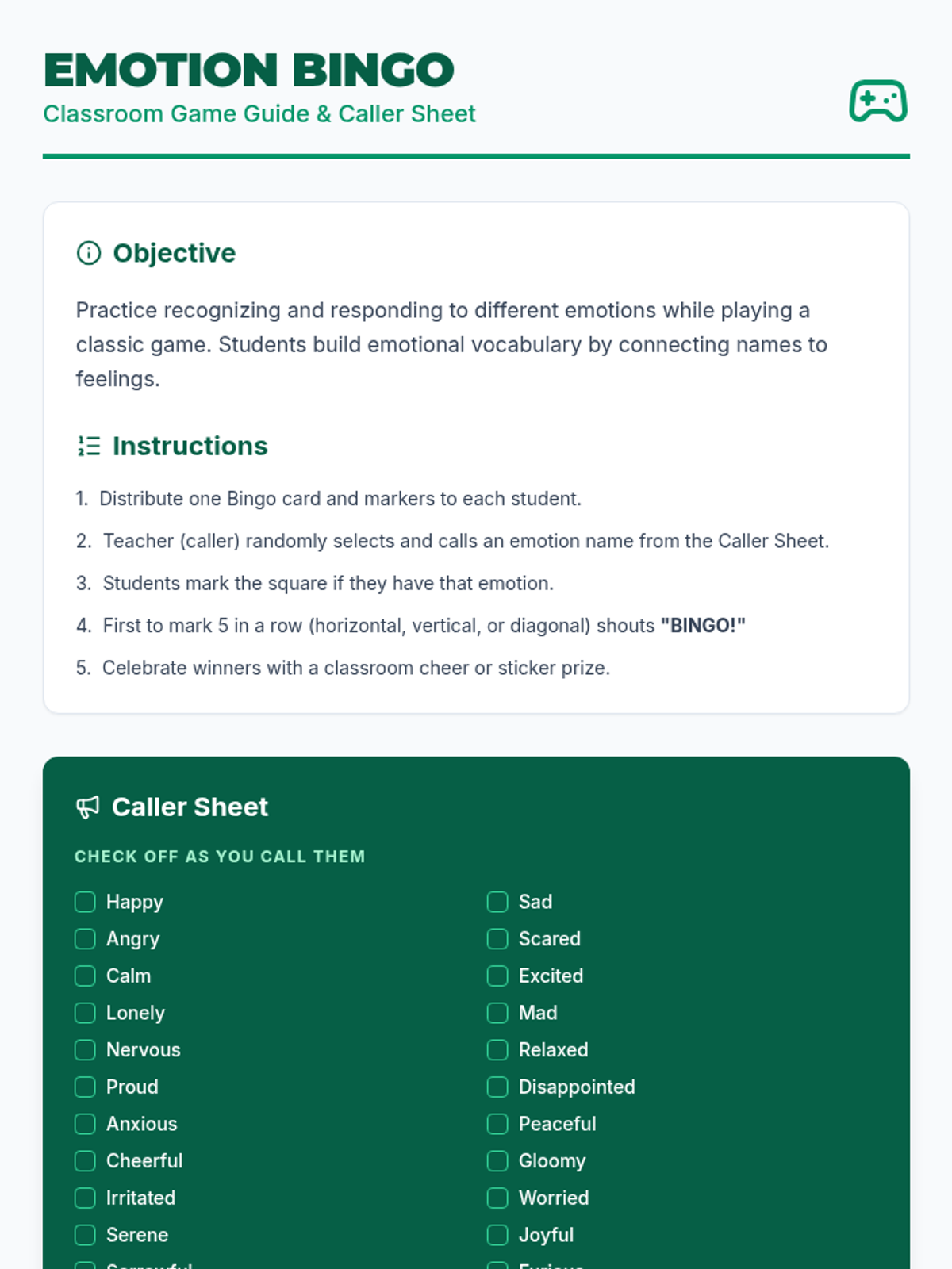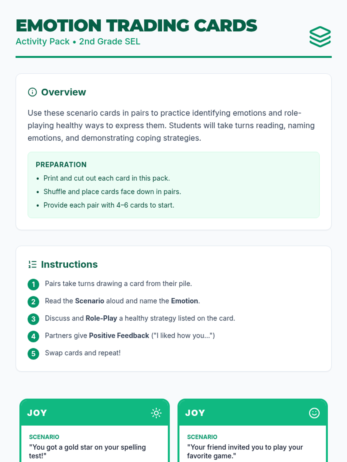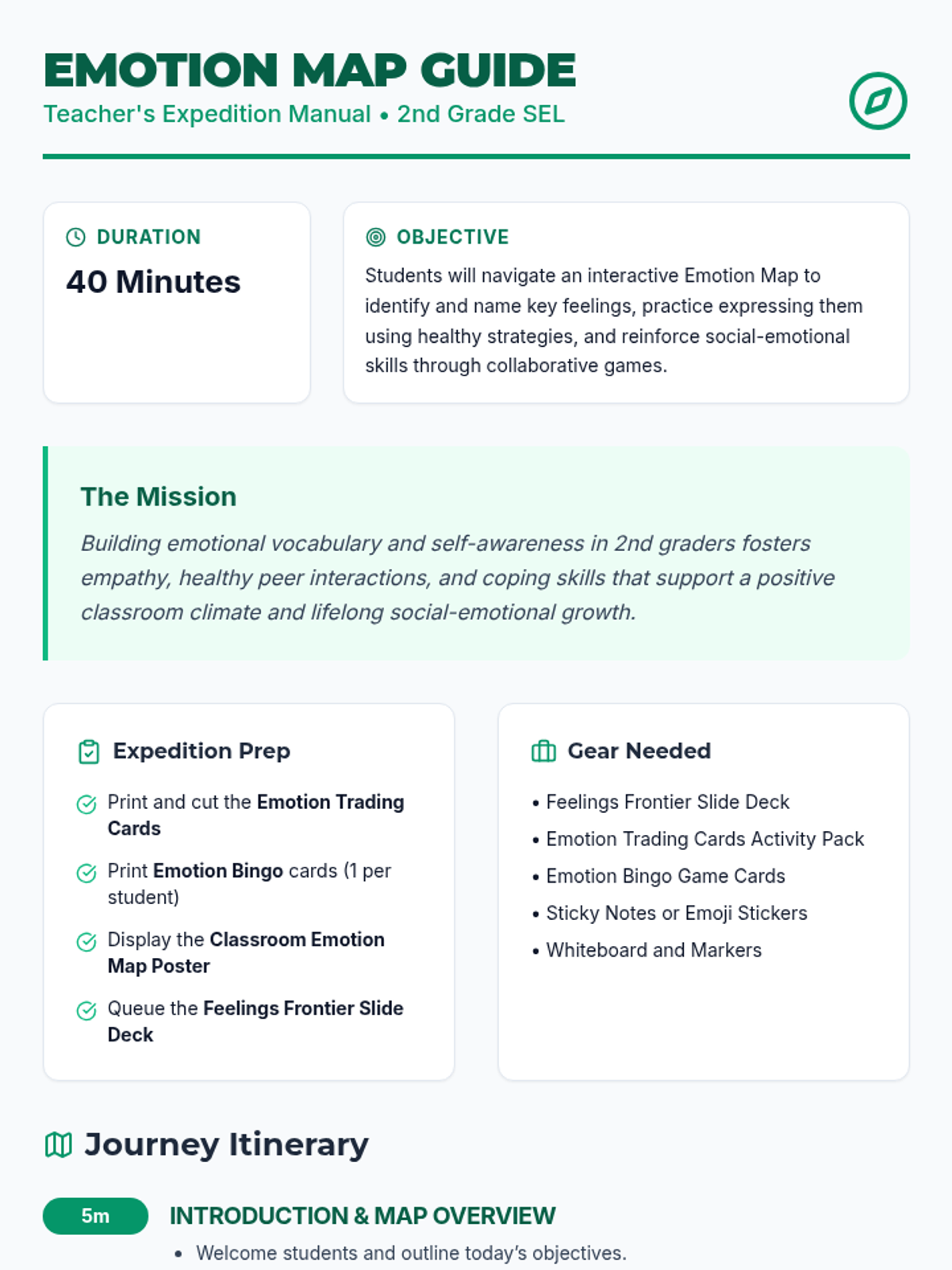 A 40-minute Tier 1 social-emotional journey where 2nd graders explore an interactive Emotion Map to identify feelings and practice healthy expression strategies through games and role-play.
