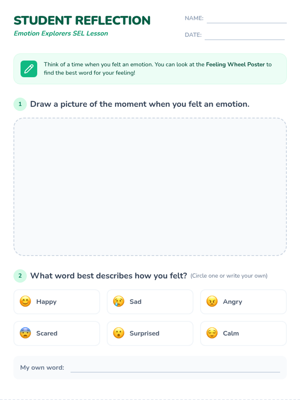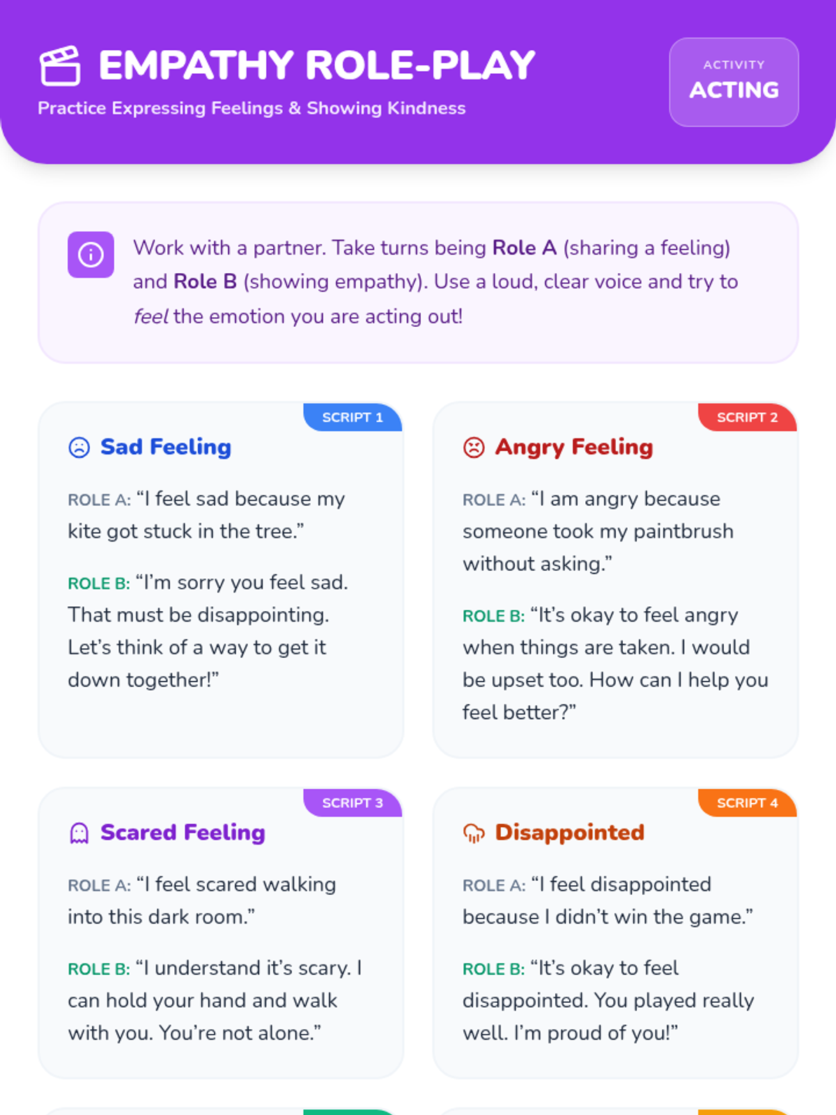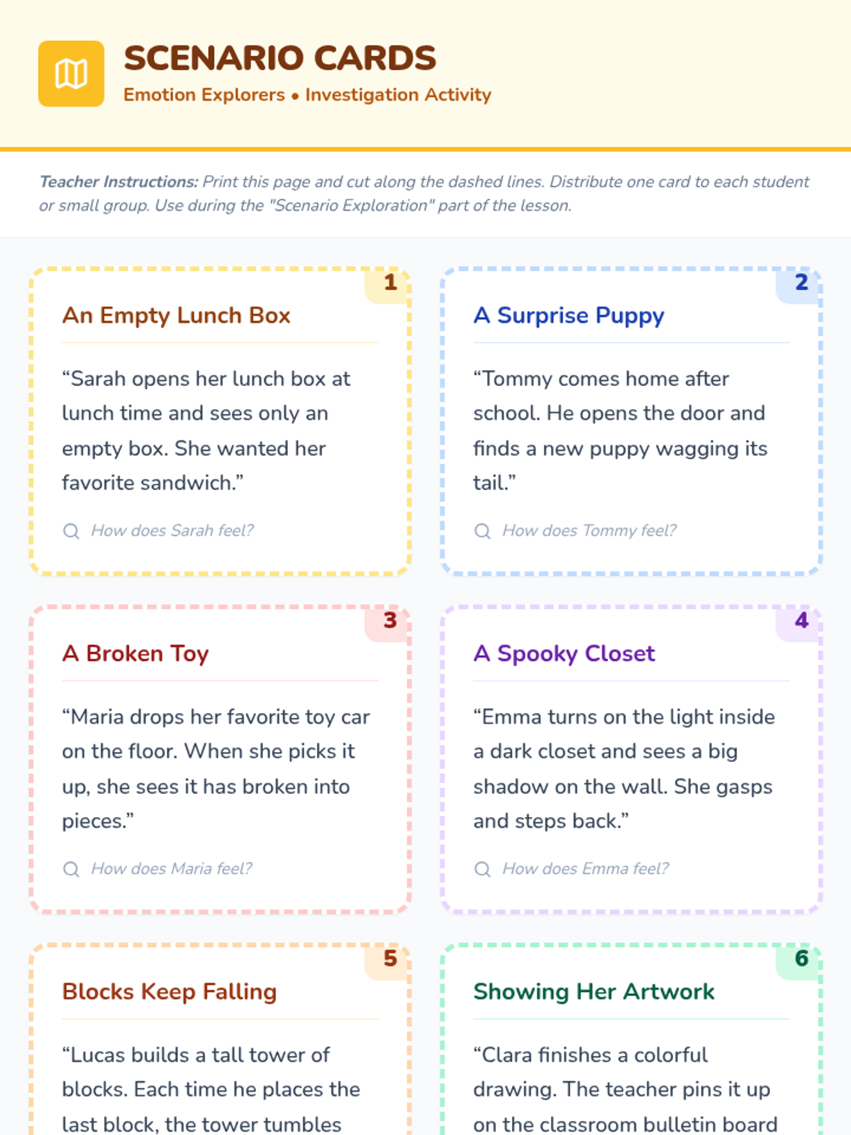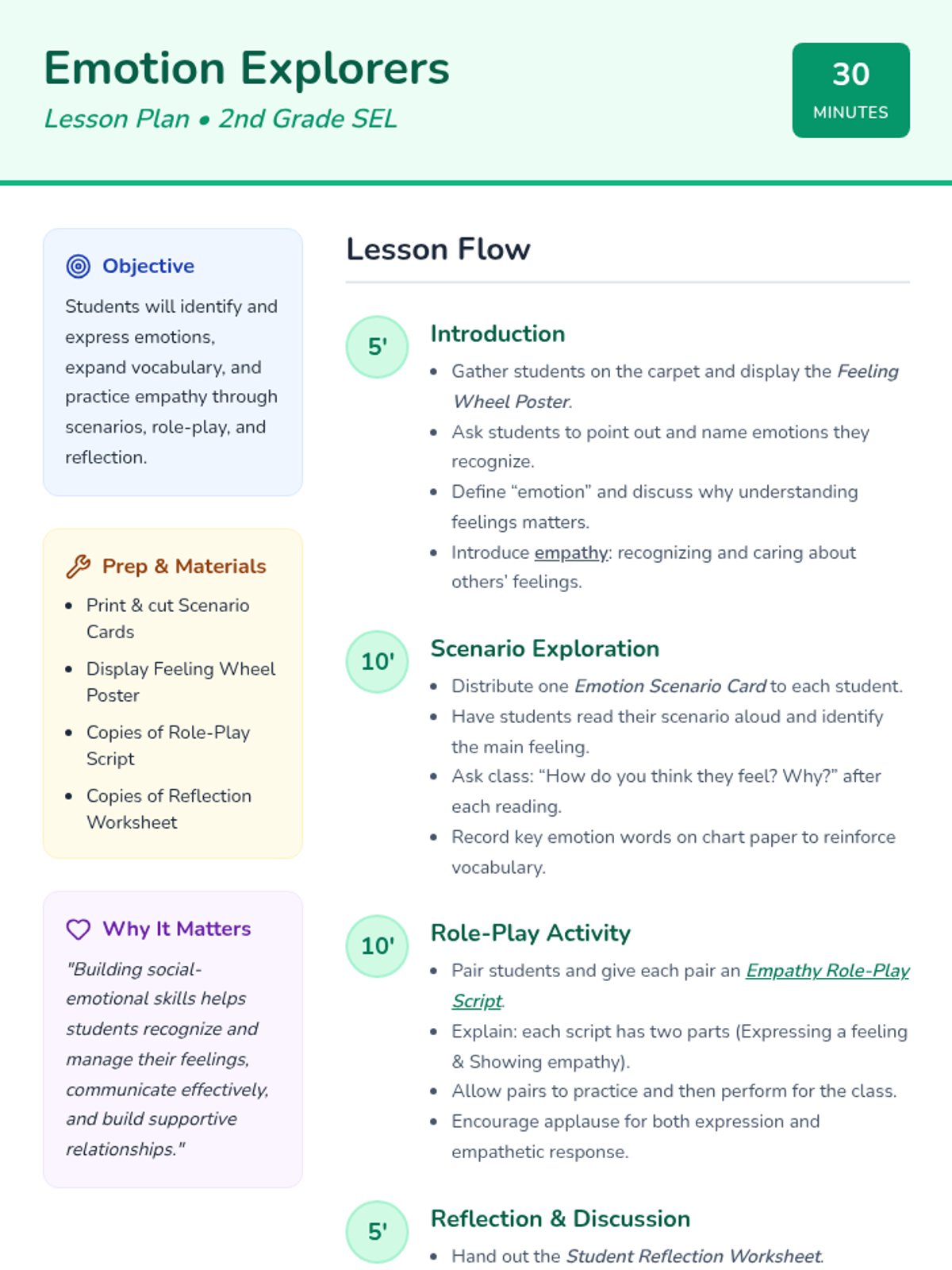 A 30-minute lesson for 2nd graders to develop social-emotional intelligence by identifying emotions, expanding their feeling vocabulary, and practicing empathy through role-play.