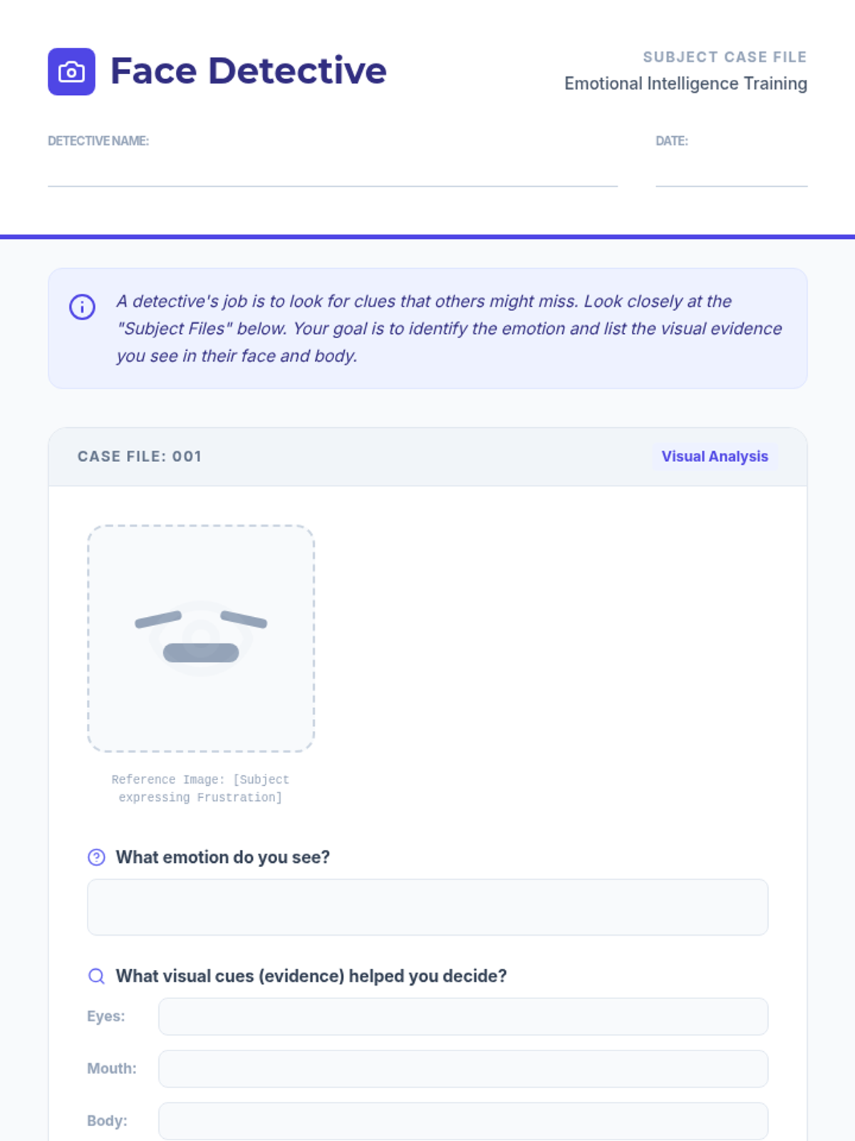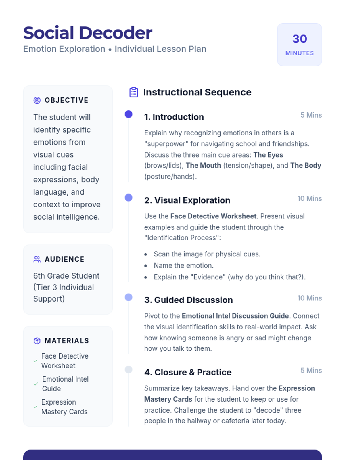 A Tier 3 individual lesson for a 6th-grade student focused on identifying and understanding emotions through visual cues to improve emotional intelligence and social communication.
