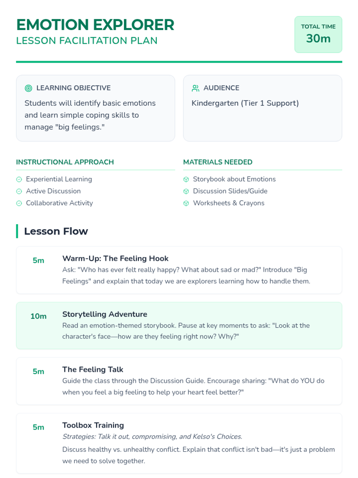 A kindergarten lesson designed to help students recognize basic emotions and learn simple coping strategies through storytelling, discussion, and creative activities. Students will explore feelings like happiness, sadness, and anger while practicing conflict resolution skills.