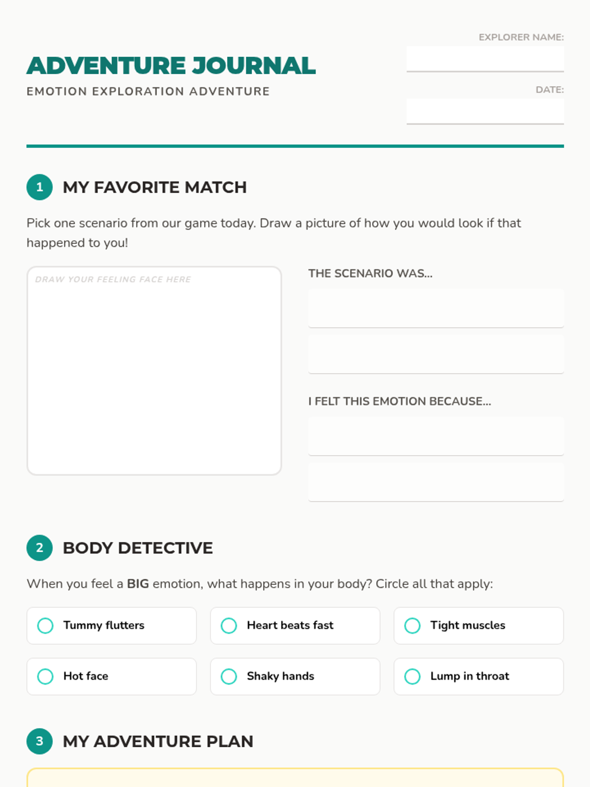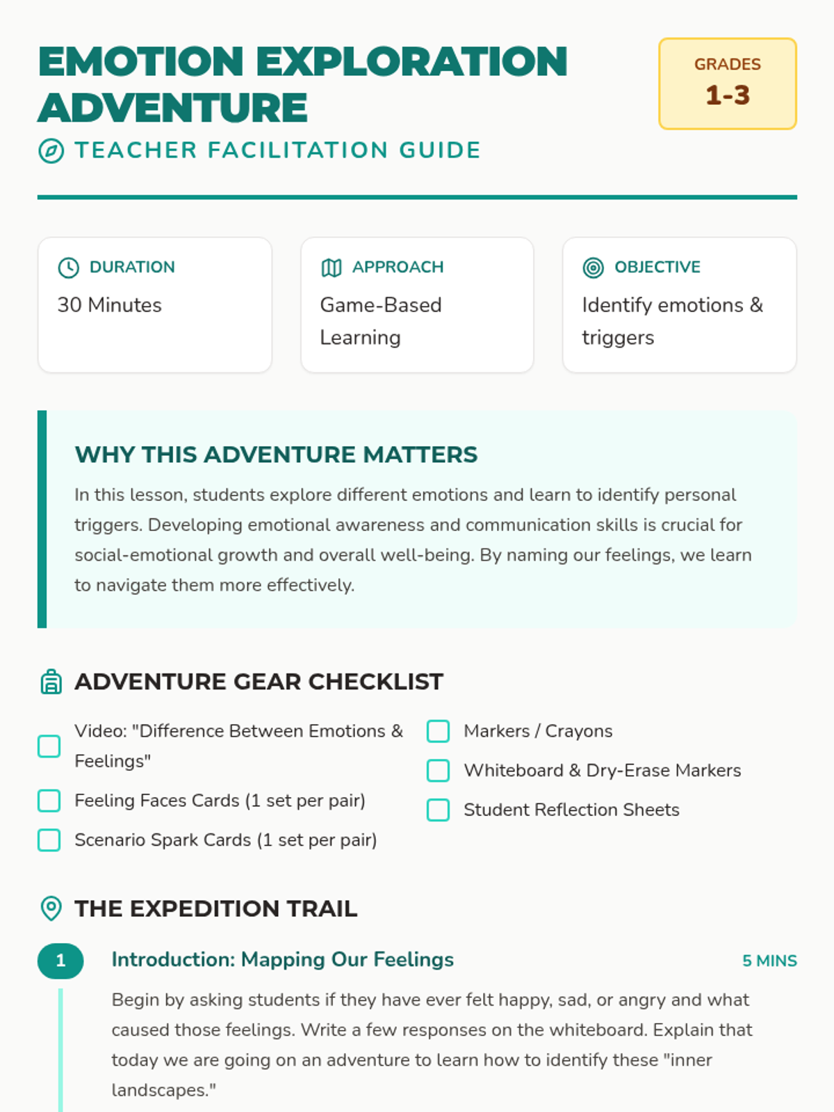 Students embark on an 'Emotion Exploration Adventure' to identify primary emotions and their triggers through interactive videos, discussion, and a matching game. This lesson builds fundamental self-awareness and social-emotional vocabulary for early elementary students.