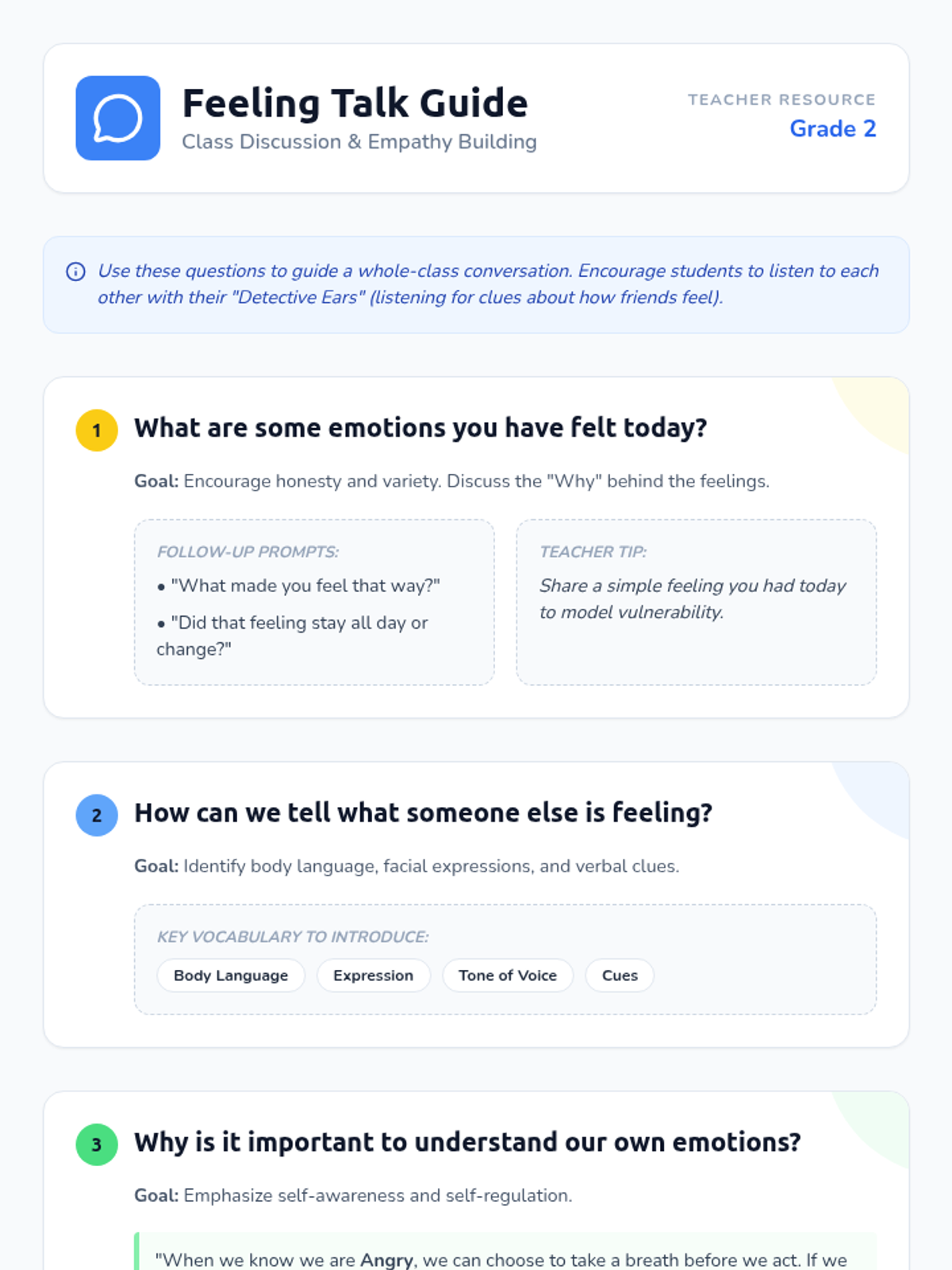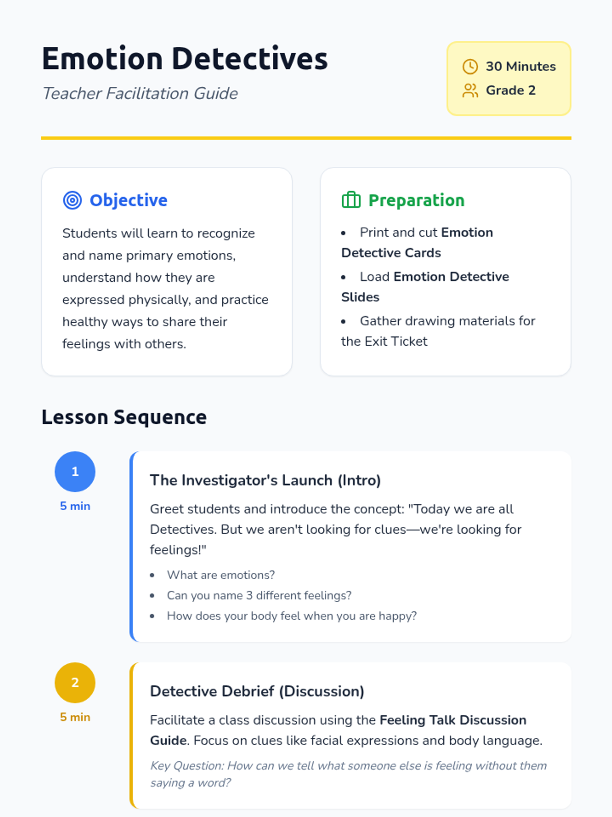 A Grade 2 lesson focused on identifying, understanding, and expressing emotions through role-play and discussion to build emotional intelligence.