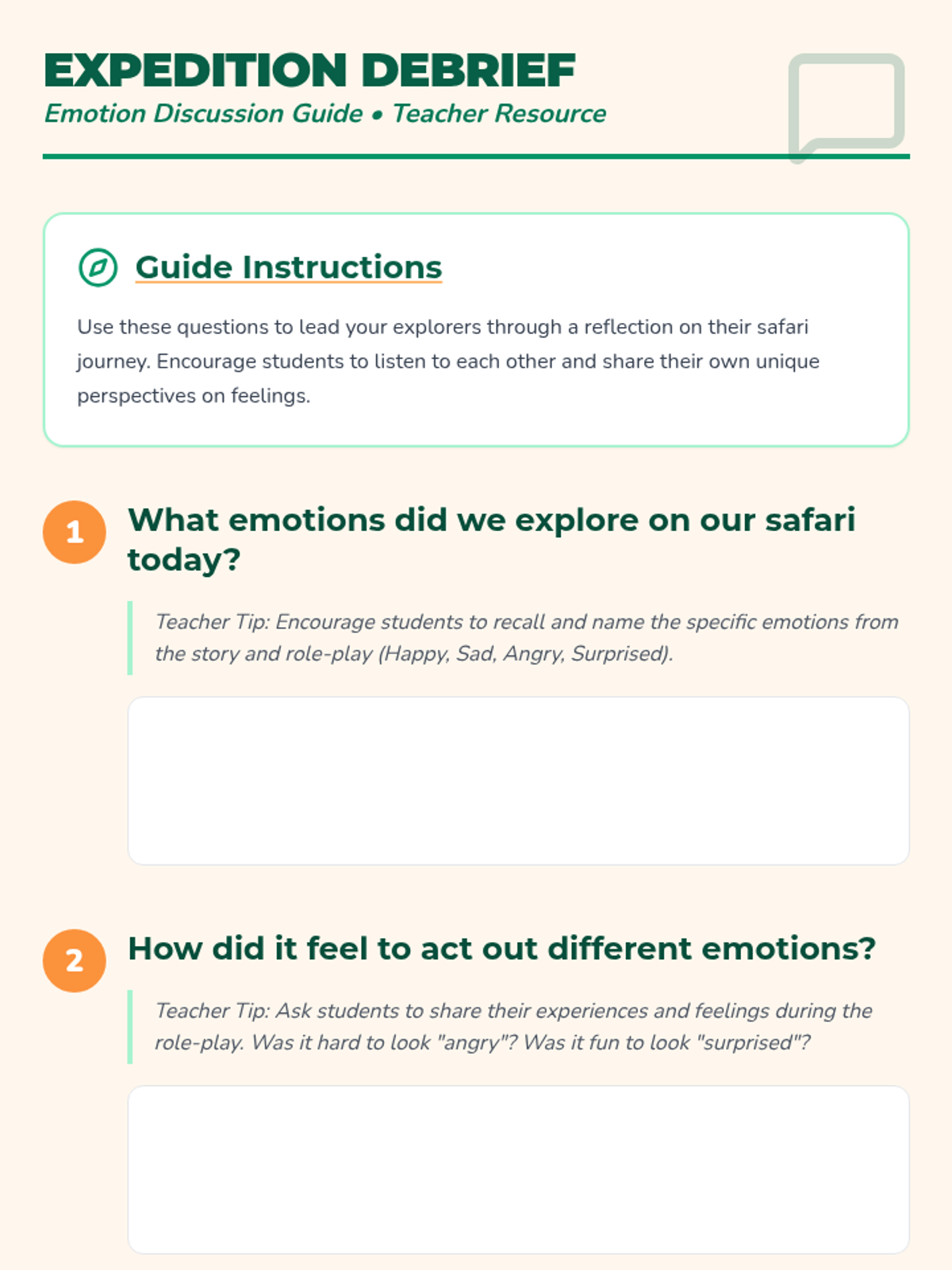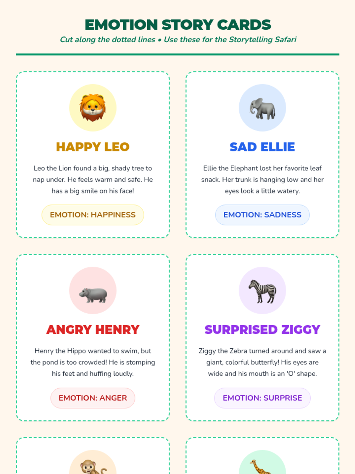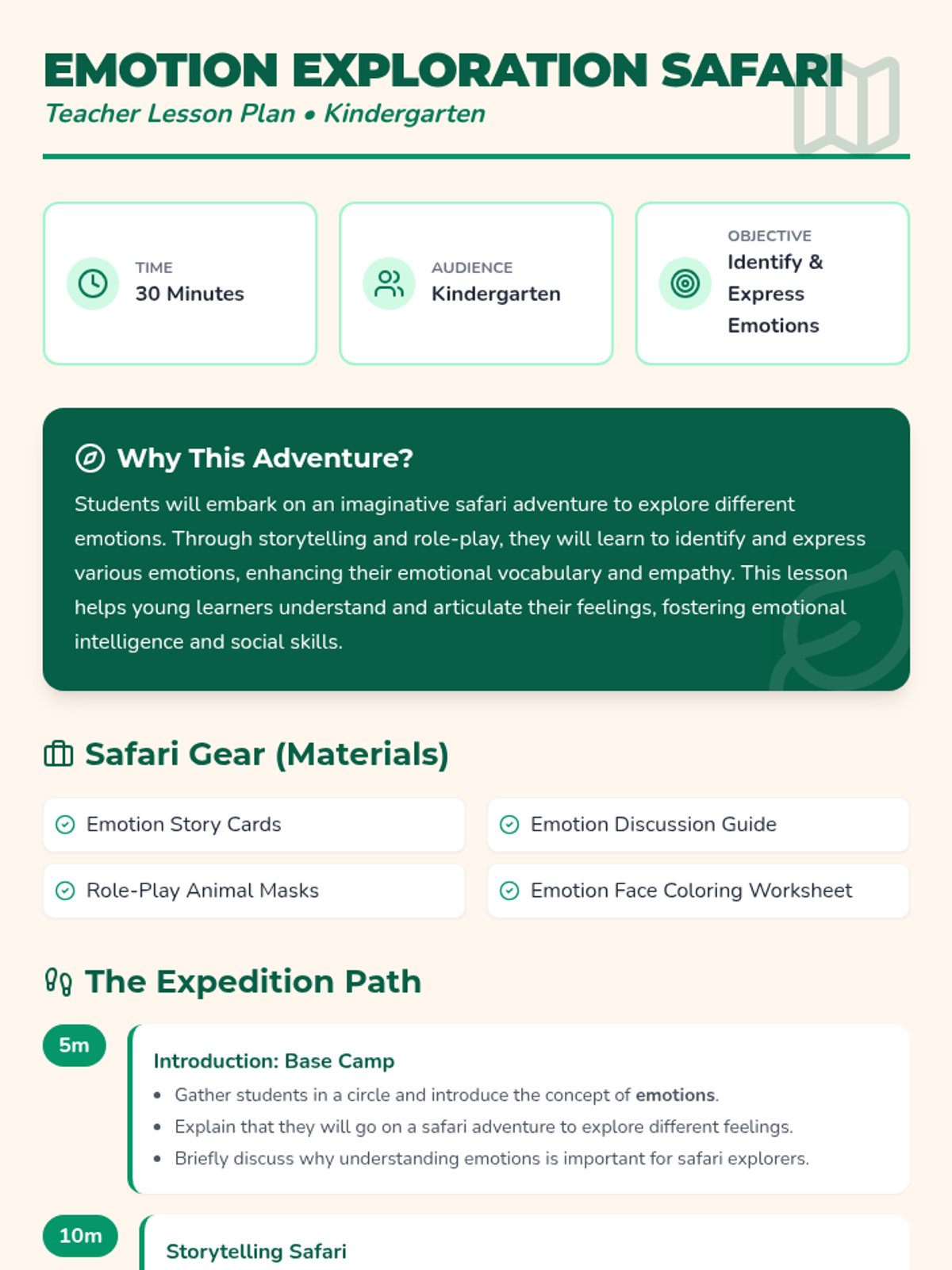 In this lesson, students will embark on an imaginative safari adventure to explore different emotions. Through storytelling and role-play, they will learn to identify and express various emotions, enhancing their emotional vocabulary and empathy.