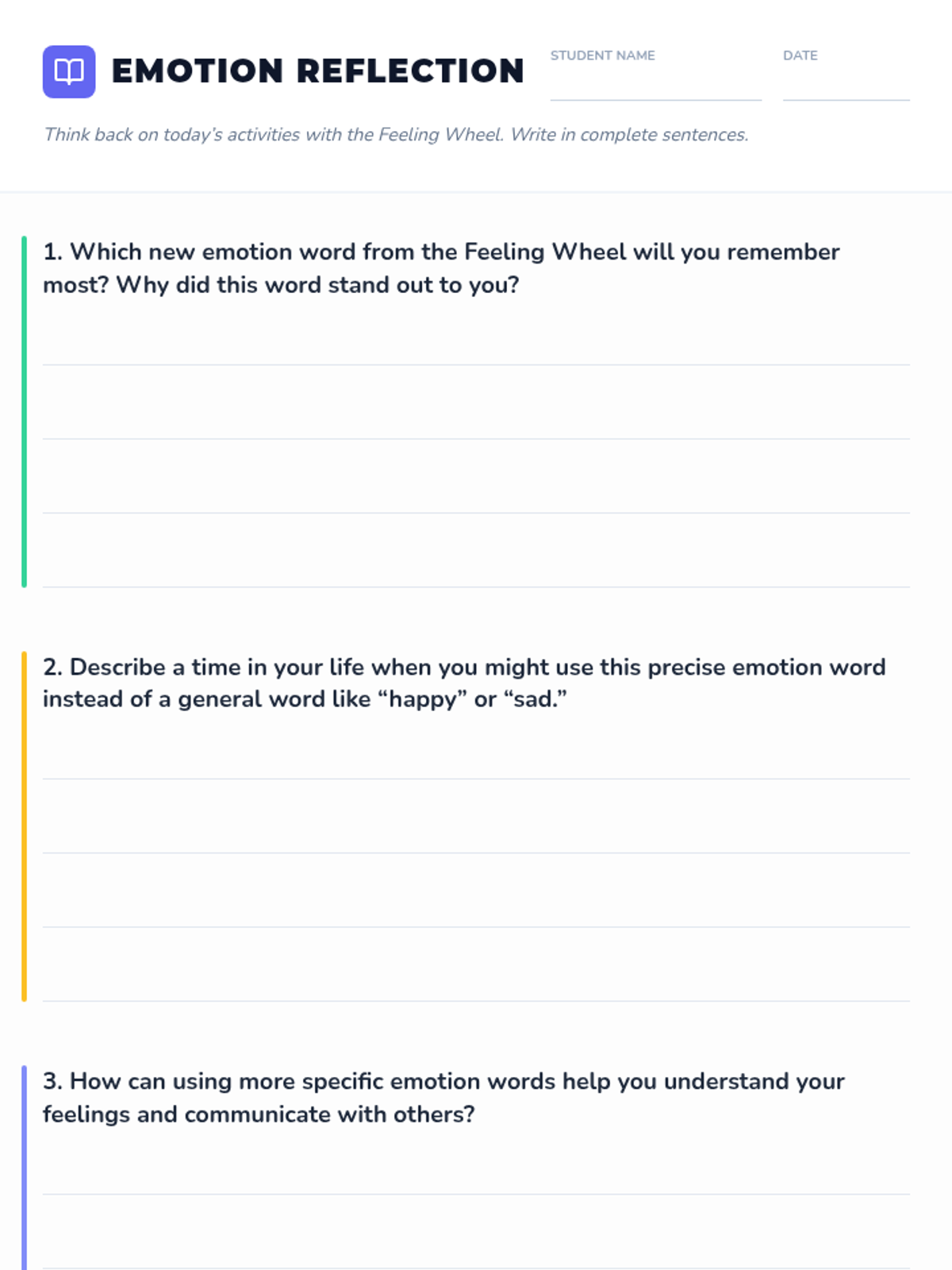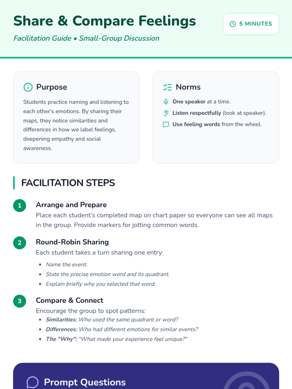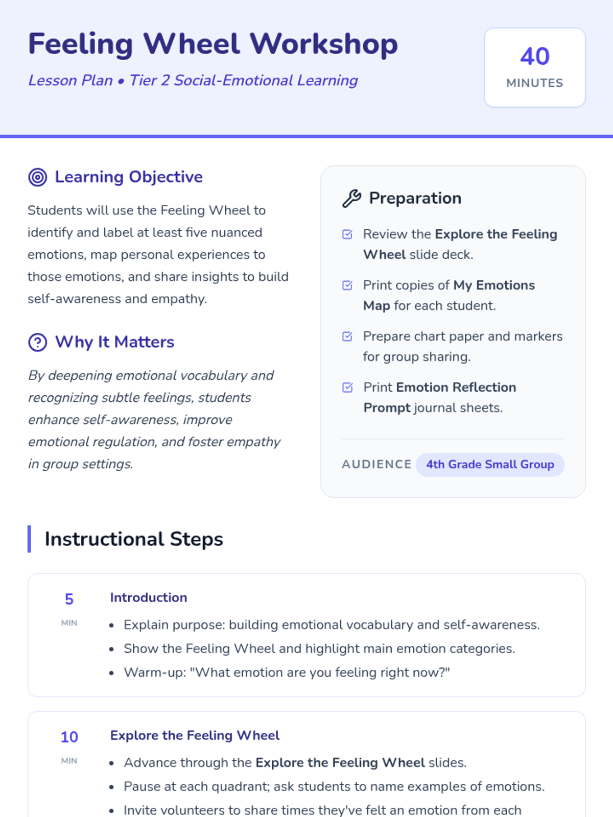 A 40-minute small-group session for 4th graders to expand their emotional vocabulary using a Feeling Wheel, mapping personal experiences to nuanced emotions.