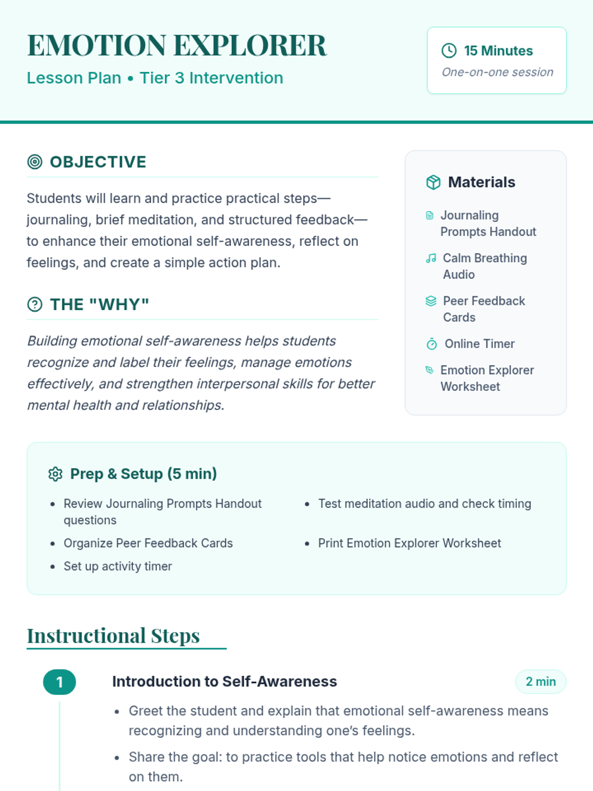 A 15-minute Tier 3 intervention for 6th graders to build emotional self-awareness through journaling, meditation, and structured feedback.