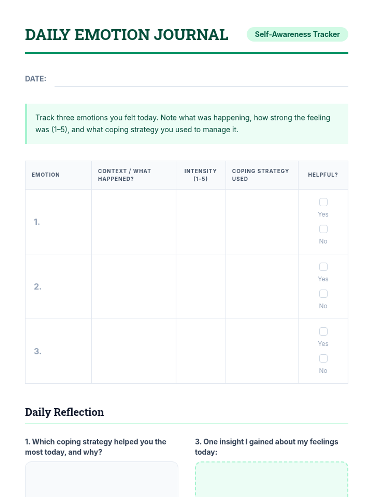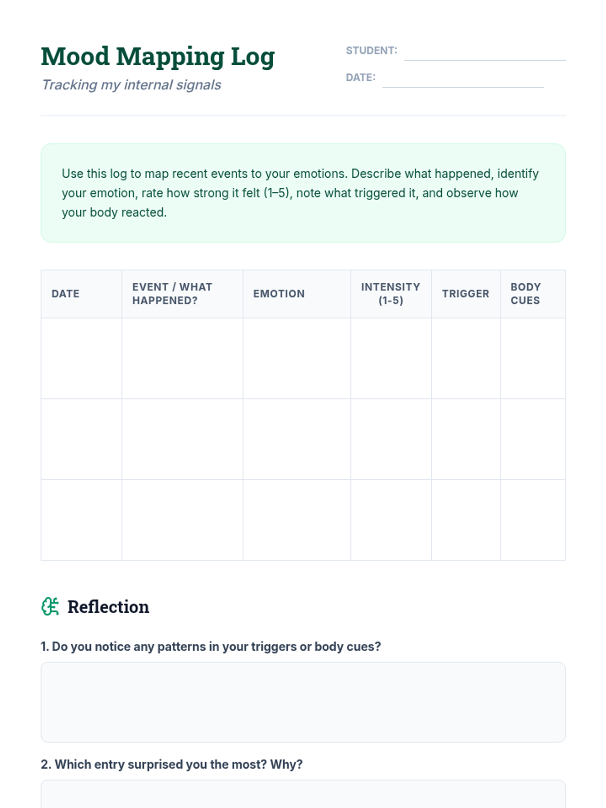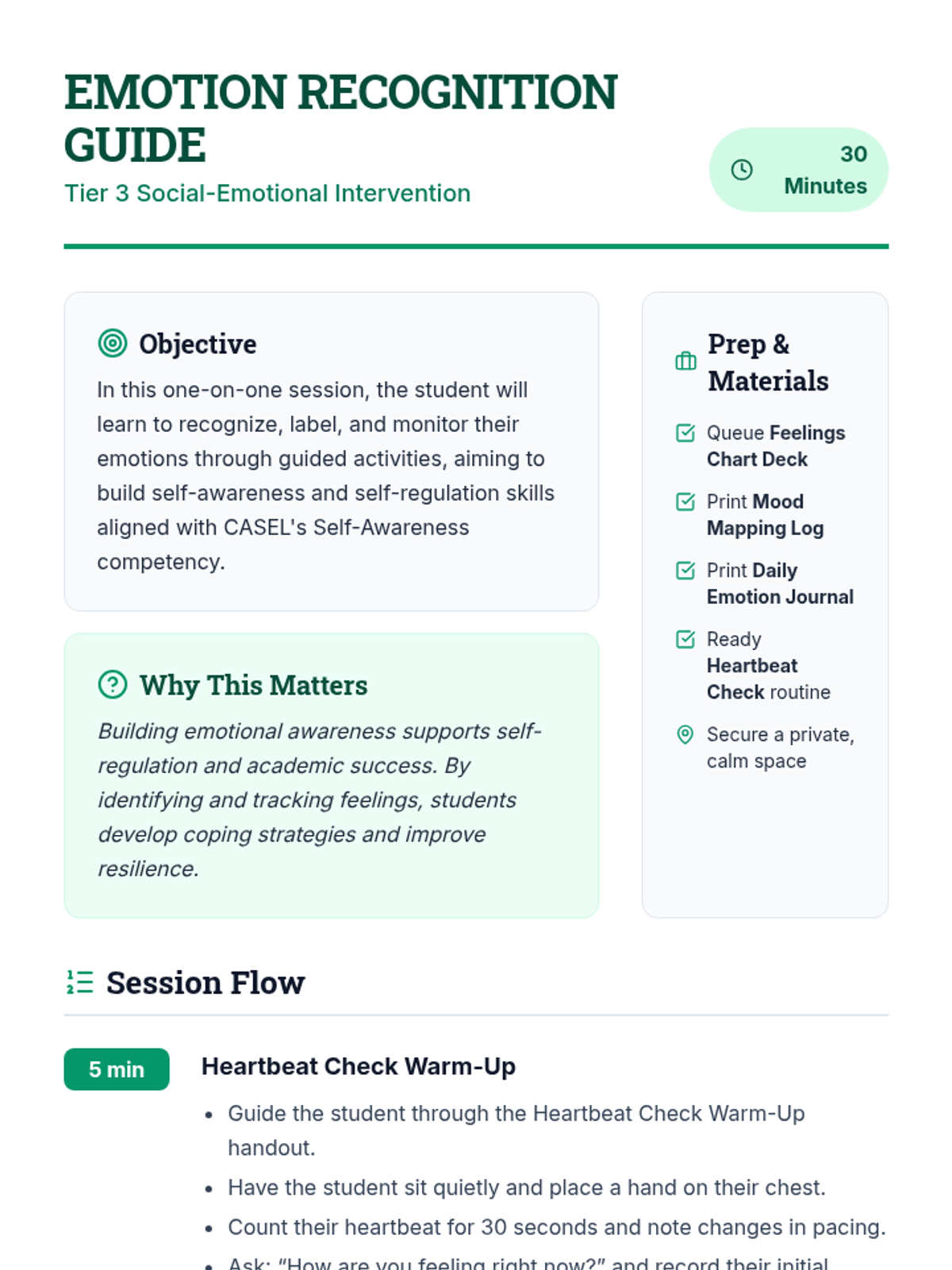 A 30-minute Tier 3 intervention for 8th graders to build self-awareness by recognizing, naming, and tracking emotions through guided activities.