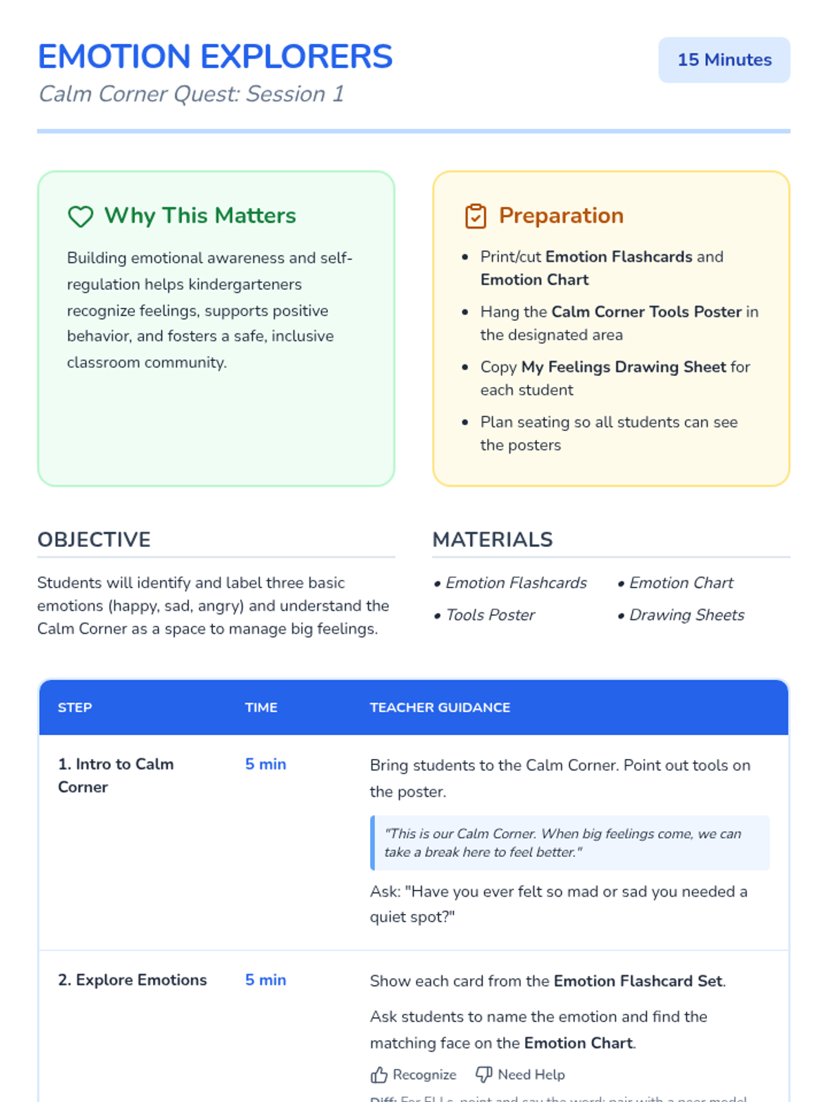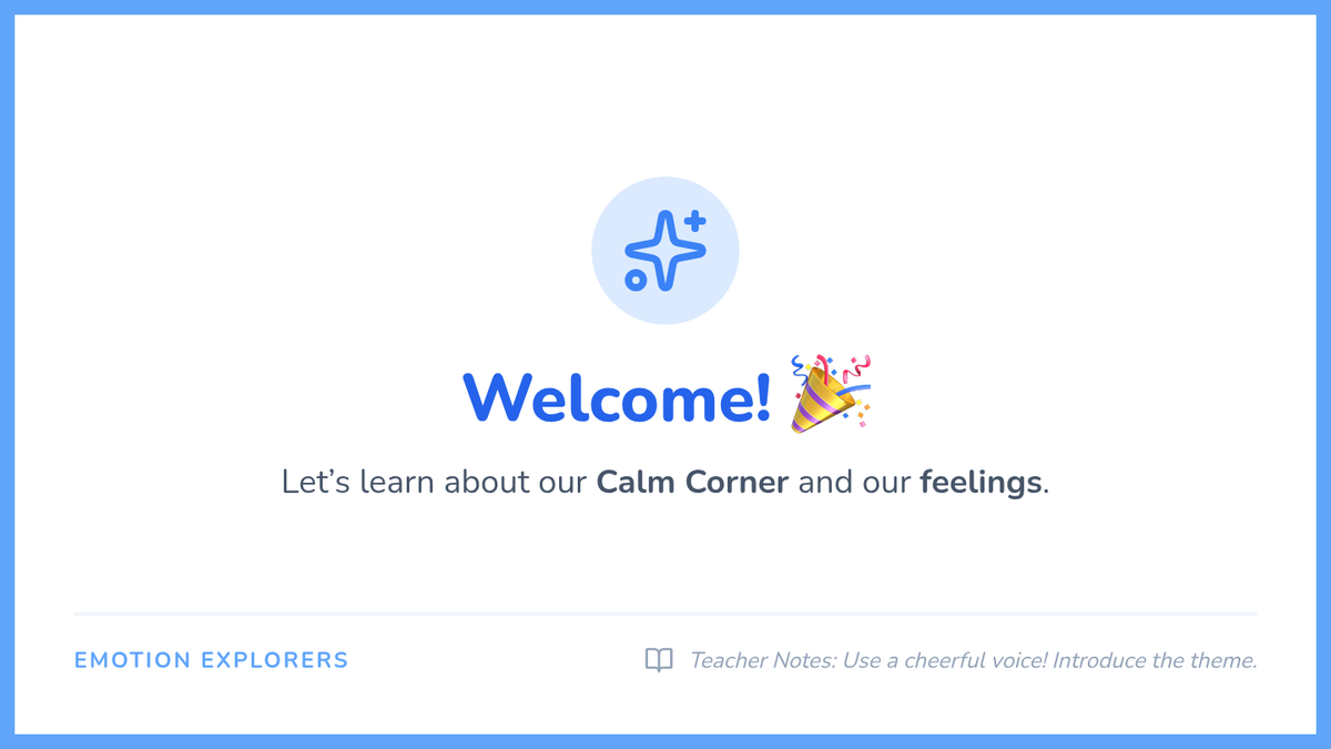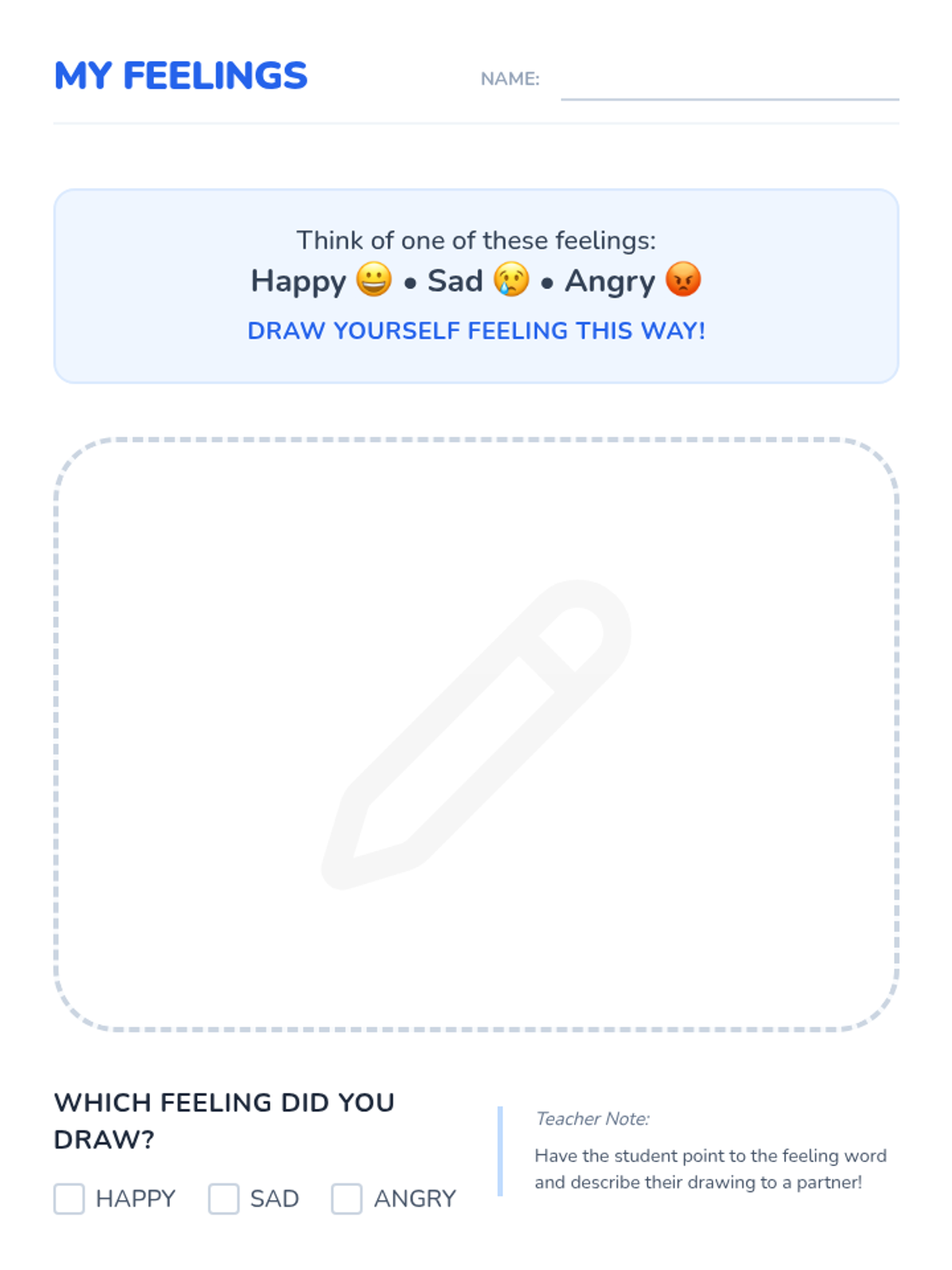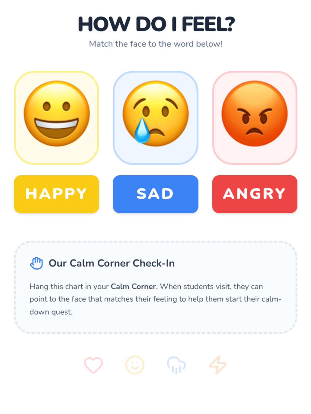Students will identify and label basic emotions (happy, sad, angry) and be introduced to the classroom Calm Corner as a safe space for managing feelings.