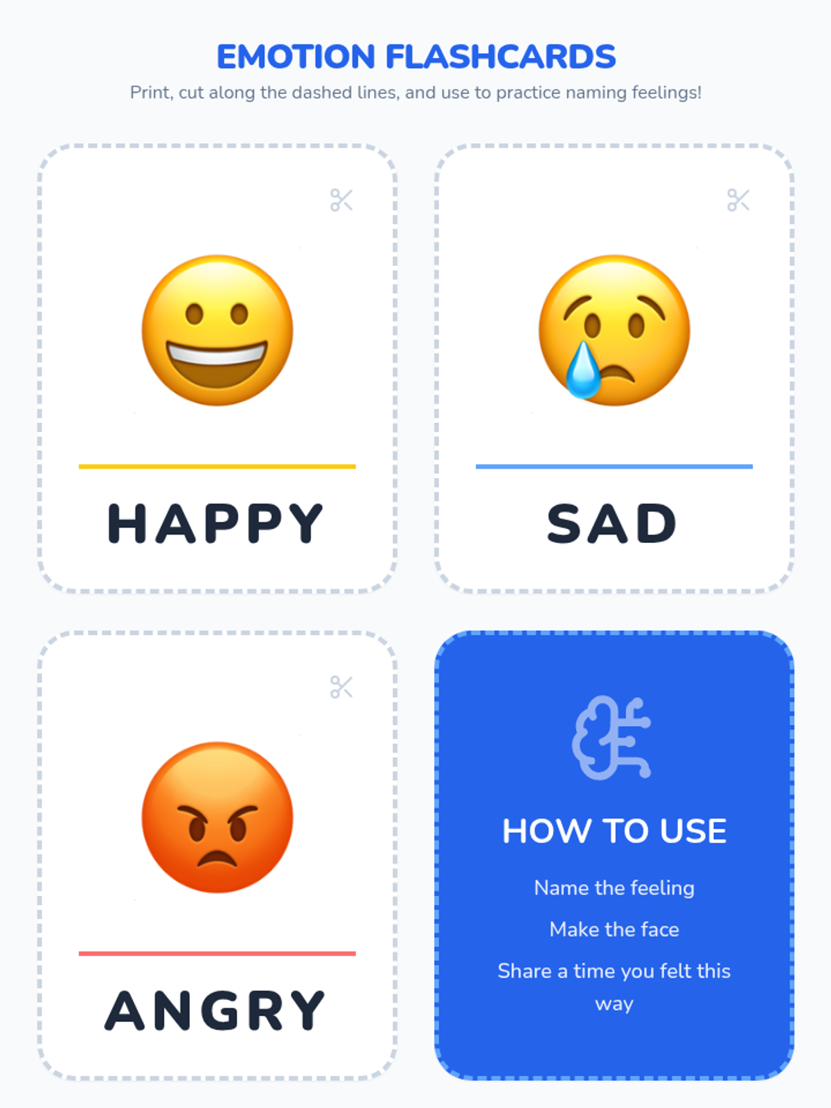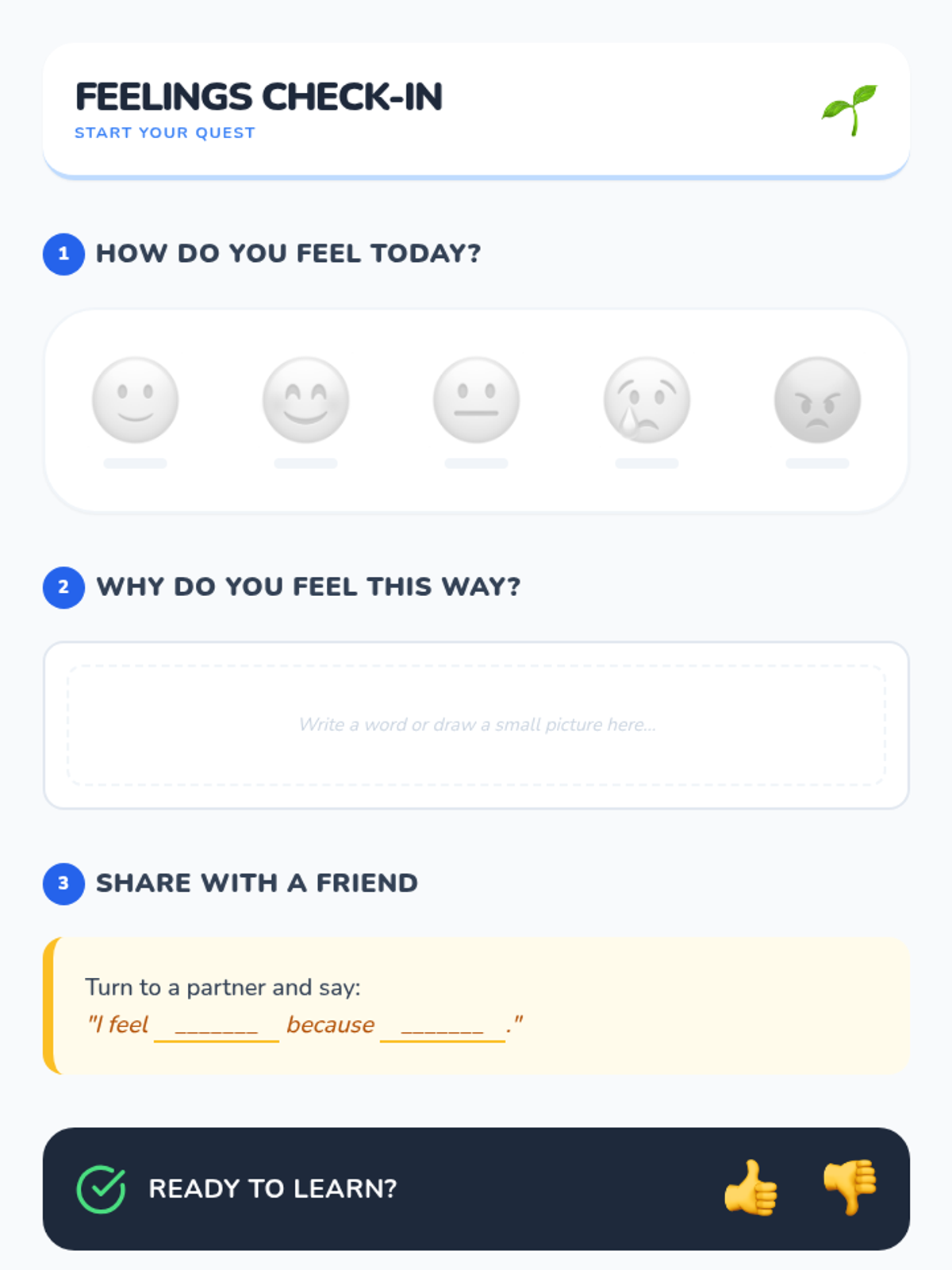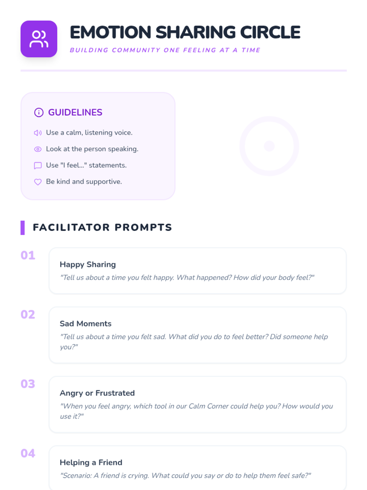 Students will identify and label basic emotions (happy, sad, angry) and be introduced to the classroom Calm Corner as a safe space for managing feelings.