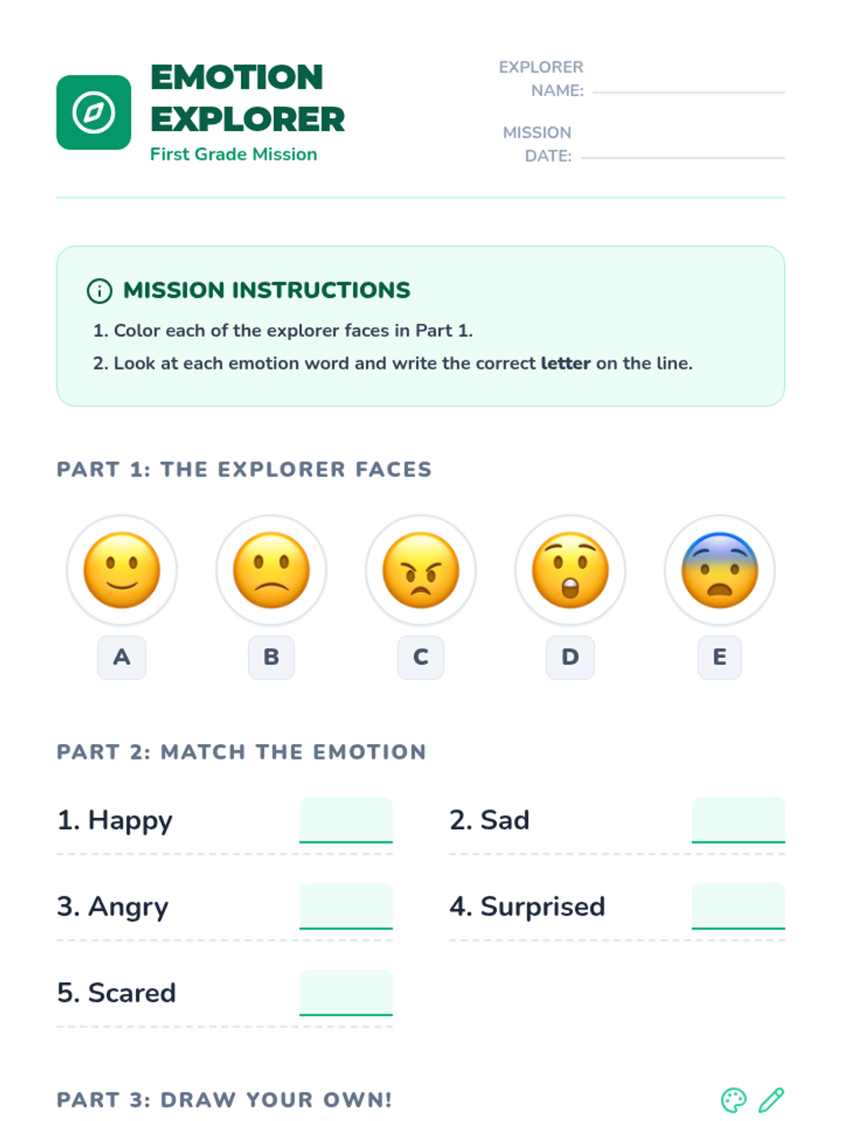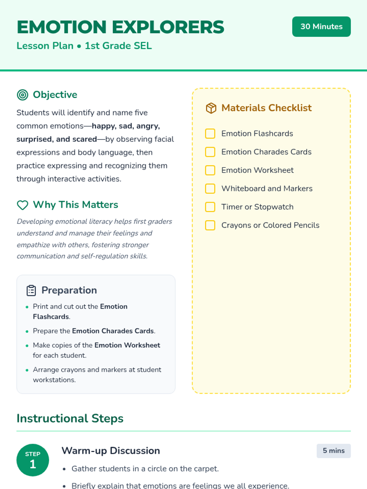 In this engaging 30-minute lesson, first graders learn to identify and name common emotions by observing facial expressions and body language through interactive games and creative work.