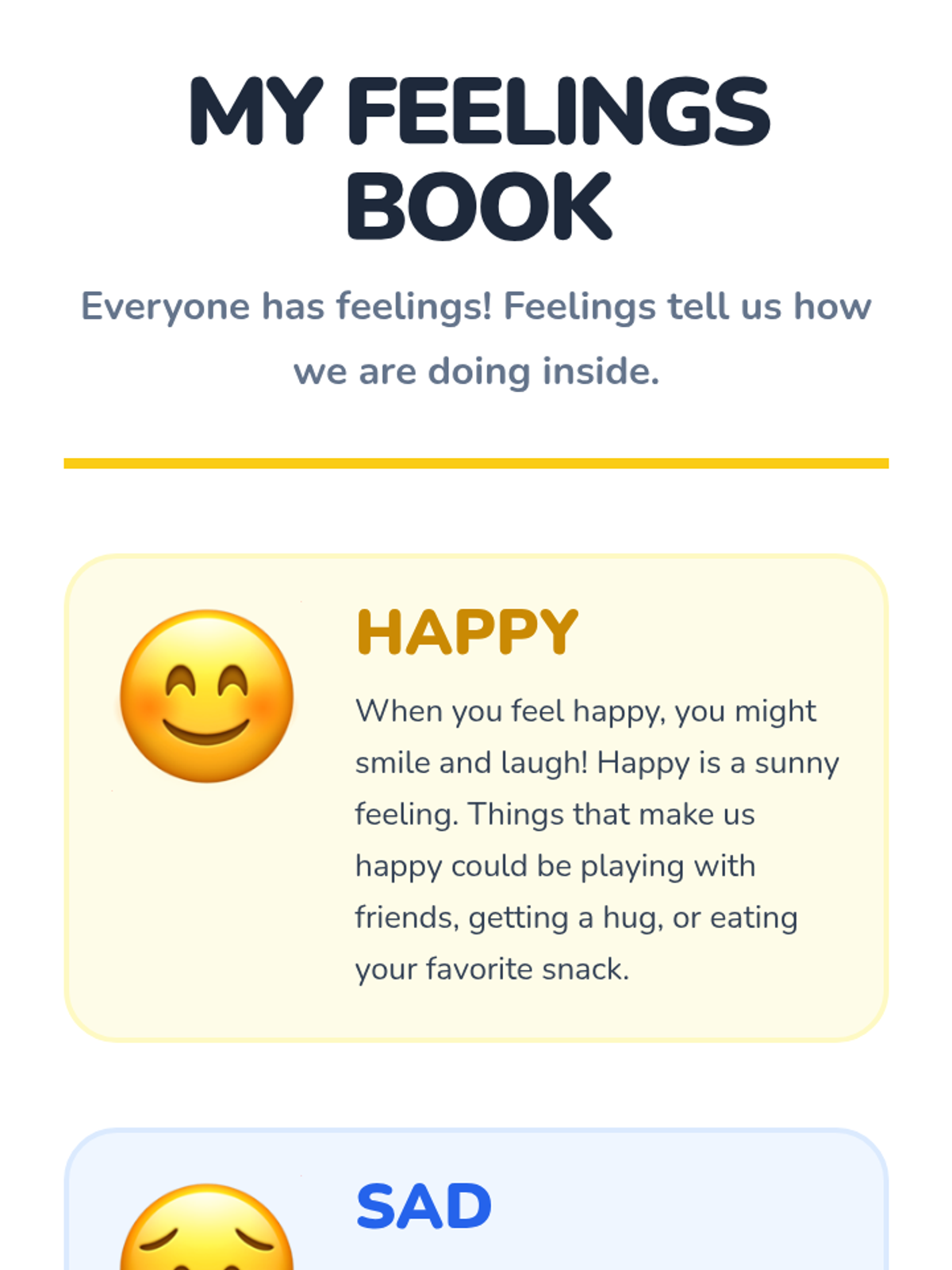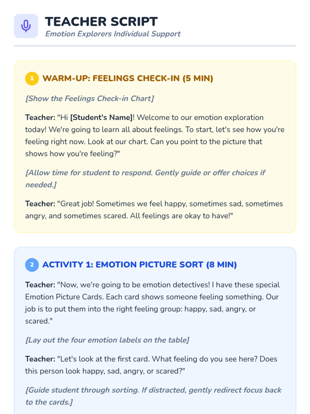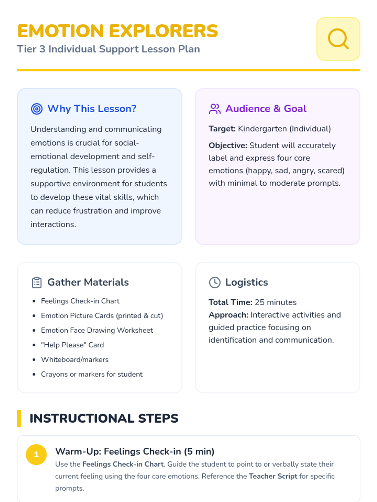 A 25-minute Tier 3 individual lesson for kindergarteners to identify and express four core emotions (happy, sad, angry, scared) through interactive activities and guided practice.