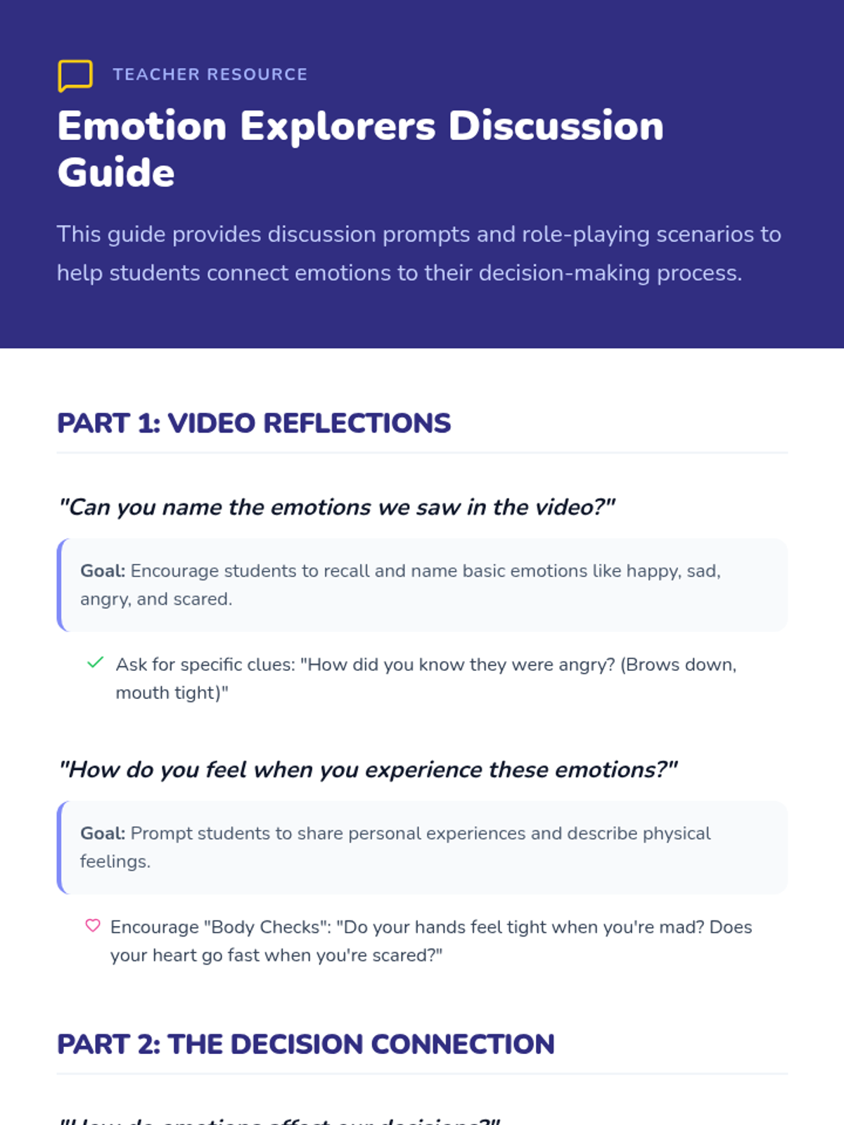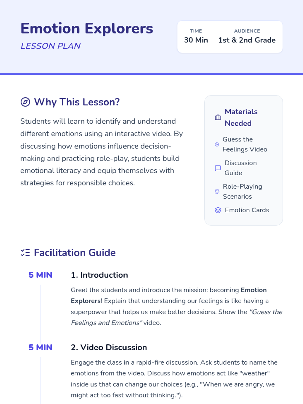 A lesson for 1st and 2nd graders to identify emotions and understand how they influence decision-making through videos, role-playing, and discussion.