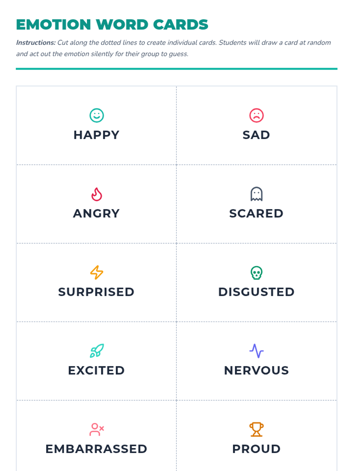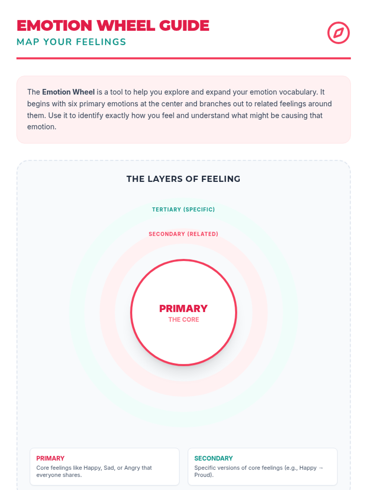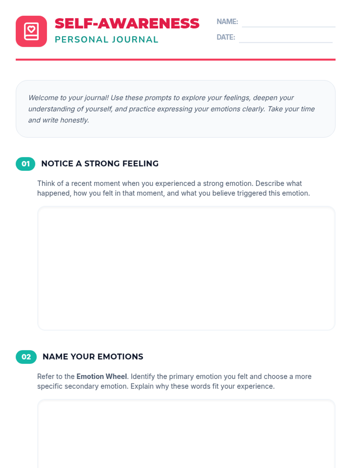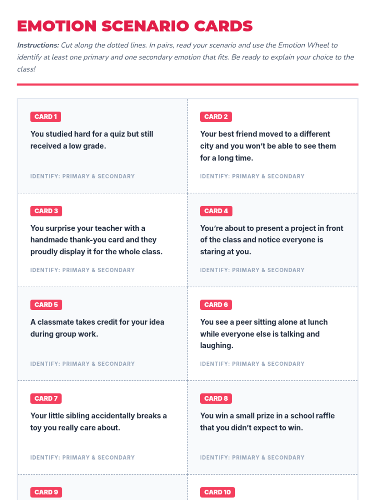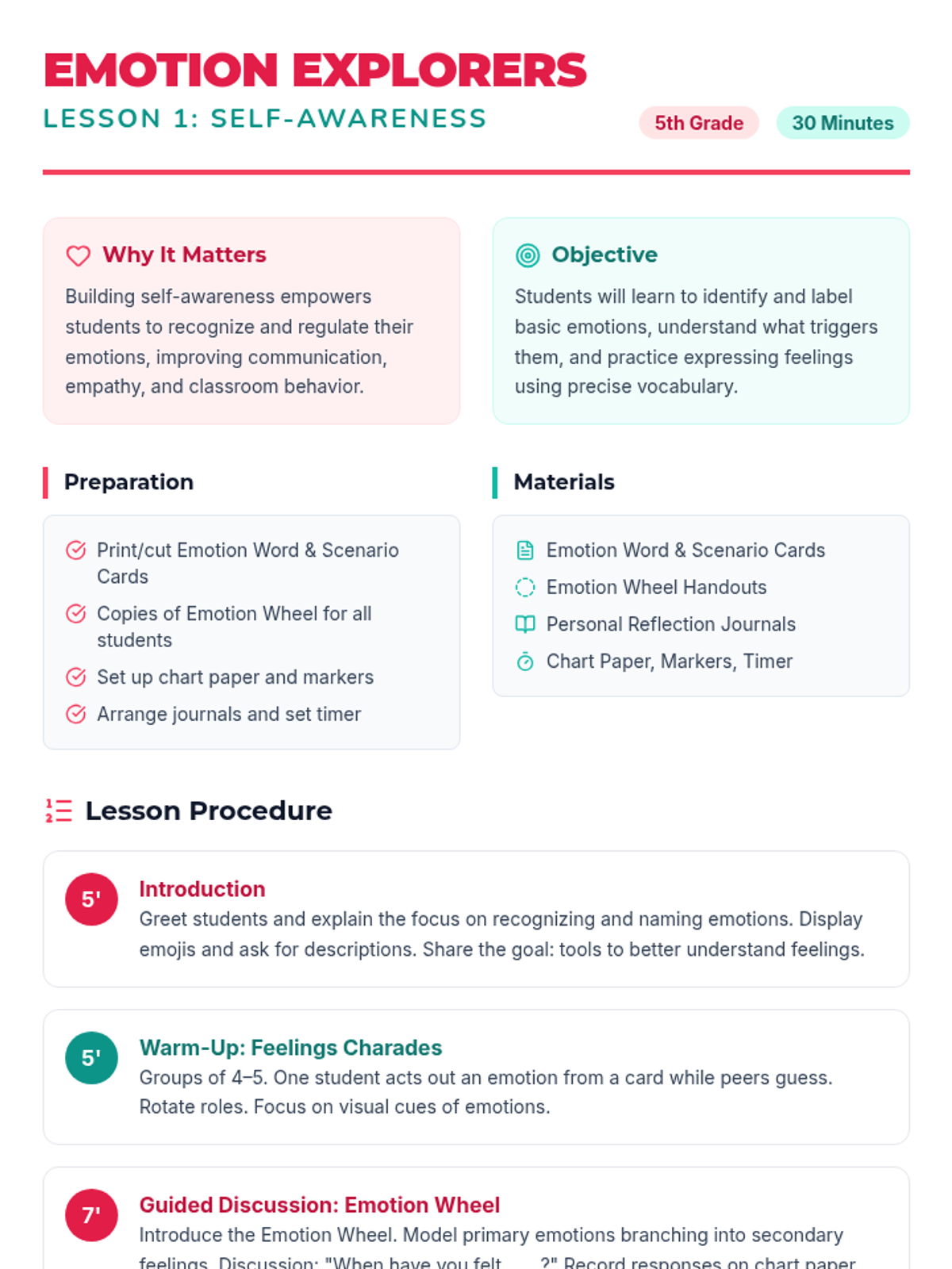 Students learn to identify and label basic emotions, understand triggers, and expand their emotional vocabulary using the Emotion Wheel. Activities include charades and scenario analysis.