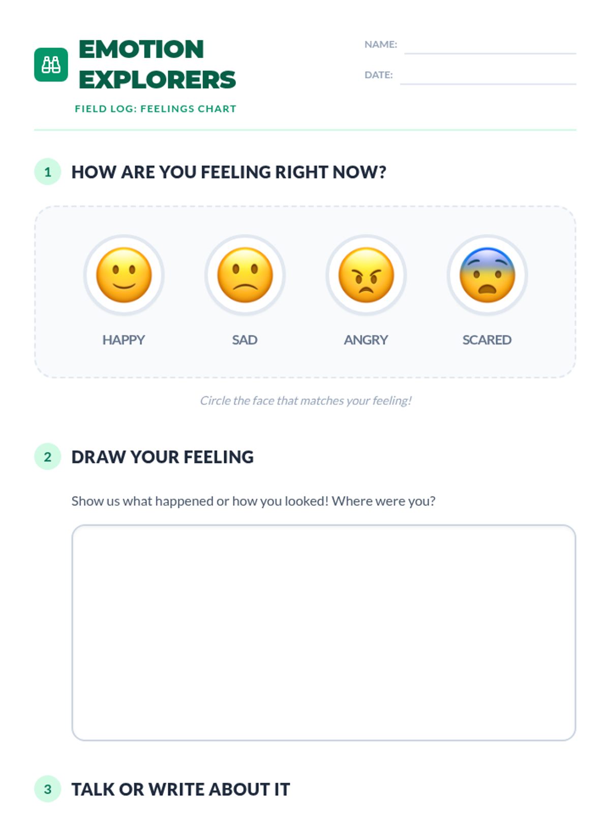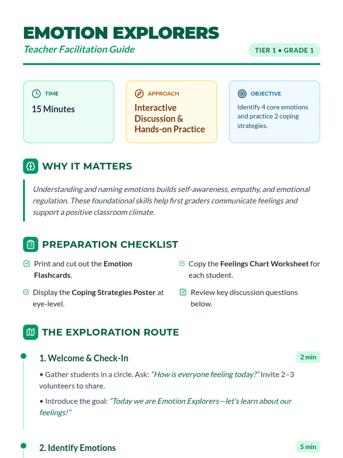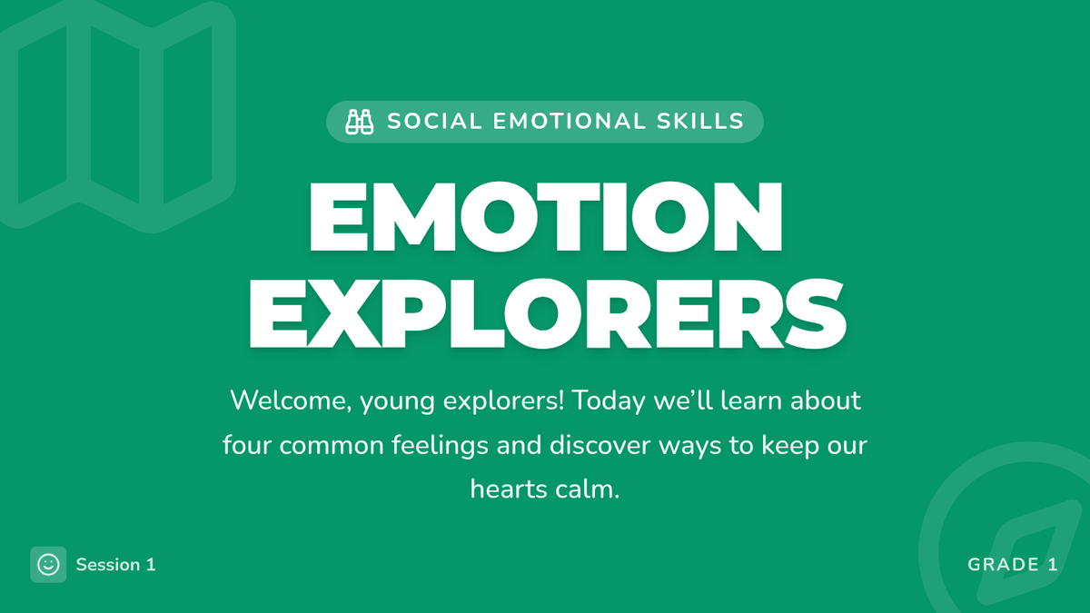 A 15-minute foundational social-emotional lesson for 1st graders to identify emotions (happy, sad, angry, scared) and learn simple coping strategies.