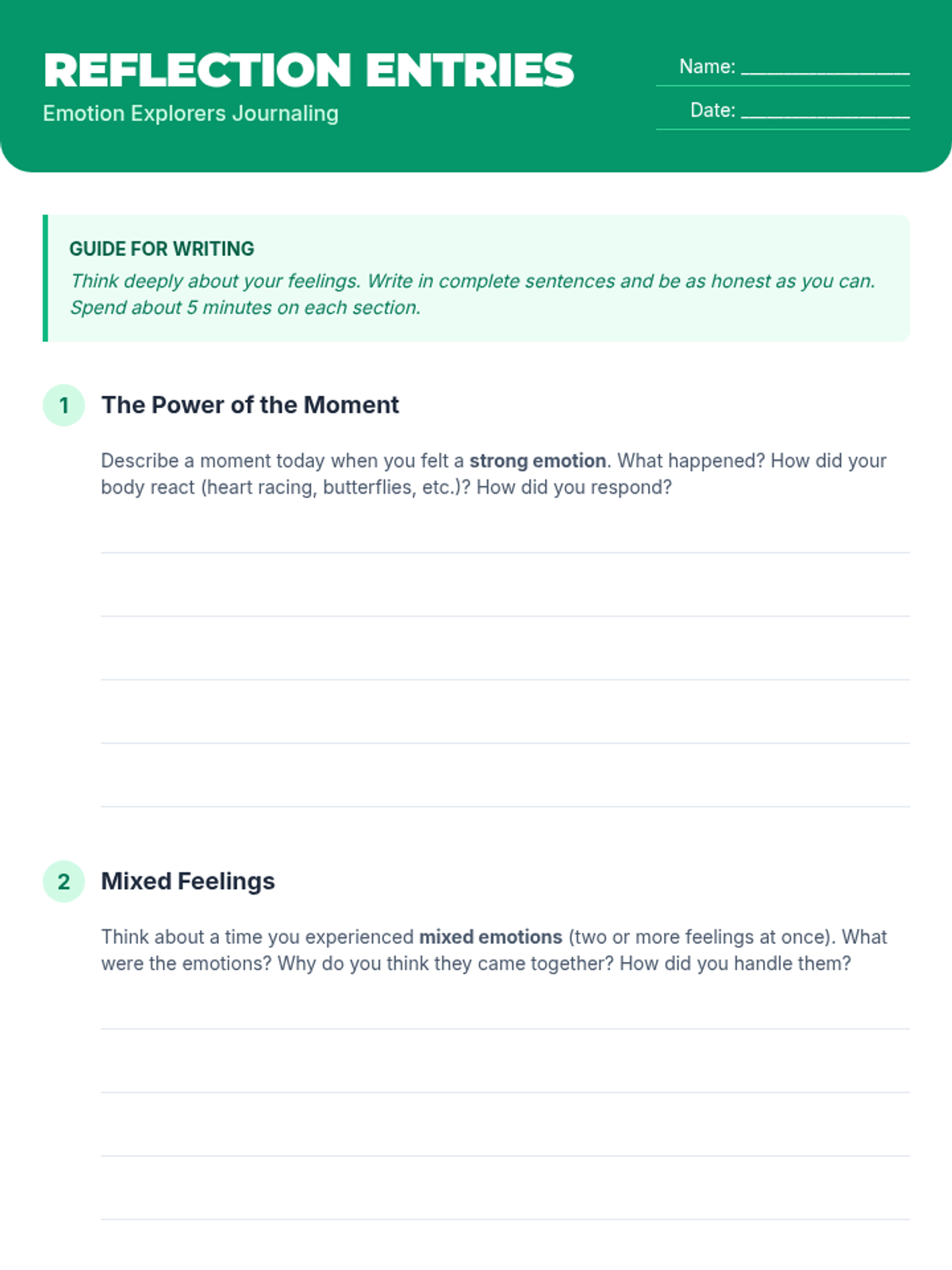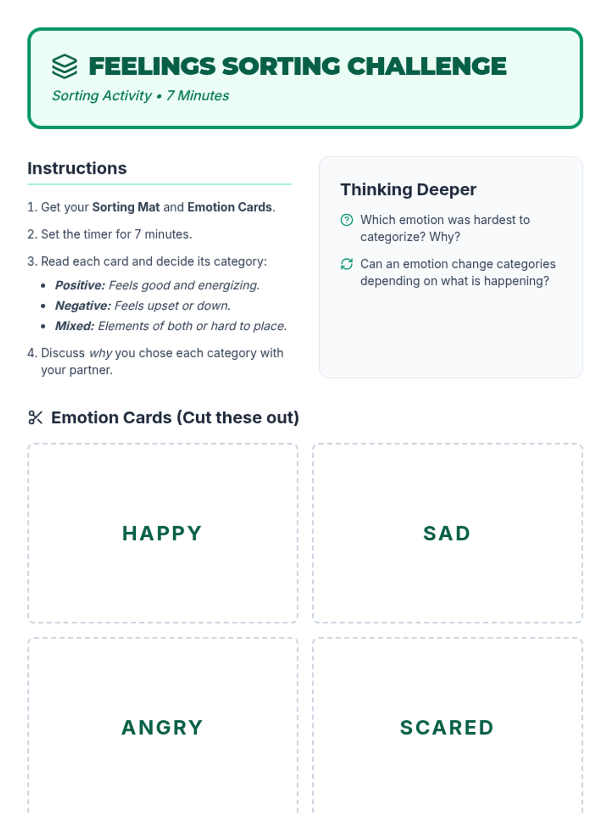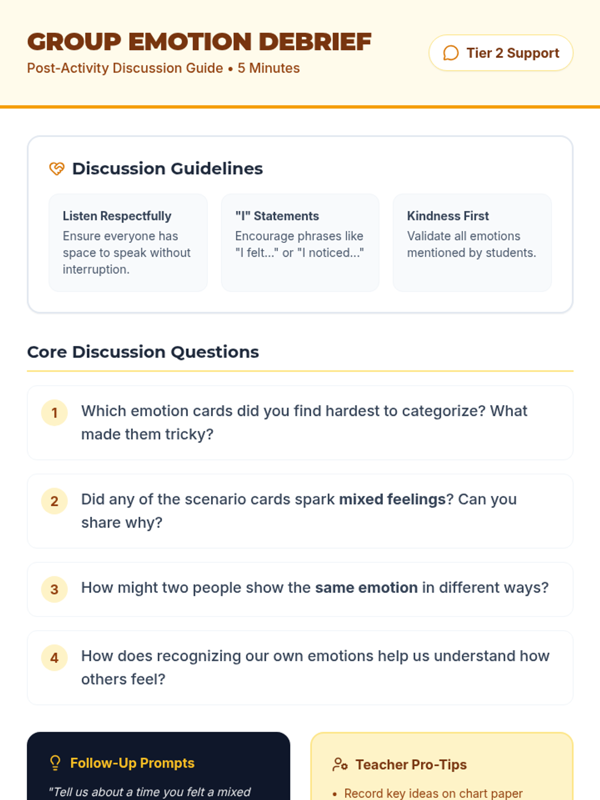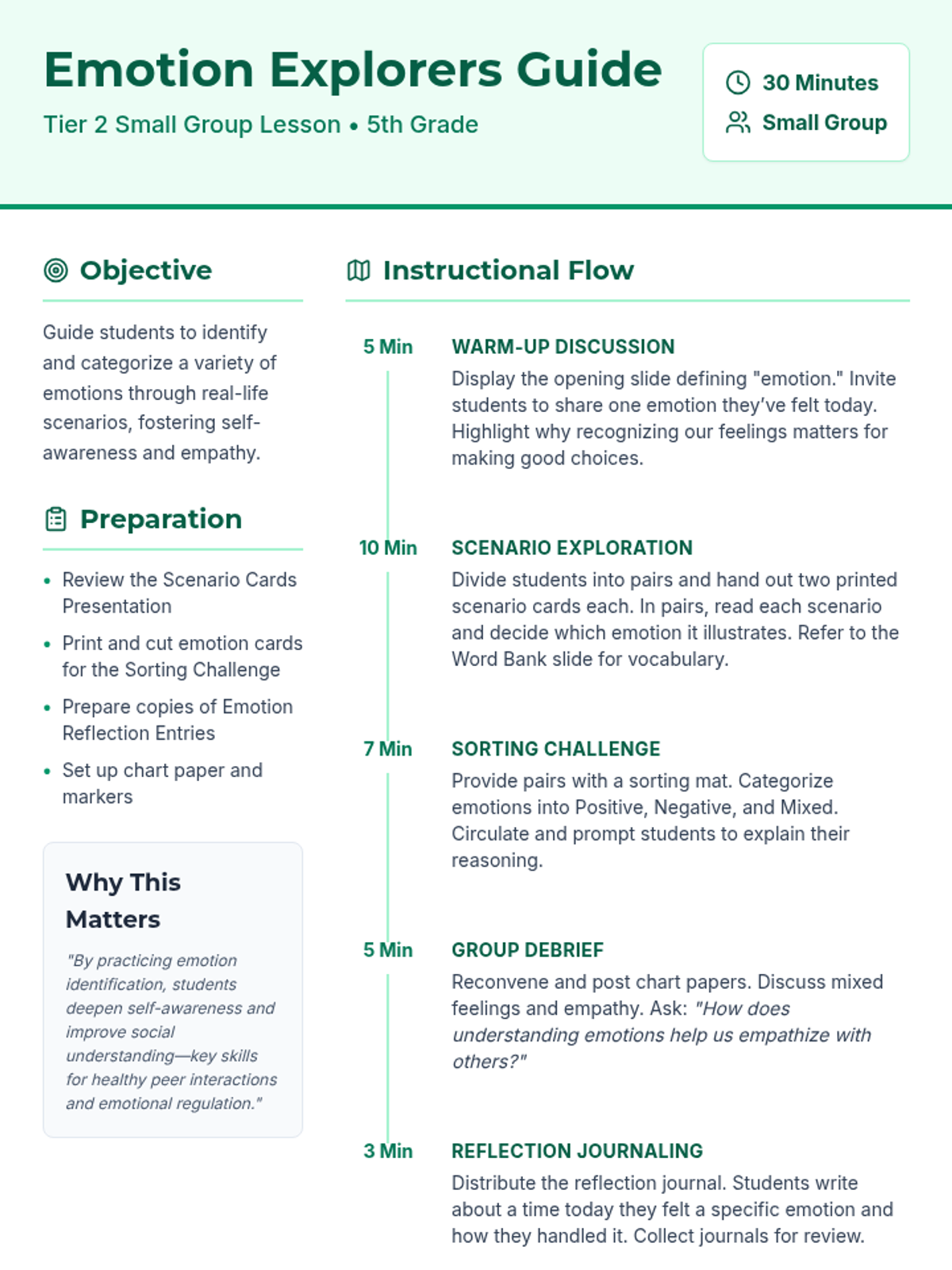 A small-group Tier 2 lesson for 5th graders focused on identifying and categorizing emotions through real-life scenarios, sorting activities, and reflective journaling.