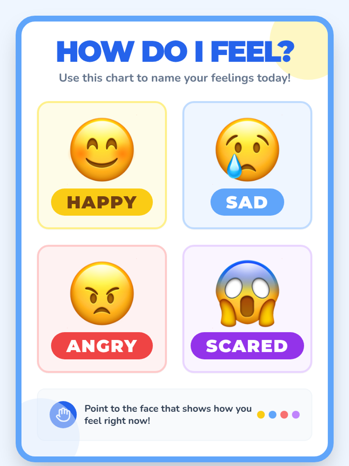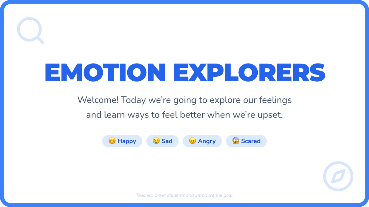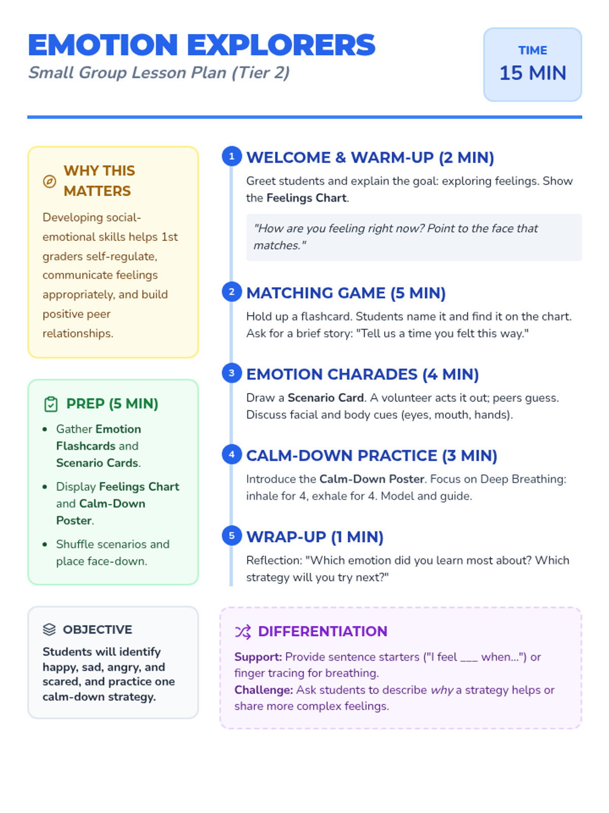 A 15-minute small group lesson for 1st graders to identify basic emotions (happy, sad, angry, scared) and practice foundational self-regulation strategies.