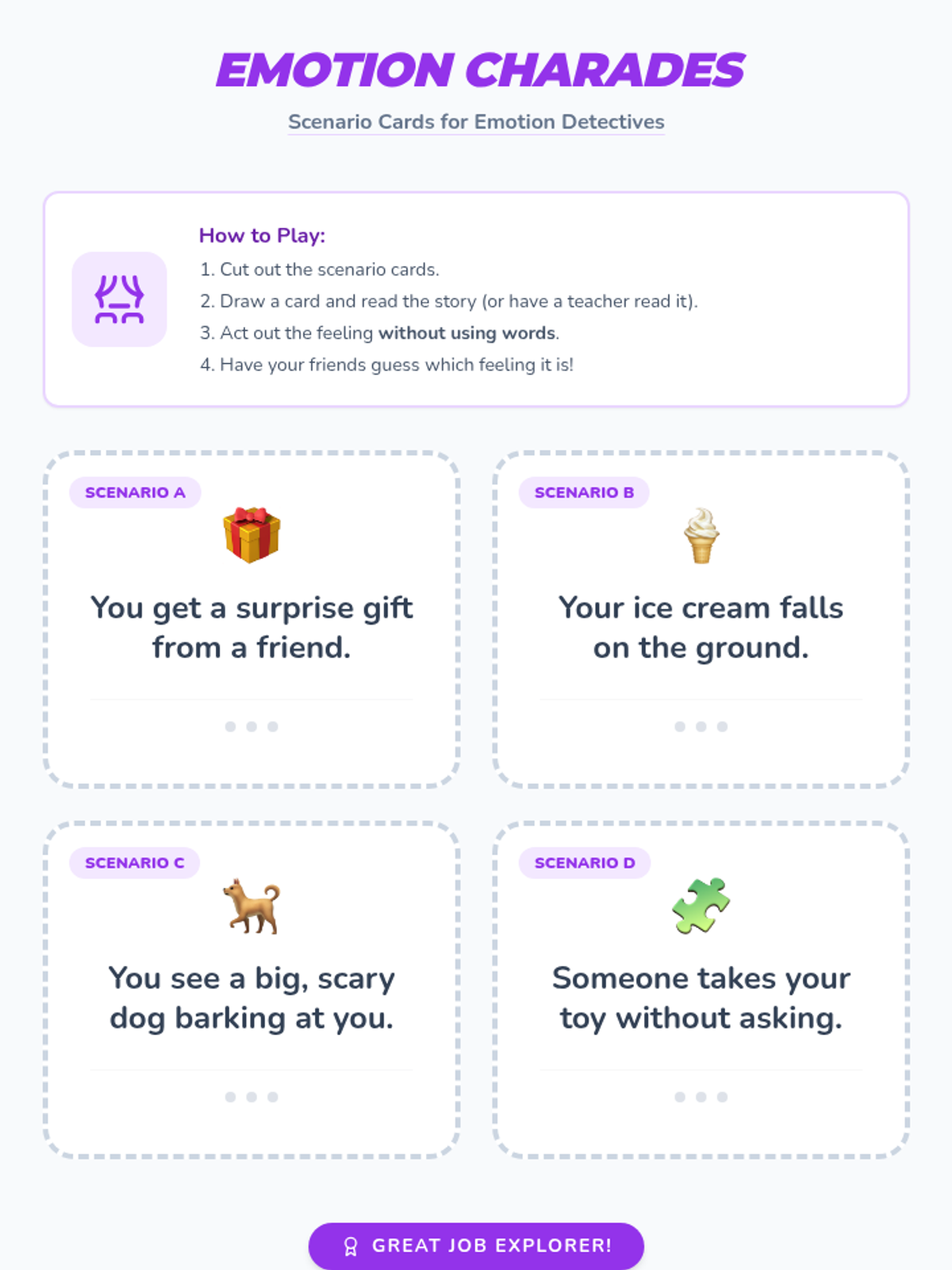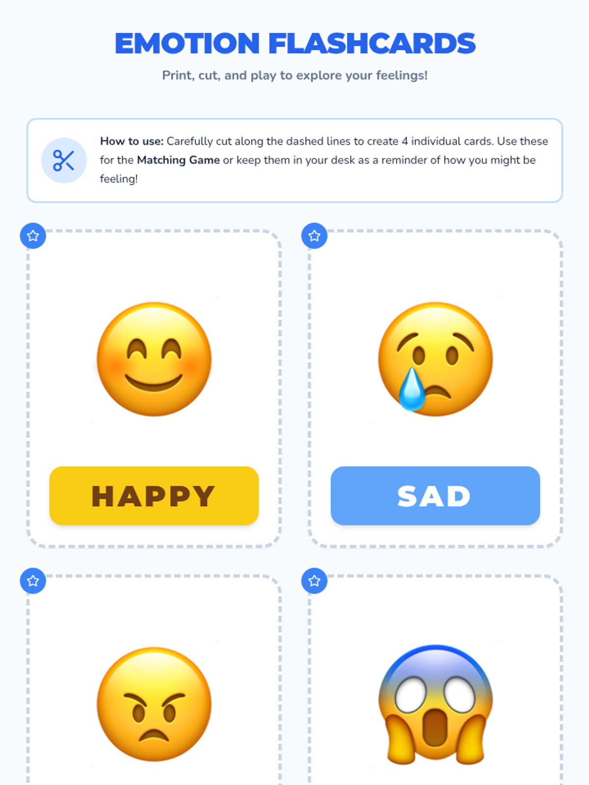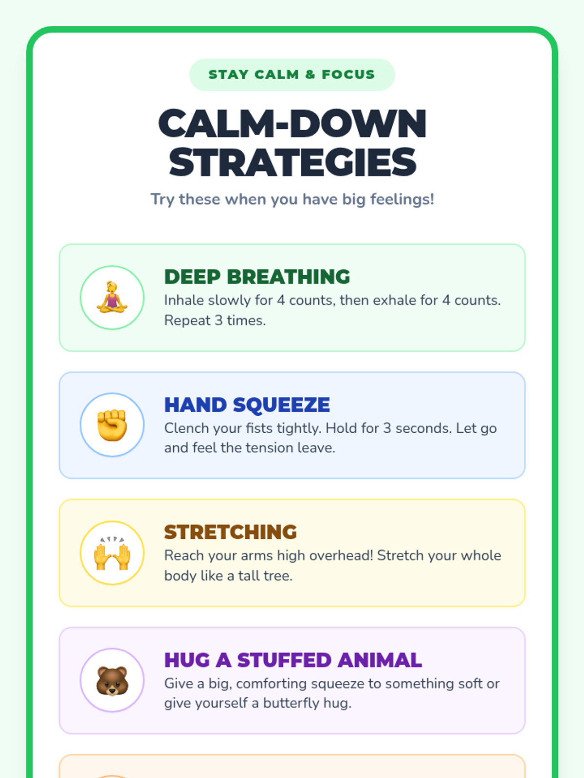 A 15-minute small group lesson for 1st graders to identify basic emotions (happy, sad, angry, scared) and practice foundational self-regulation strategies.