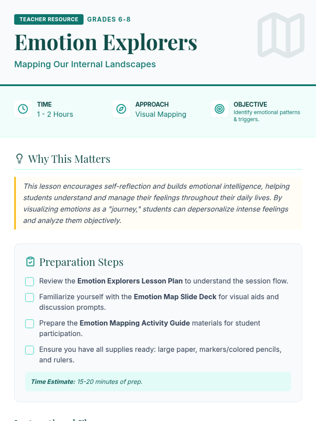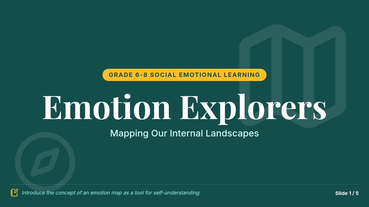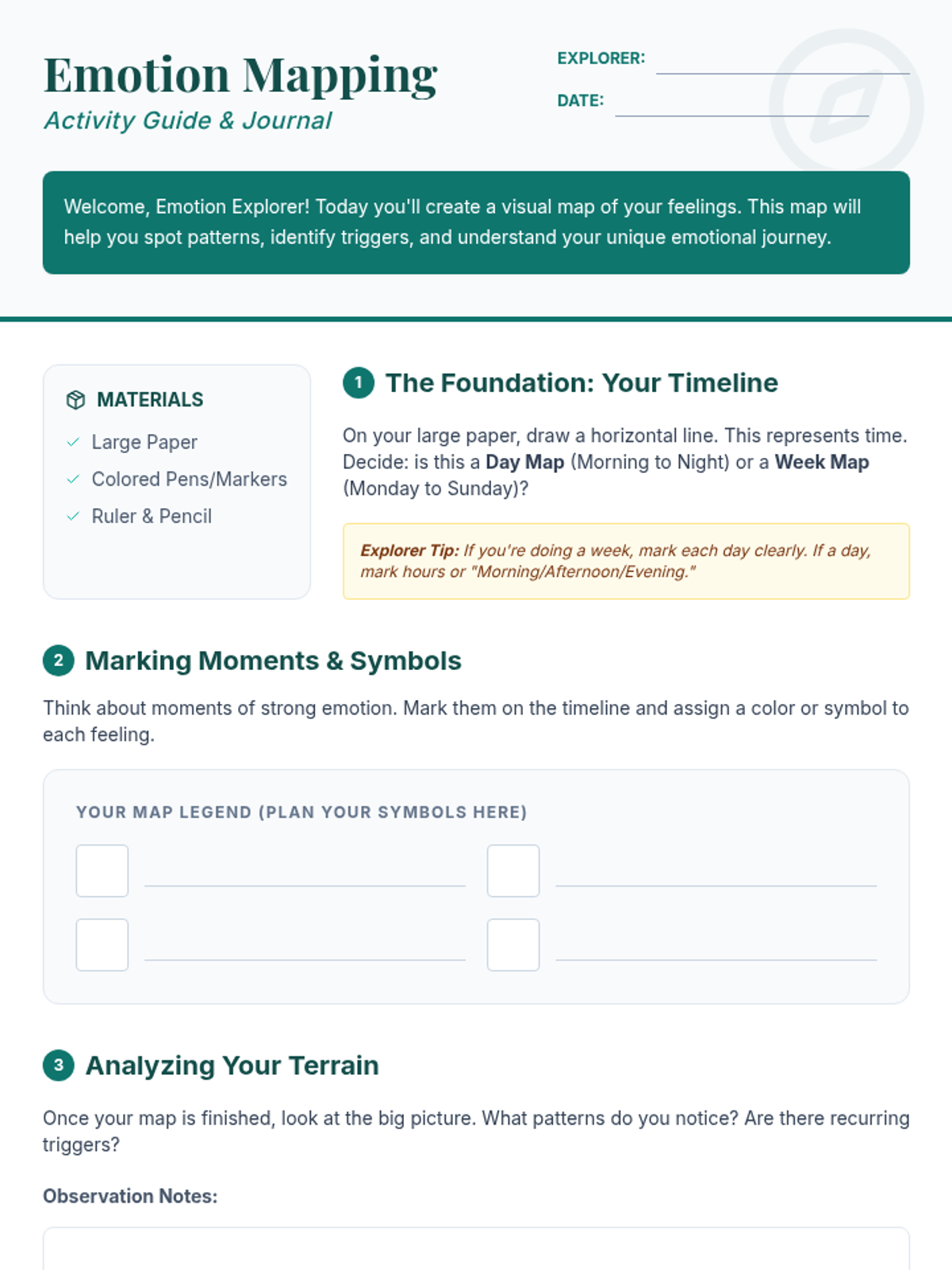 Students explore their emotional landscape by creating visual 'emotion maps' to identify patterns, triggers, and regulation strategies.