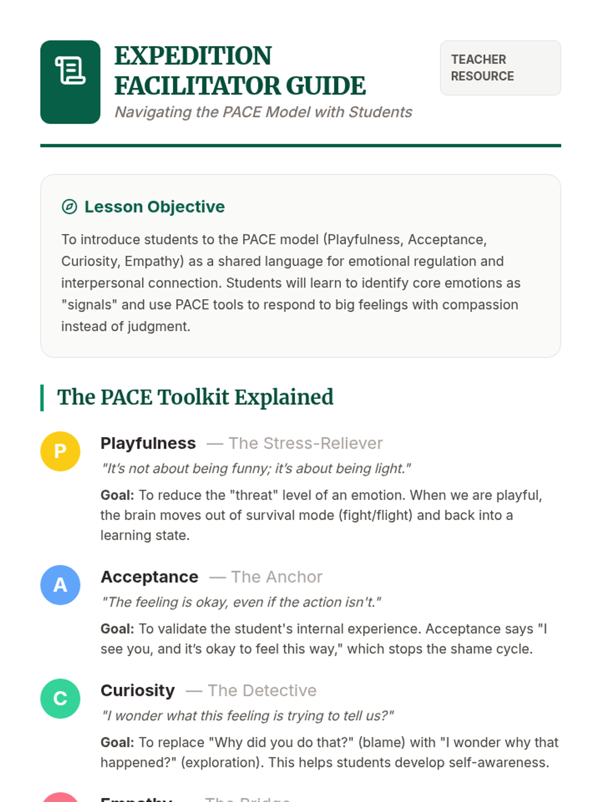A lesson exploring the spectrum of human emotions and introducing the PACE model (Playfulness, Acceptance, Curiosity, Empathy) as a tool for emotional regulation and connection.