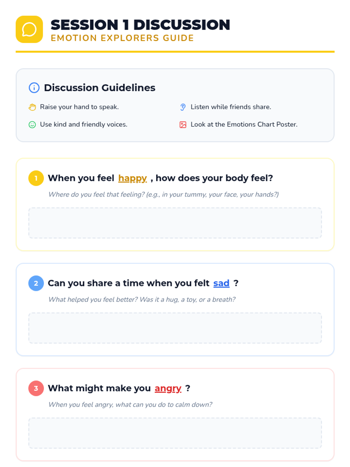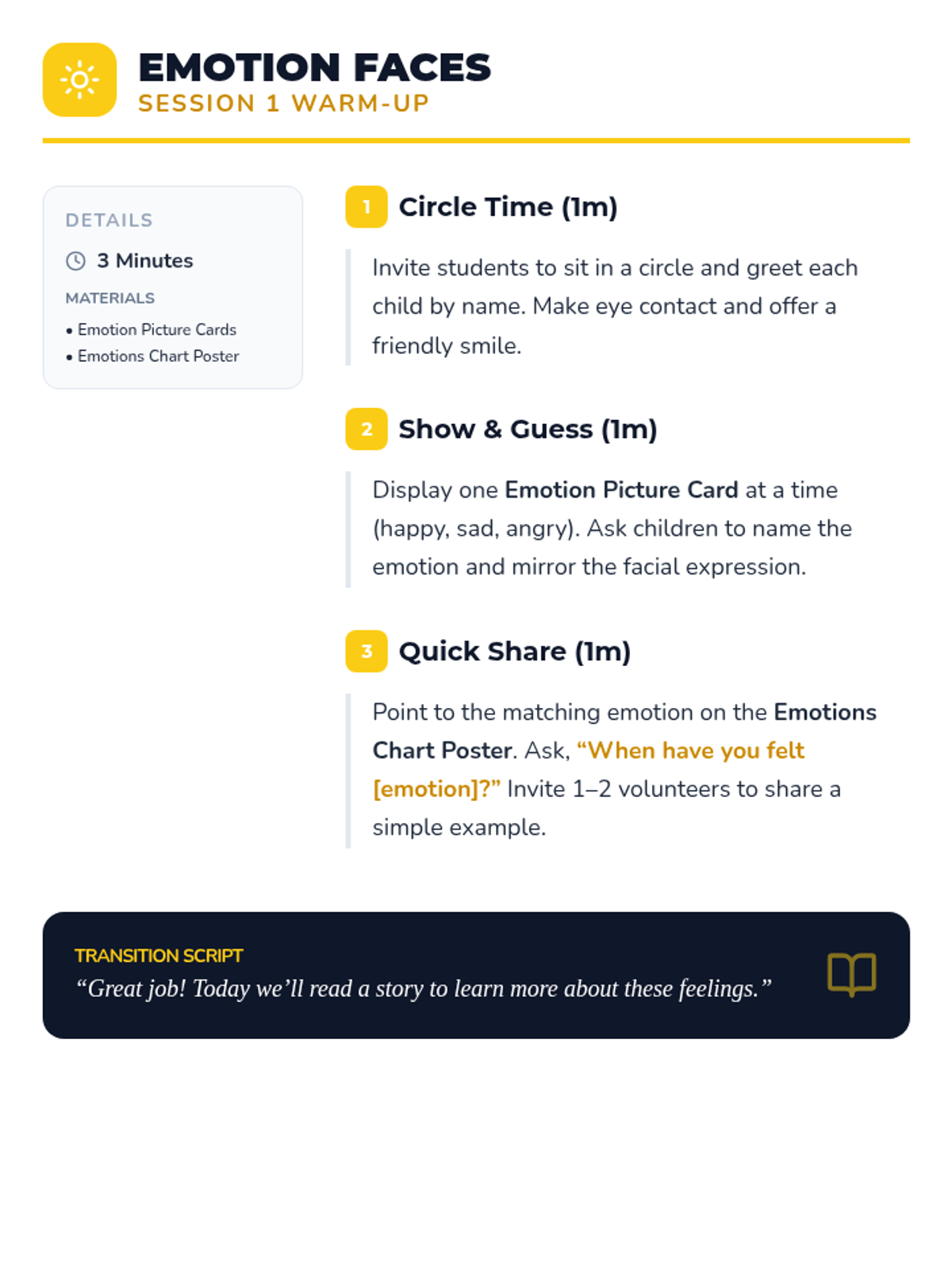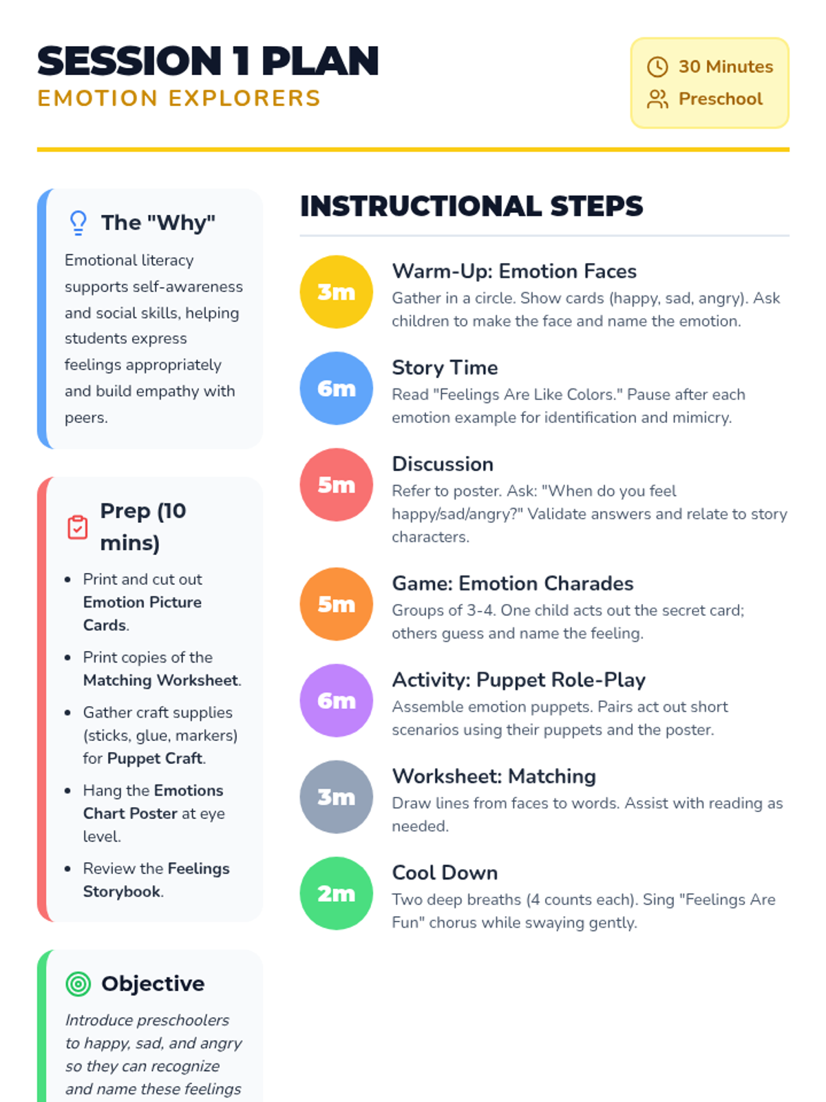 Introduce preschoolers to happy, sad, and angry through story-based recognition and creative role-play.