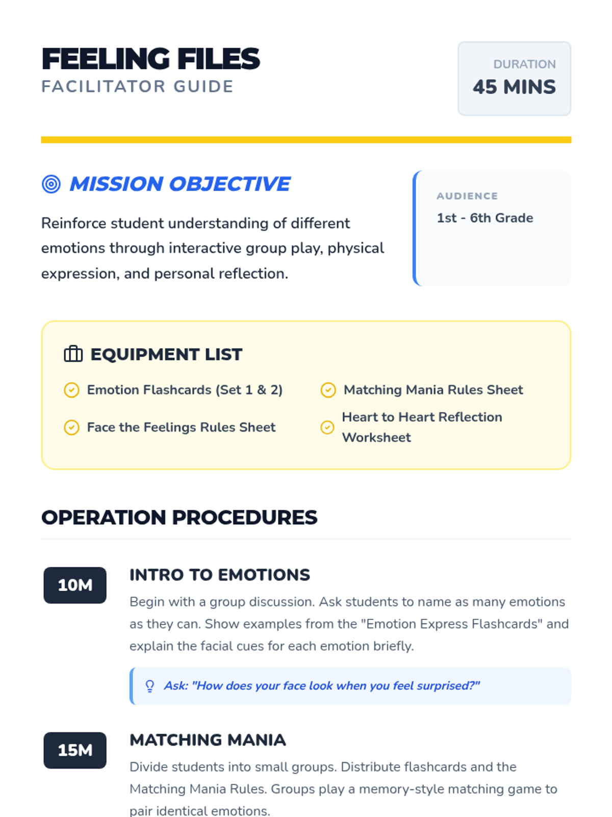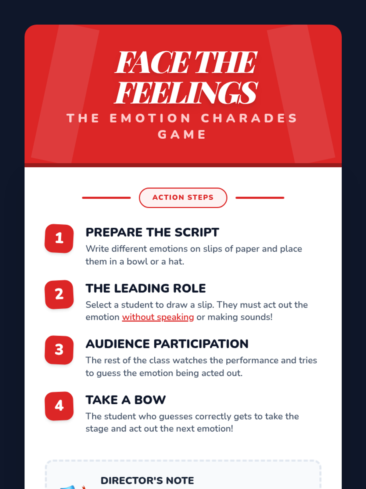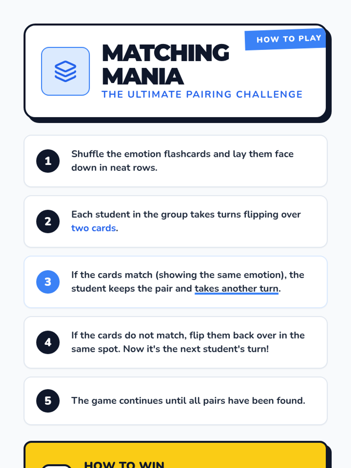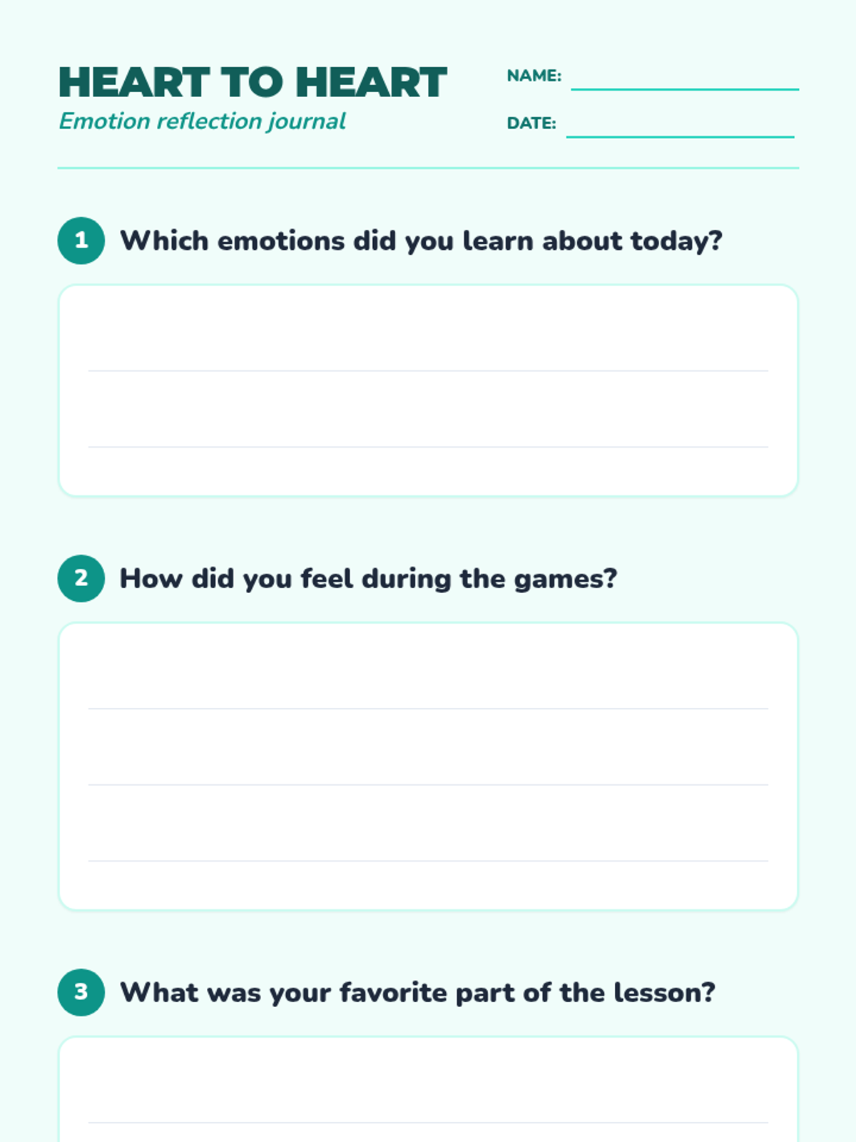 A fun, interactive lesson where students explore and identify different emotions through cooperative games like Matching Pairs and Charades, followed by a personal reflection.