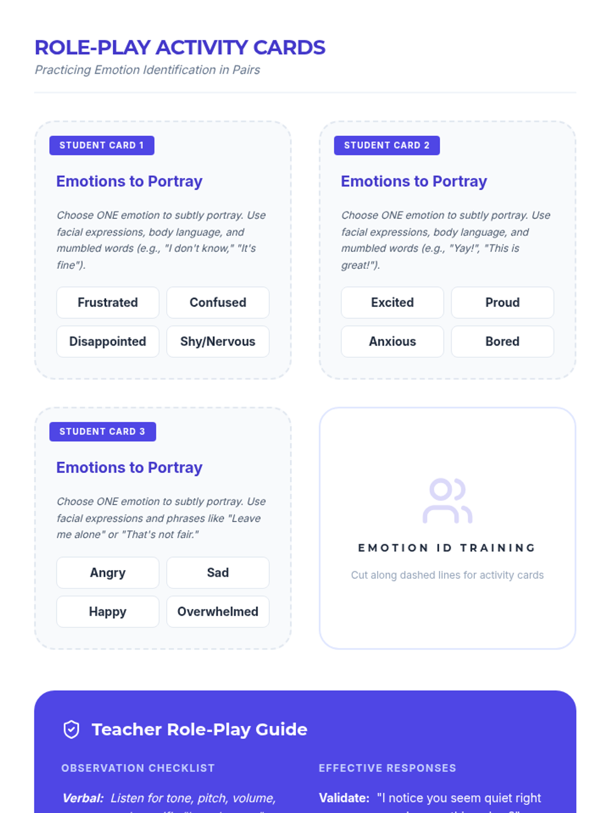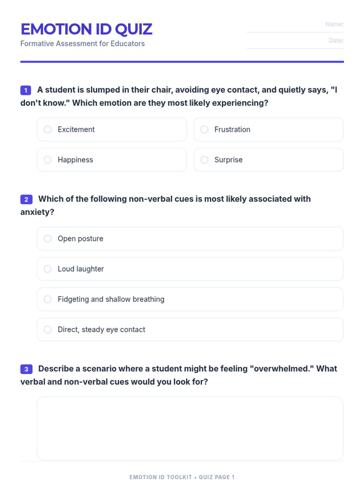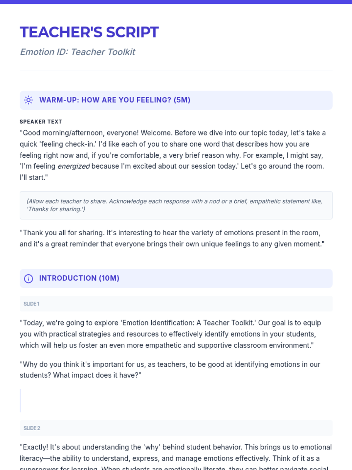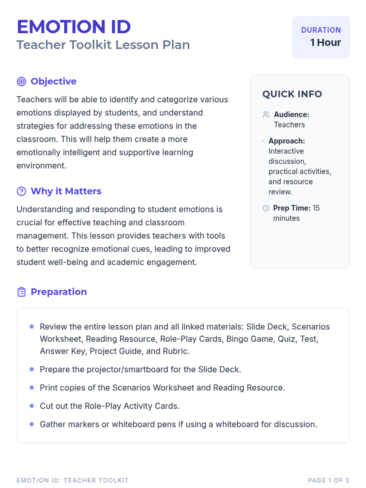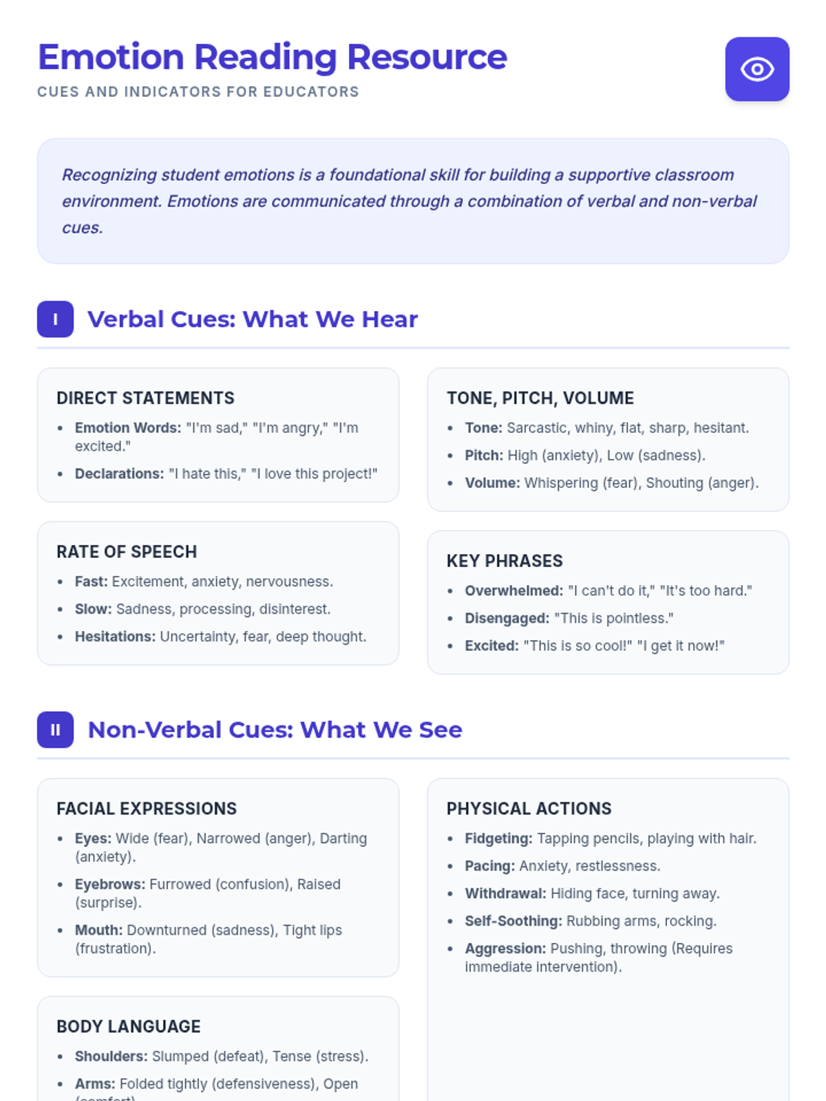 This lesson equips teachers with practical strategies and resources to effectively identify emotions in students, fostering a more empathetic and supportive classroom environment. Designed for small groups, this 1-hour session covers verbal and non-verbal cues, practical response strategies, and long-term application projects.