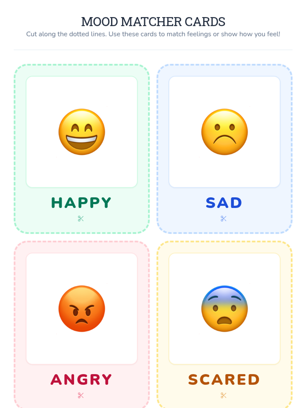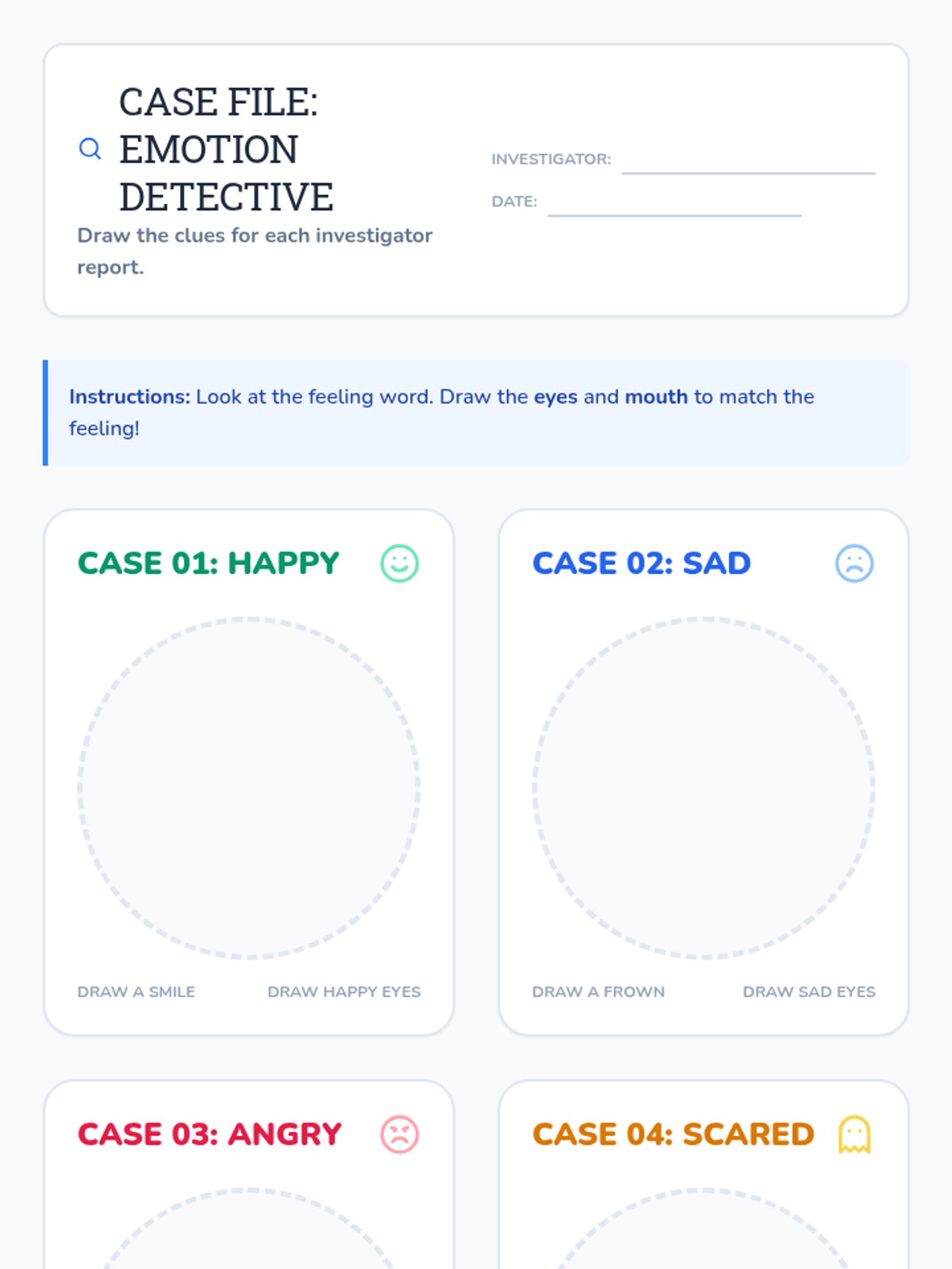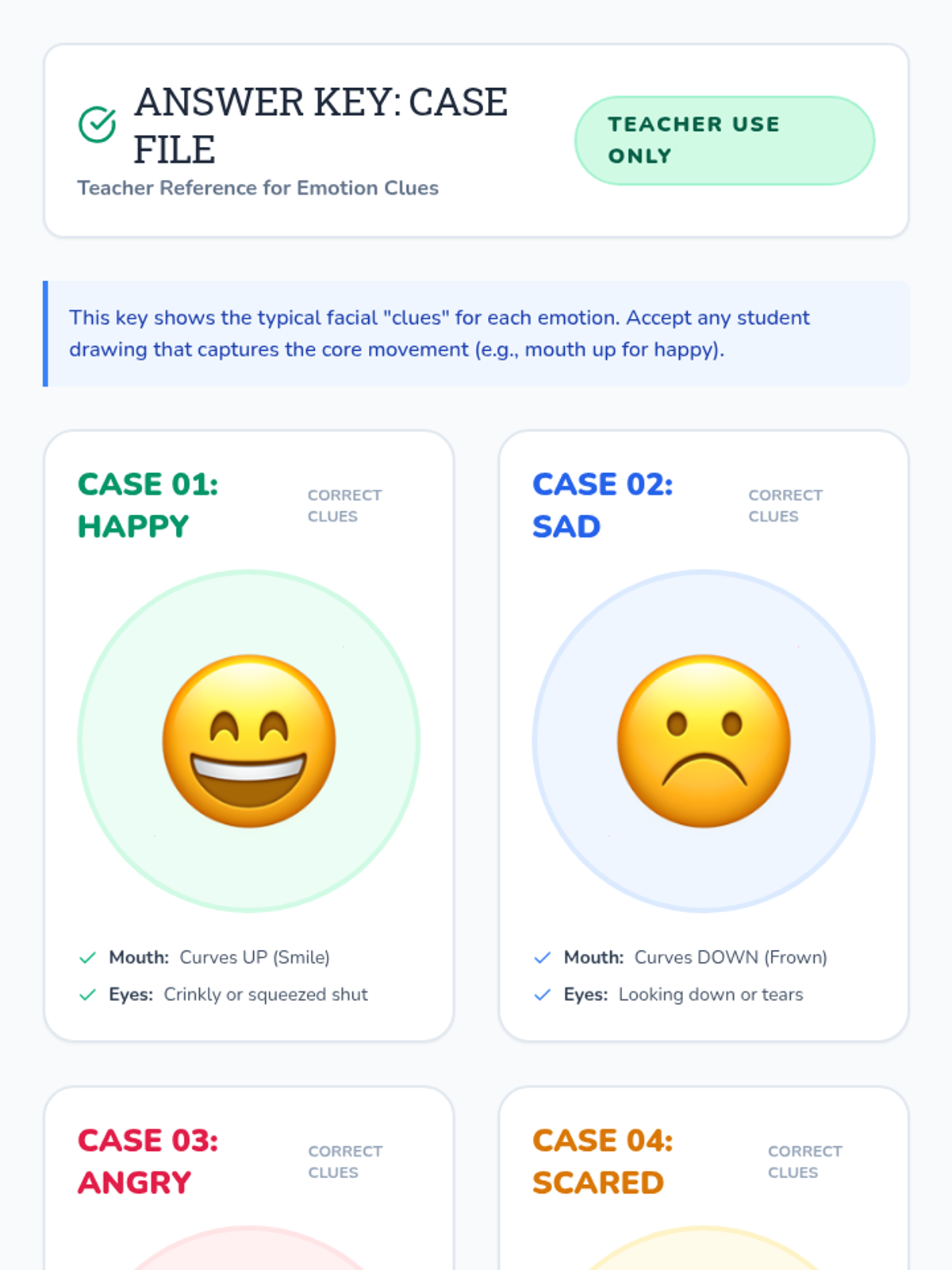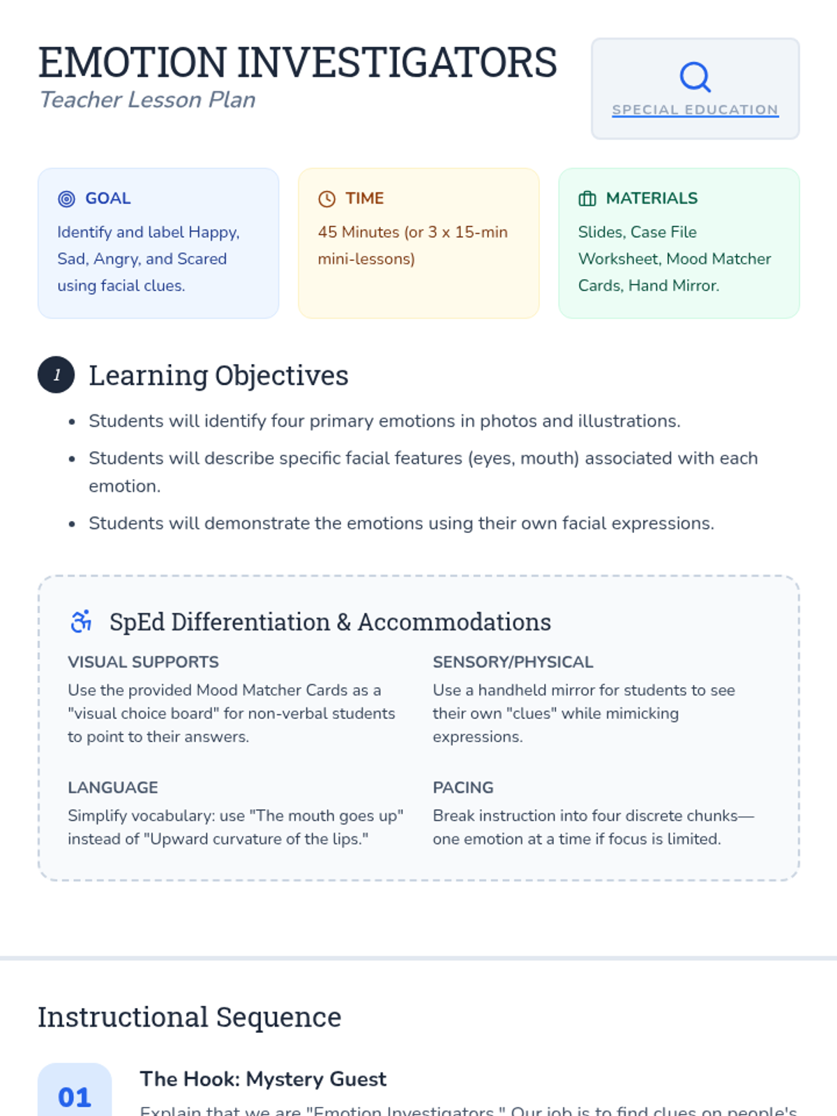 This lesson helps students identify and label four basic emotions (happy, sad, angry, and scared) by looking for facial 'clues' like eyes and mouths. It is designed with visual supports and clear structures specifically for special education settings.