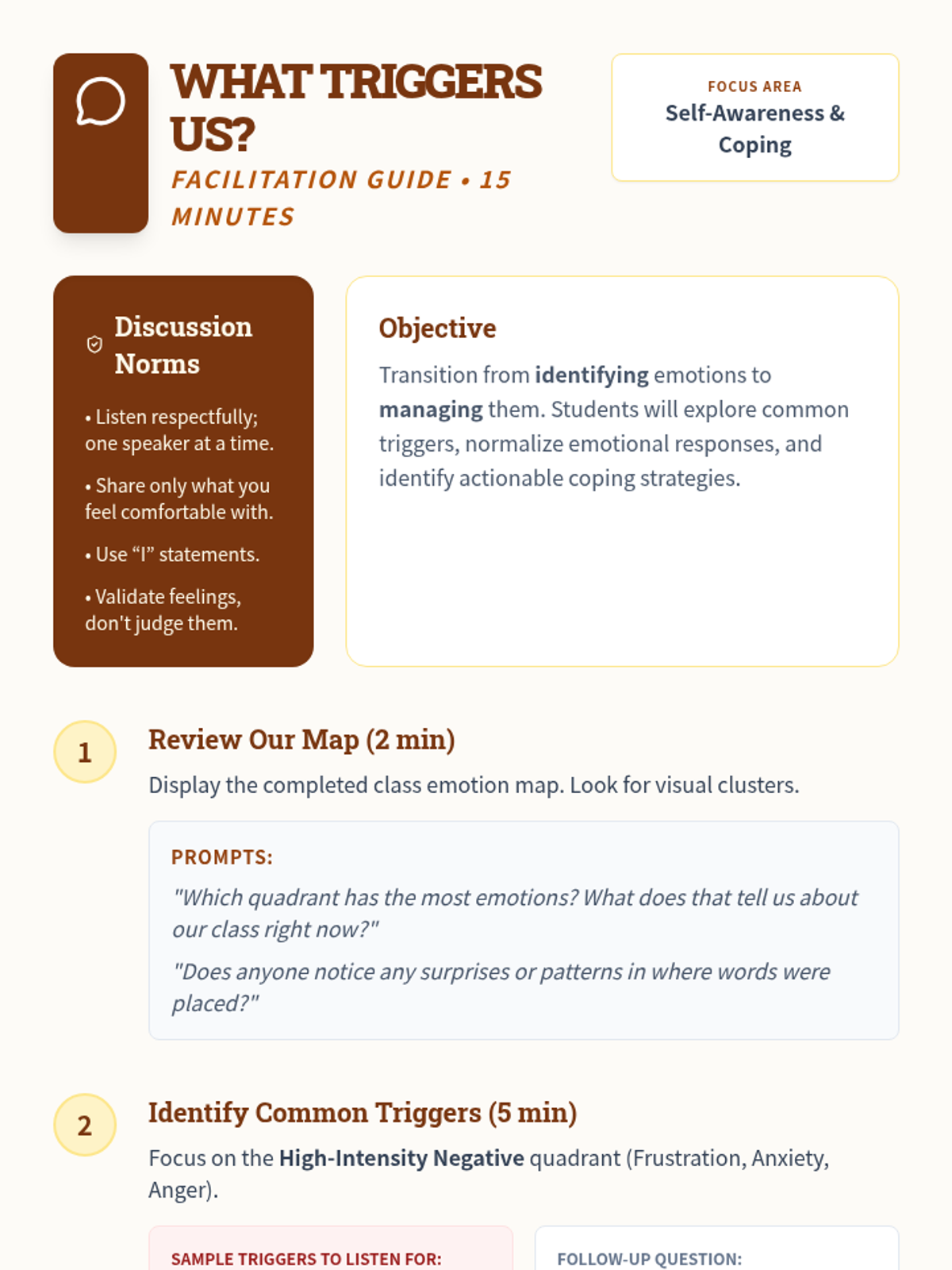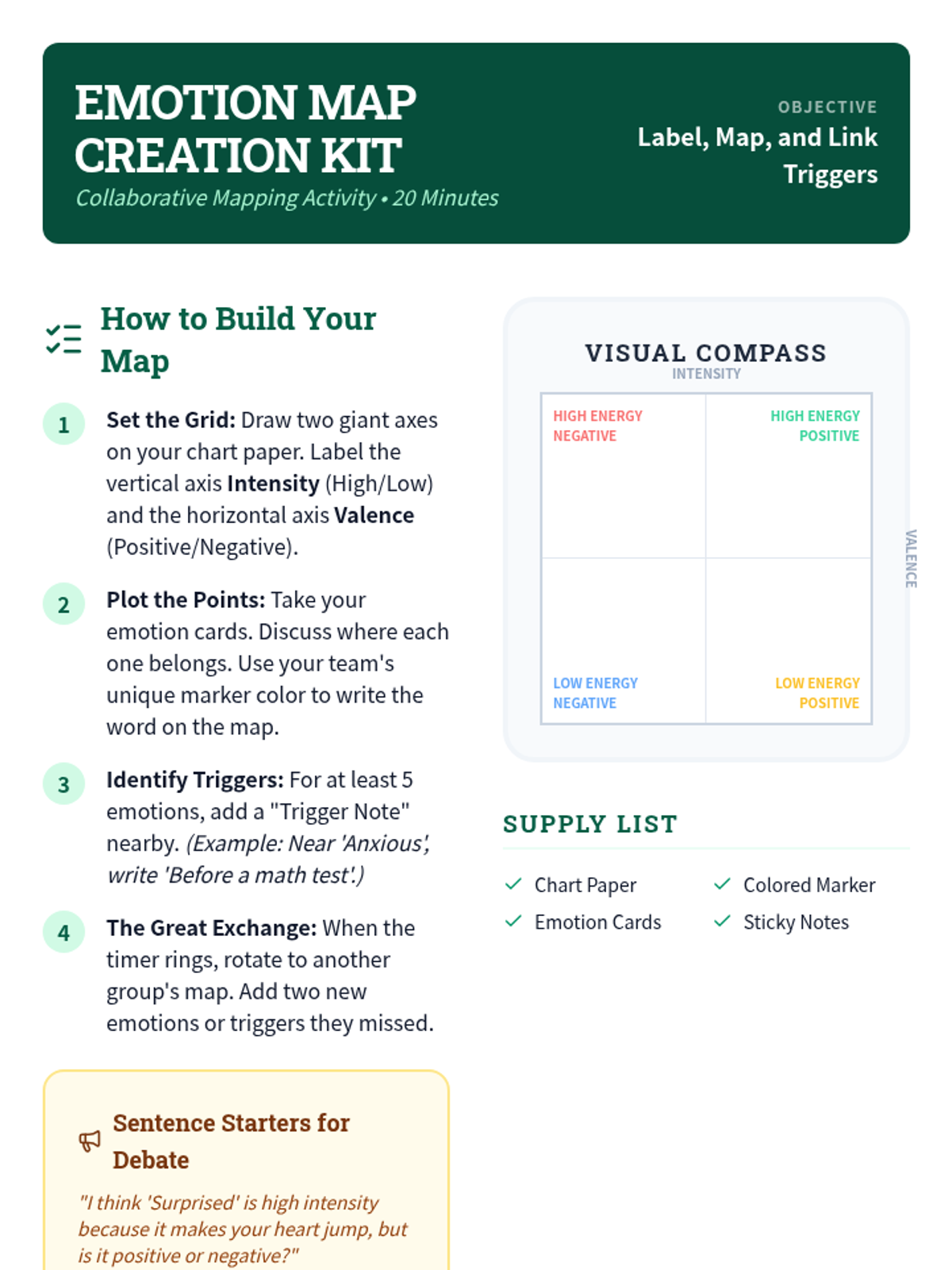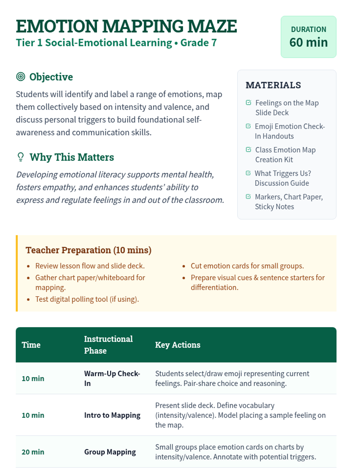 In this 60-minute Tier 1 lesson for 7th graders, students learn to identify, label, and discuss their emotions by creating a collective emotion map to build self-awareness and healthy communication skills.