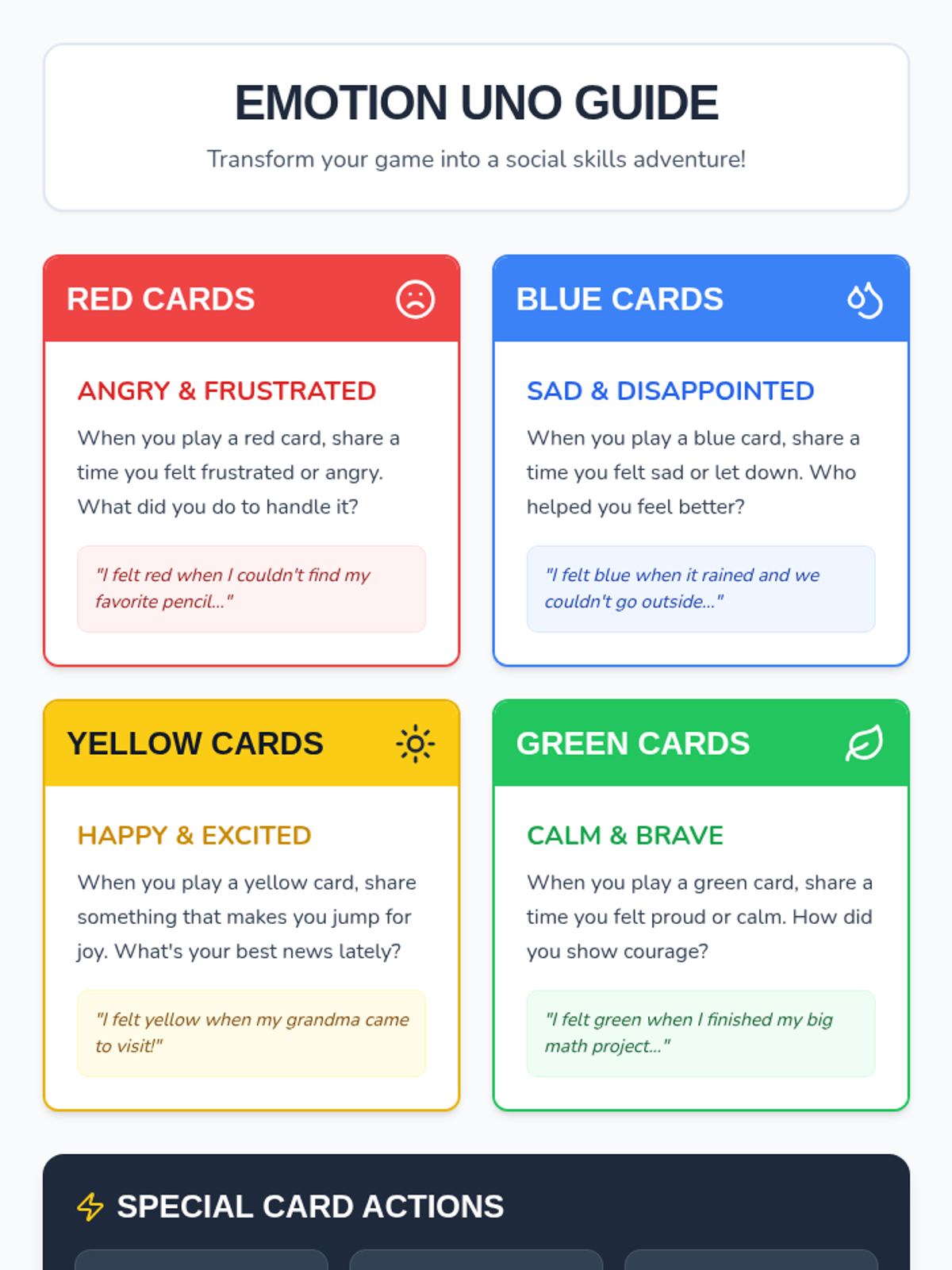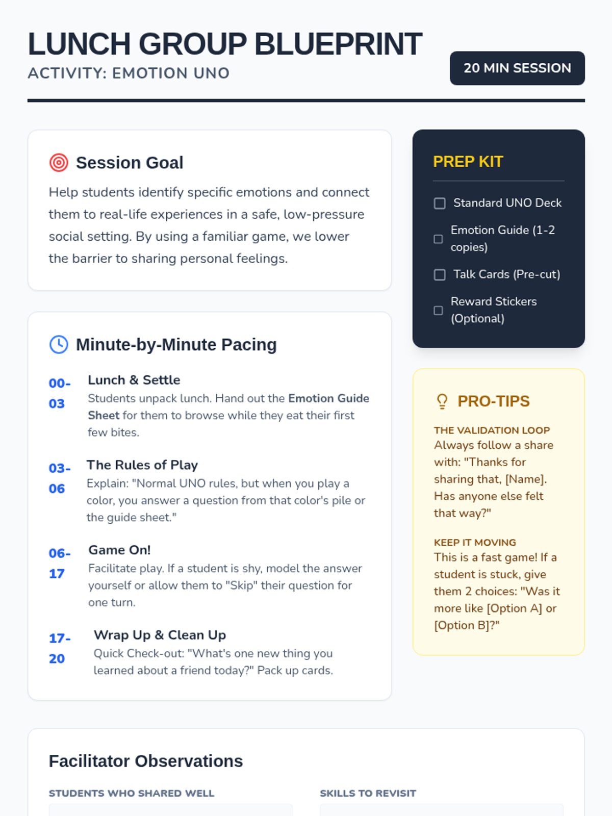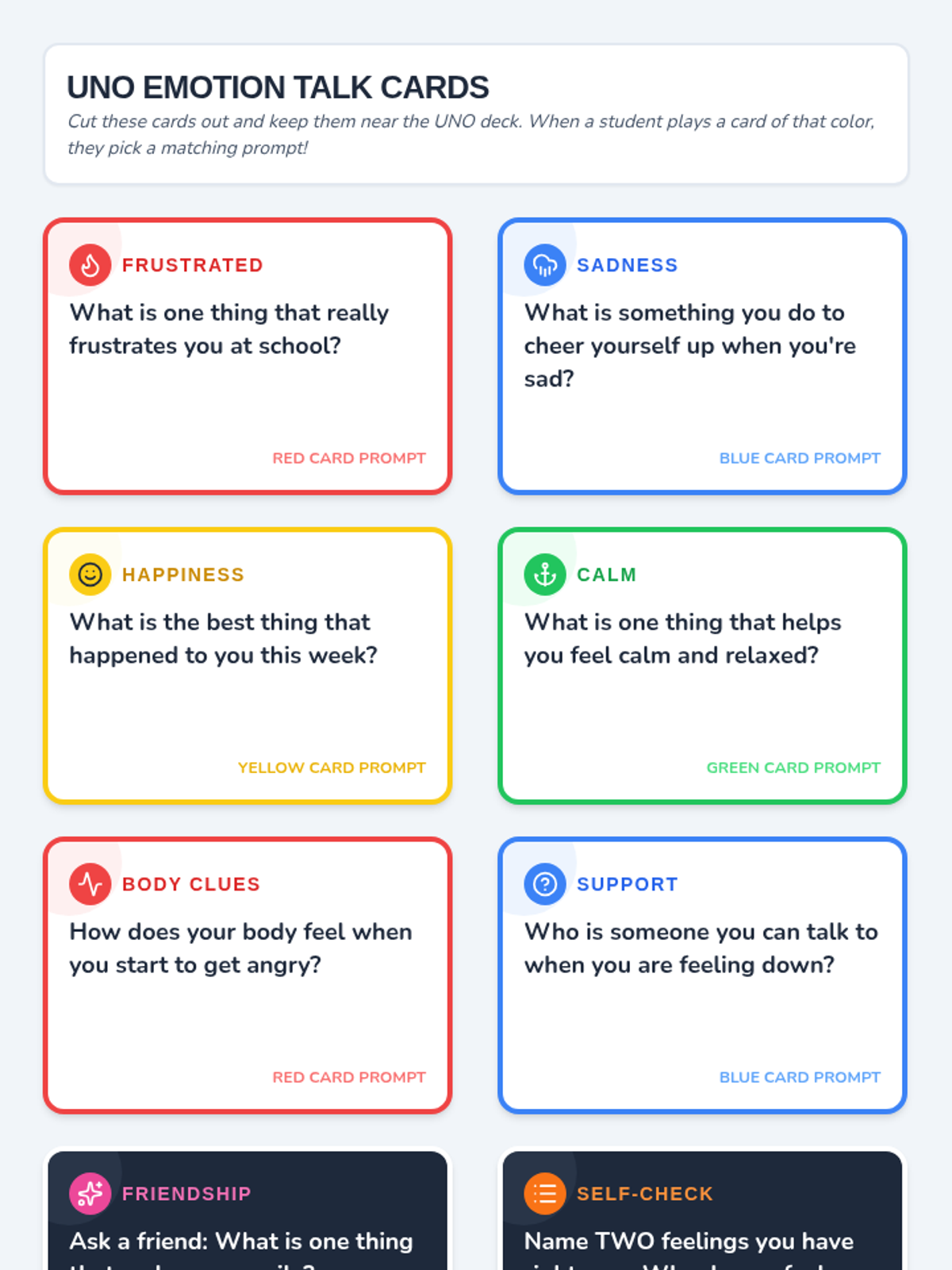 A quick, 20-minute social skills activity using UNO to help students identify and express emotions during a lunch group.