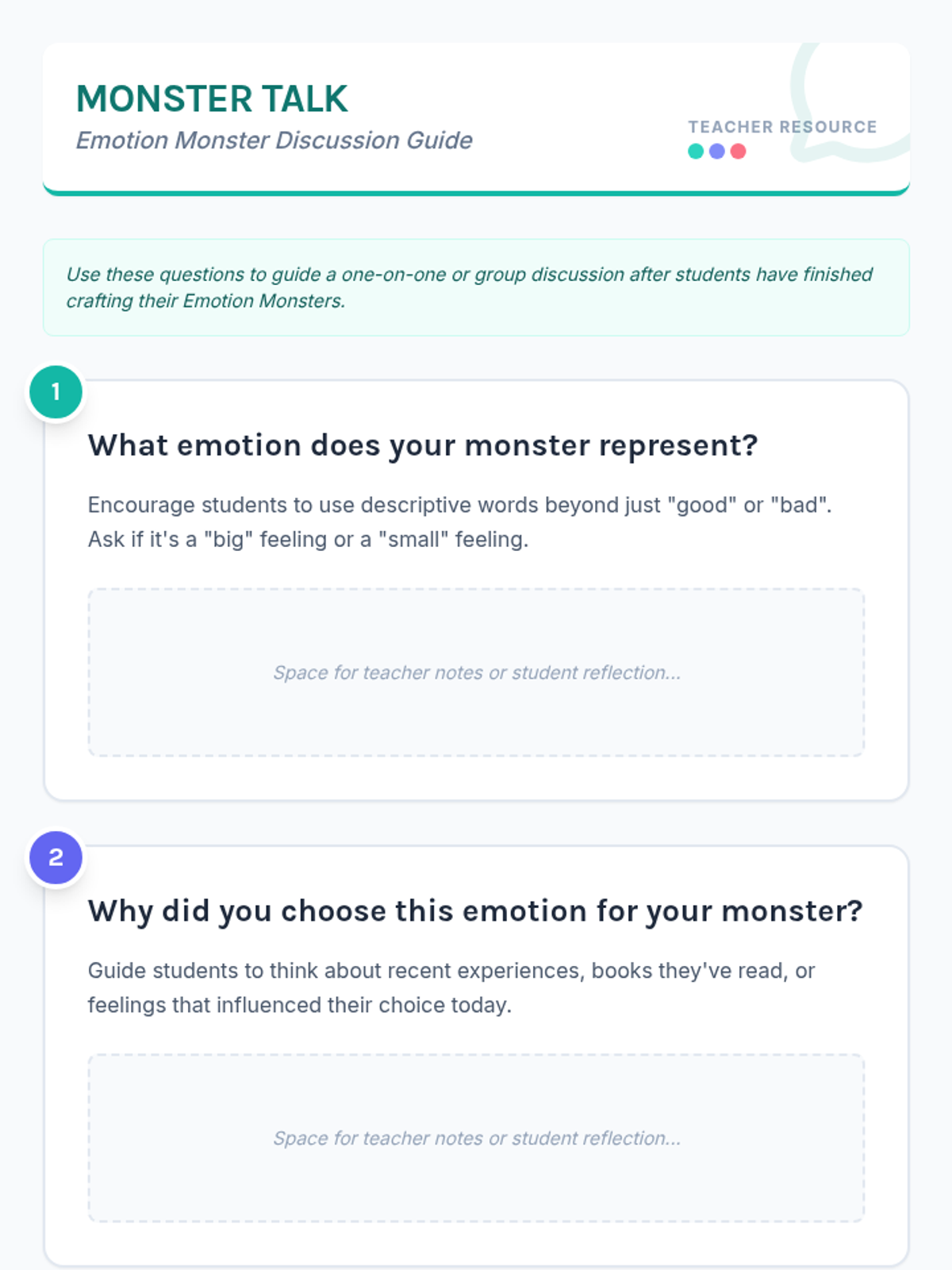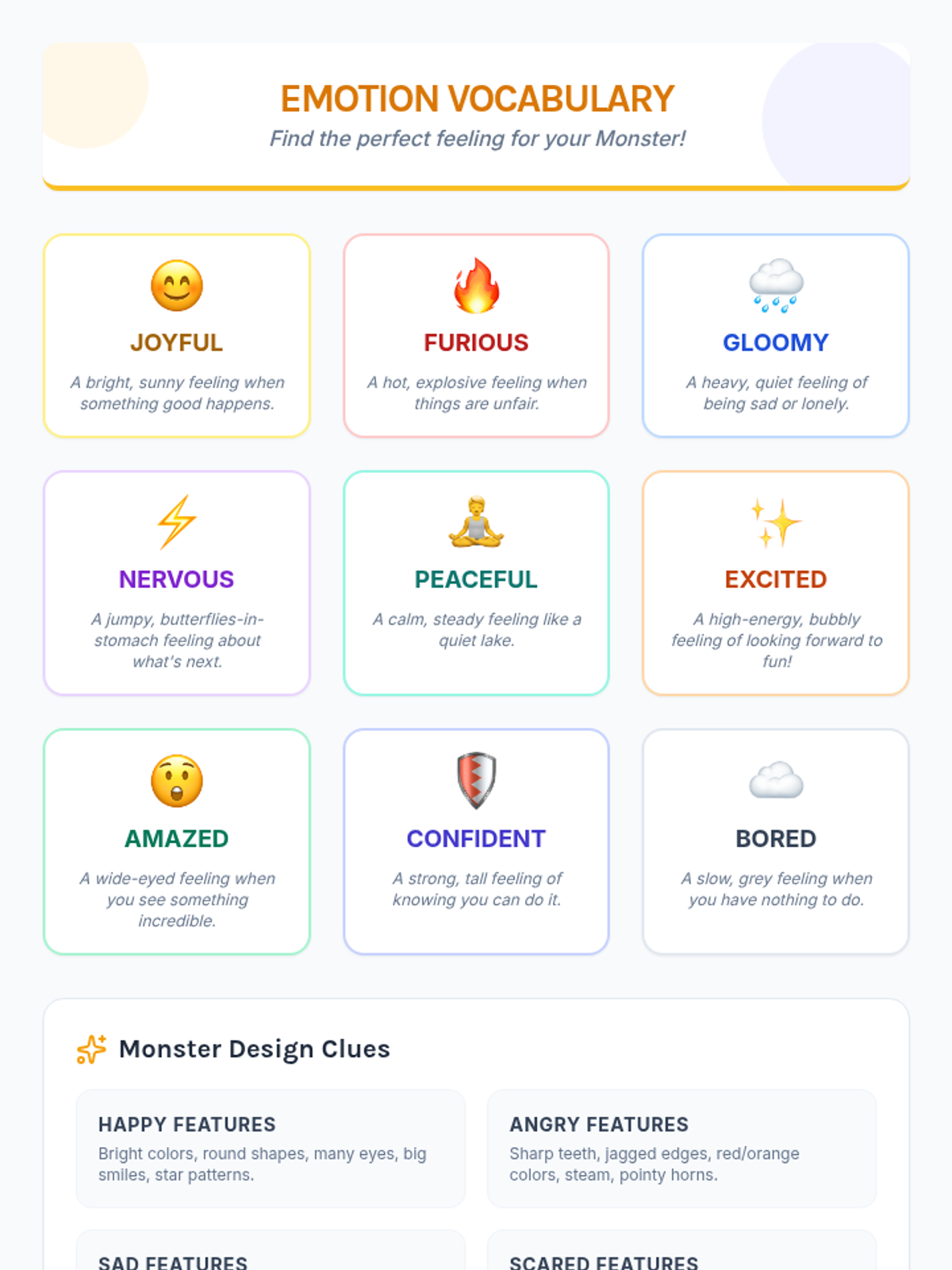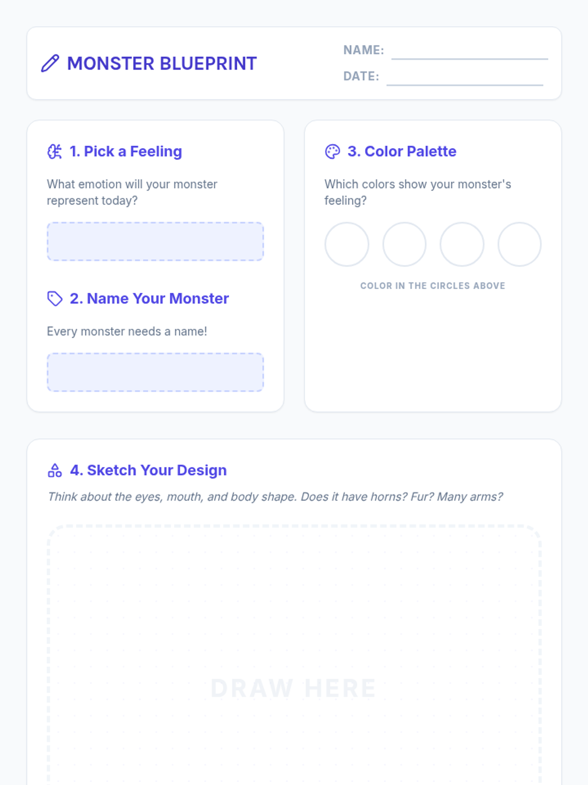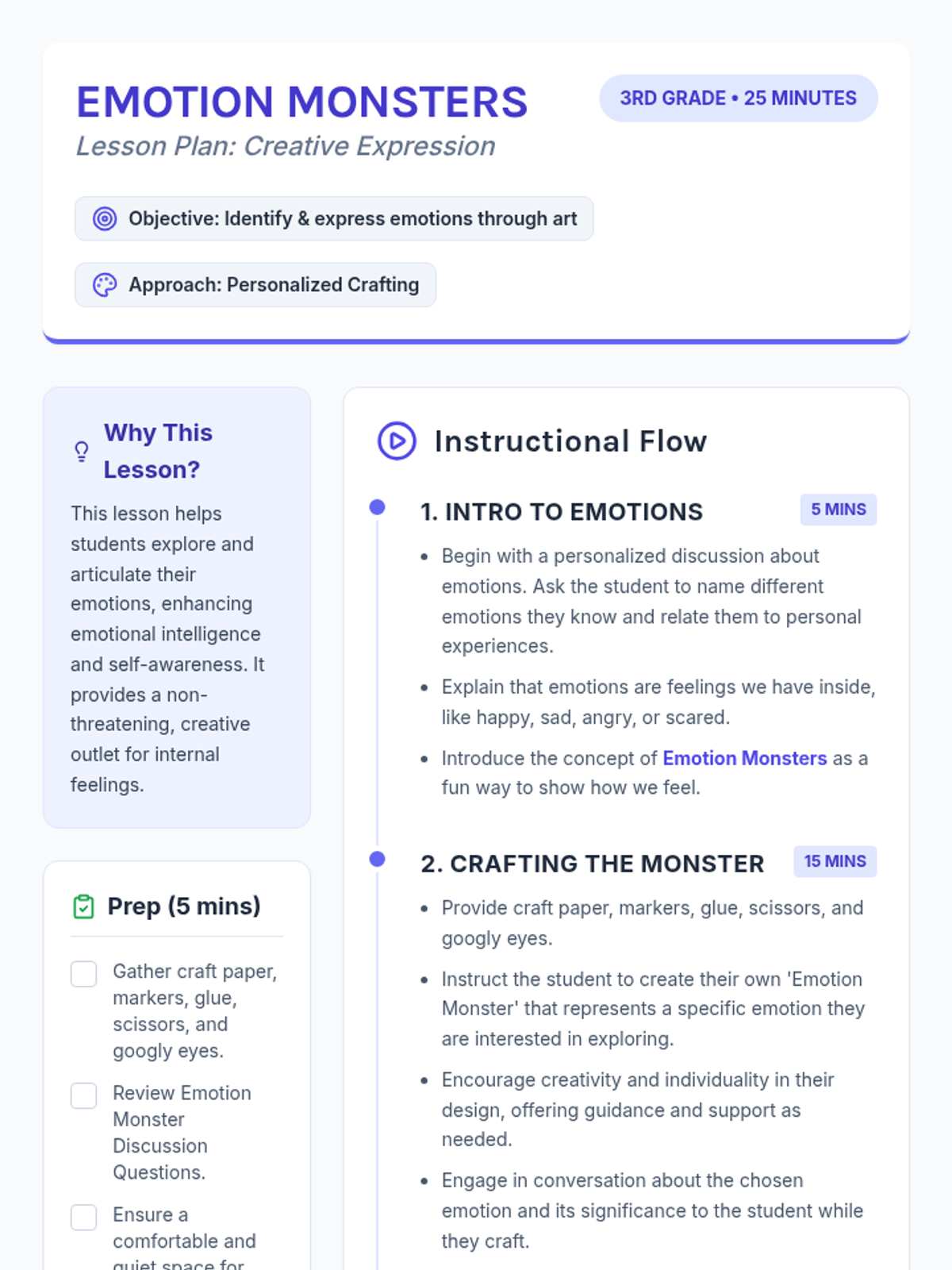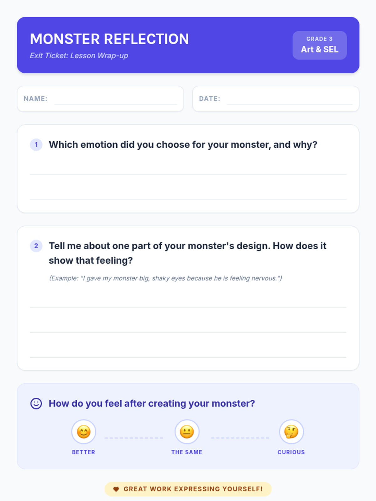 A creative art-based lesson where 3rd-grade students explore and express their feelings by designing and crafting 'Emotion Monsters'. This lesson builds emotional literacy and self-awareness through hands-on making and guided discussion.