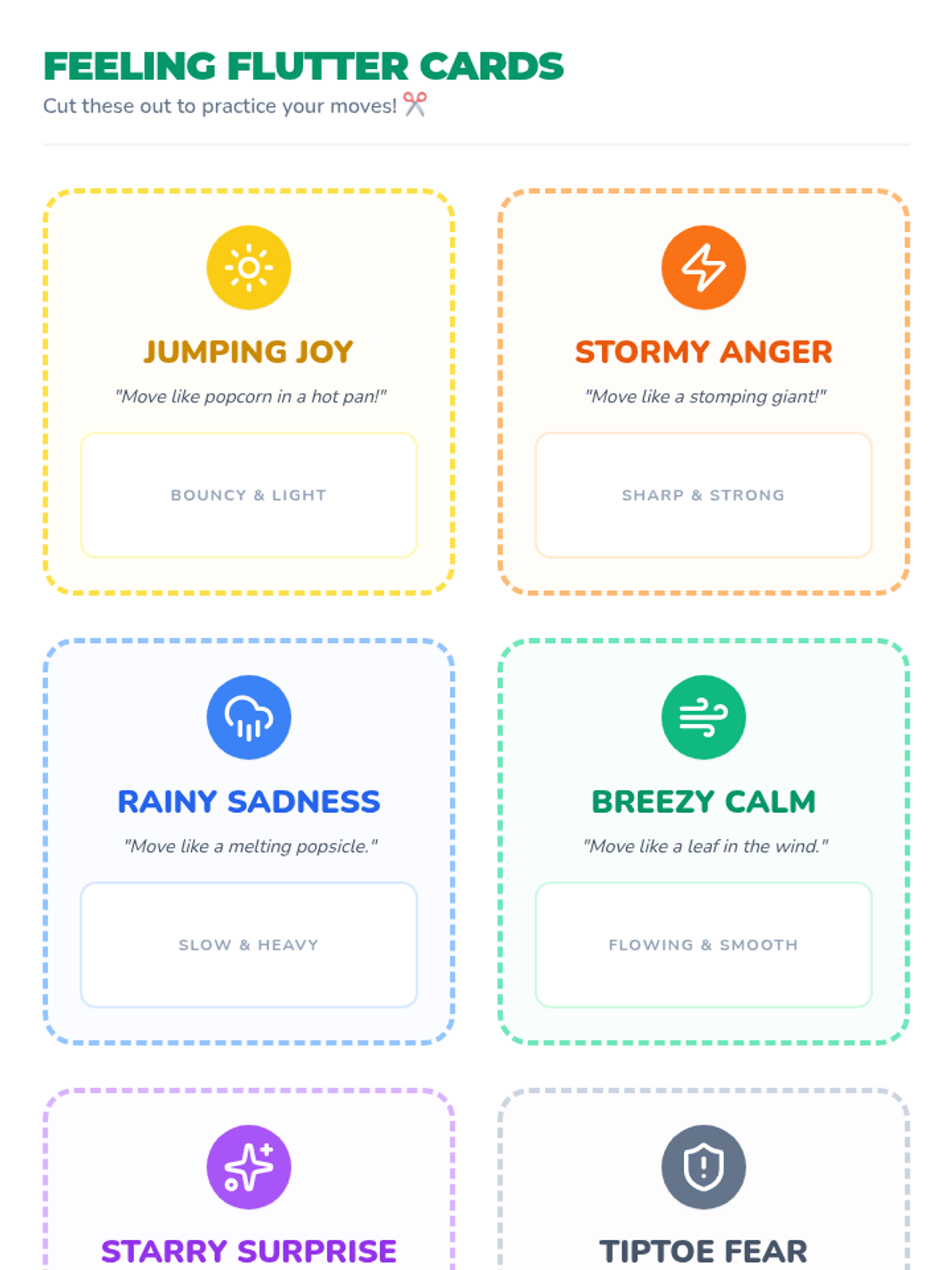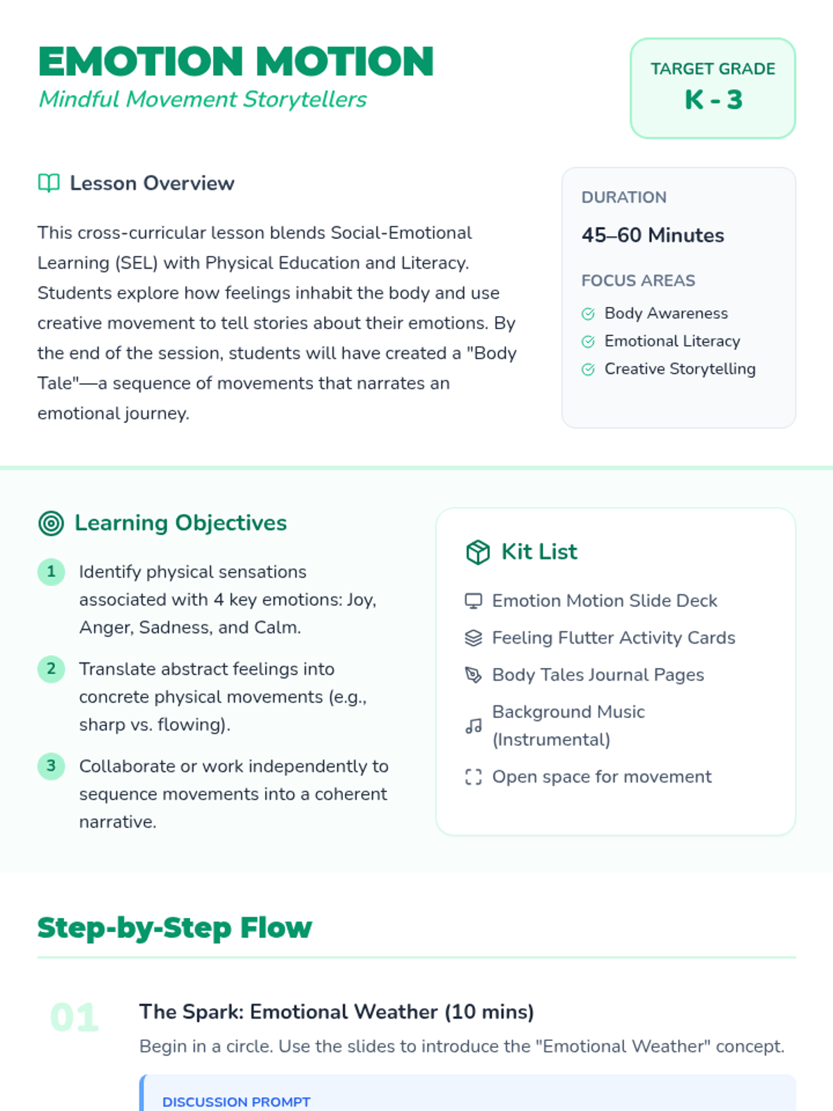A cross-curricular lesson for K-3 students that combines physical activity, imaginative storytelling, and emotional regulation. Students learn to connect body sensations with feelings and express them through creative movement sequences.