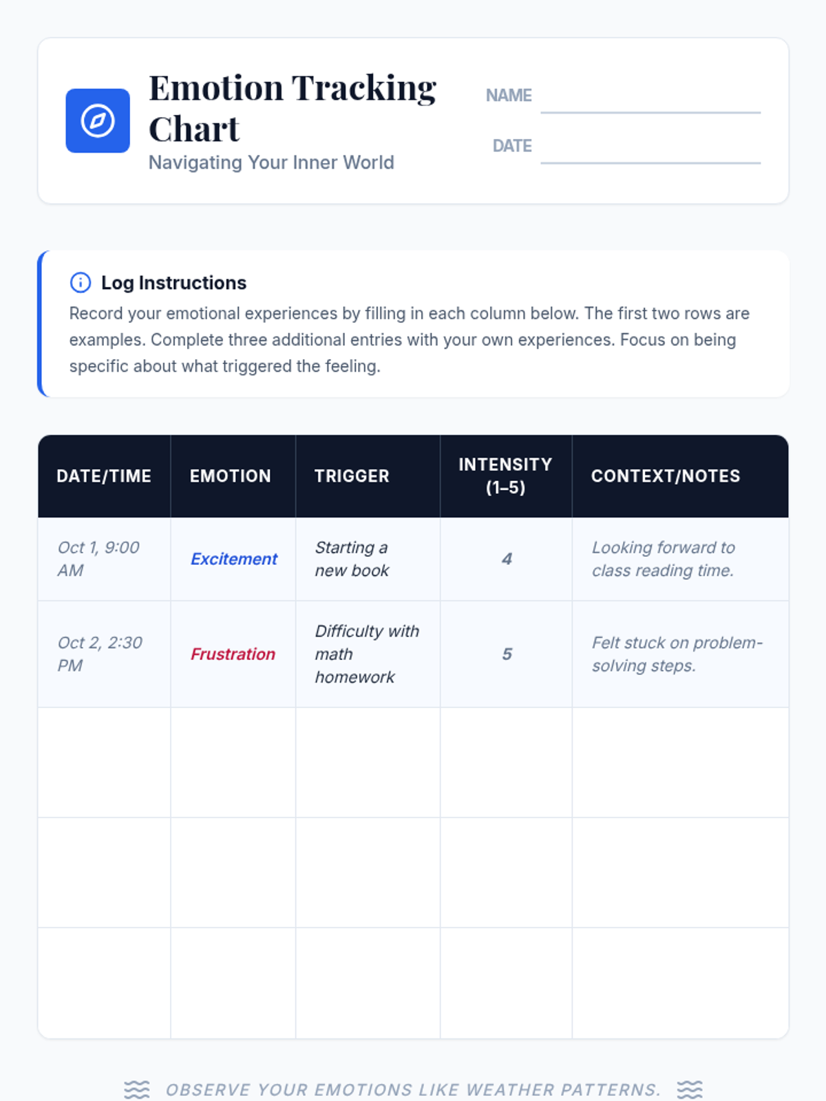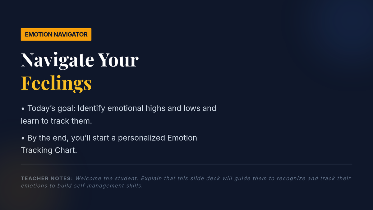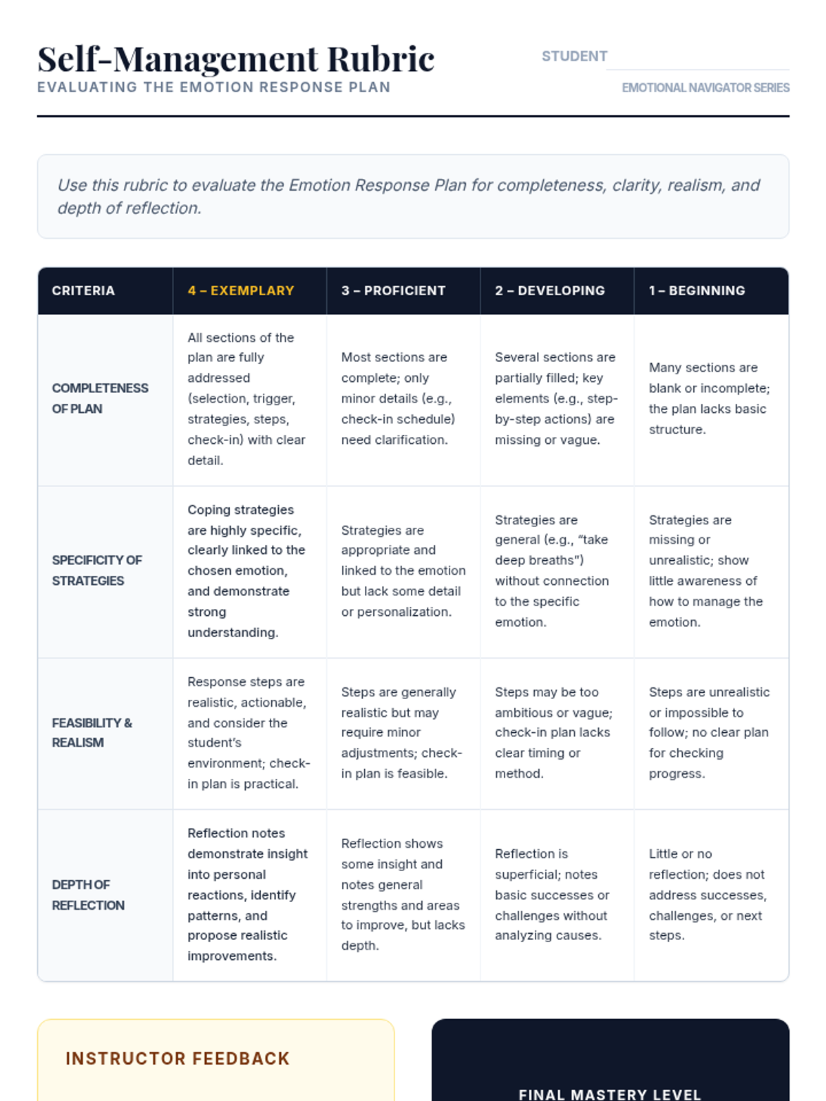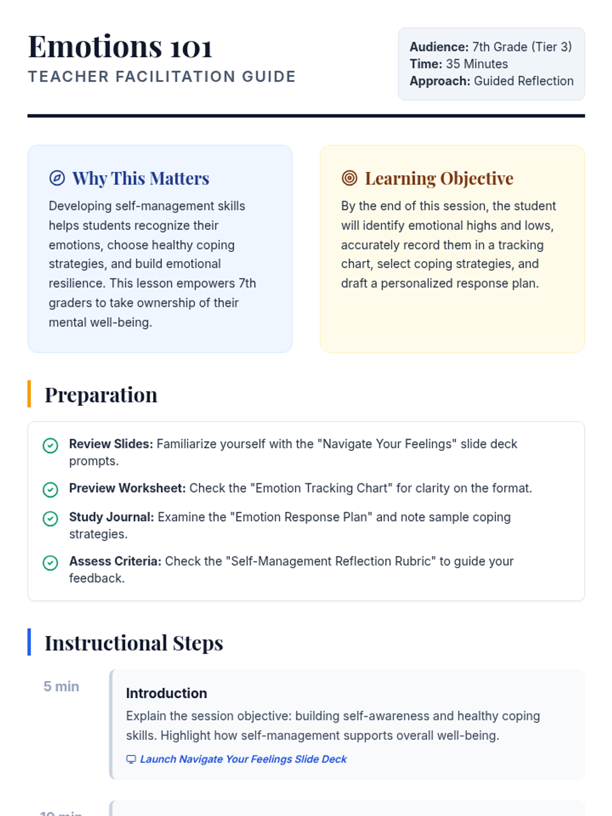 A 35-minute Tier 3 individual support lesson for 7th graders focusing on emotional self-management. Students learn to identify emotional highs and lows, track triggers, and develop a personalized response plan with coping strategies.