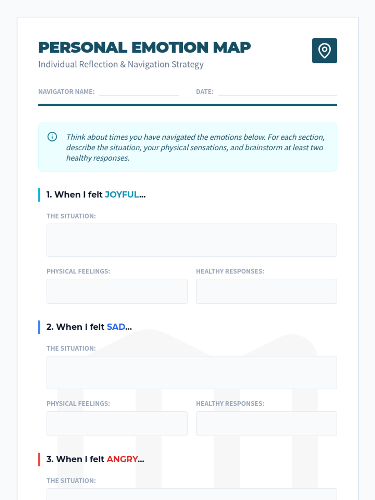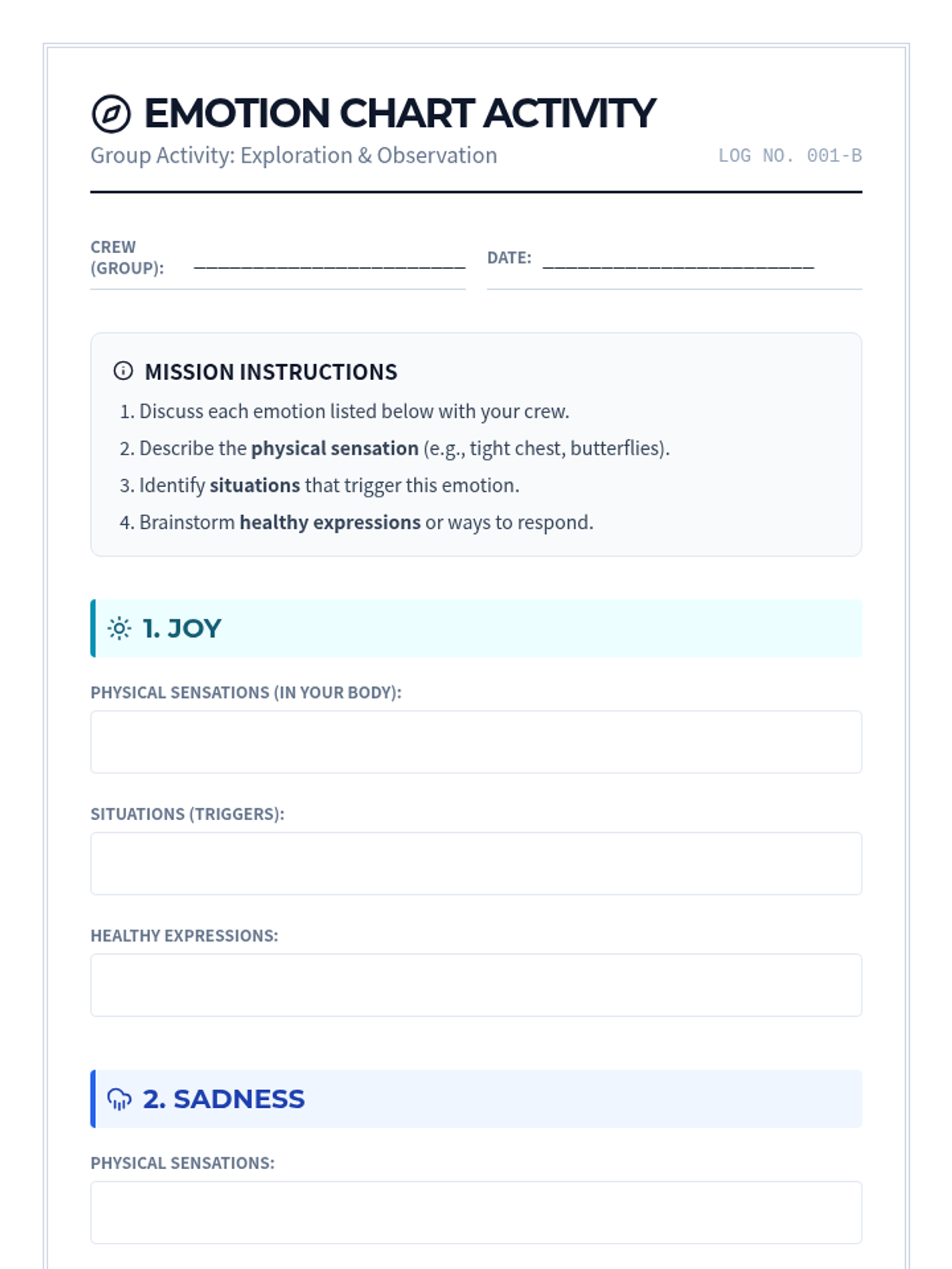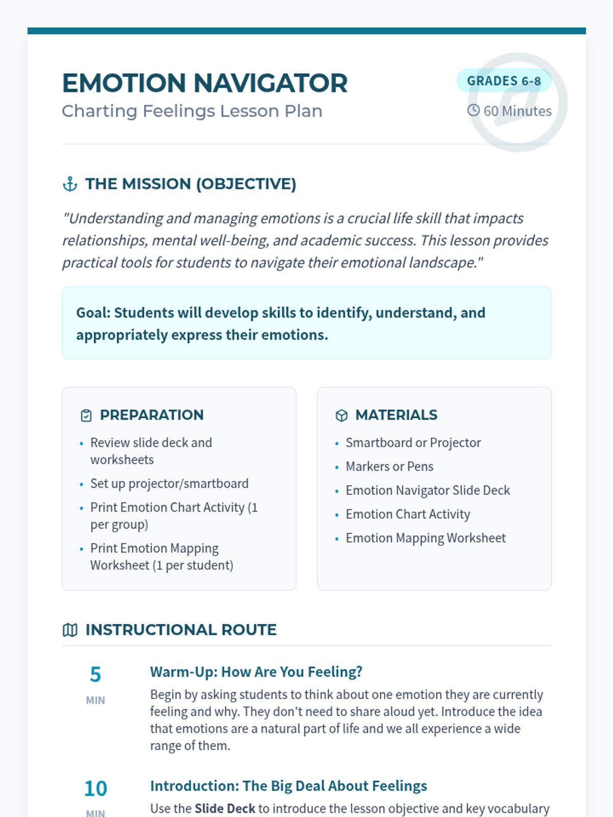 A 60-minute lesson for middle schoolers to identify, understand, and regulate emotions using a nautical 'navigation' theme. Students explore physical manifestations of feelings and develop healthy coping strategies through collaborative charting and personal mapping.