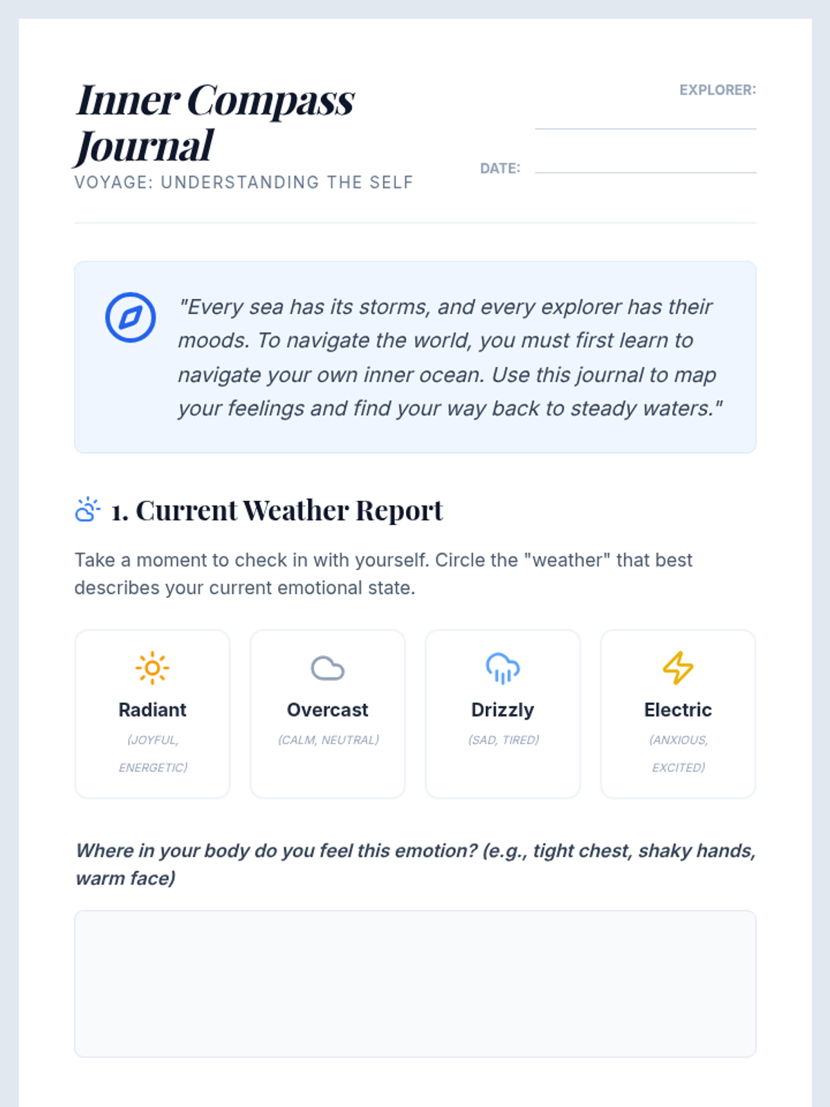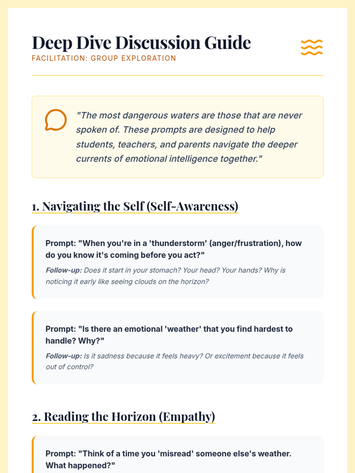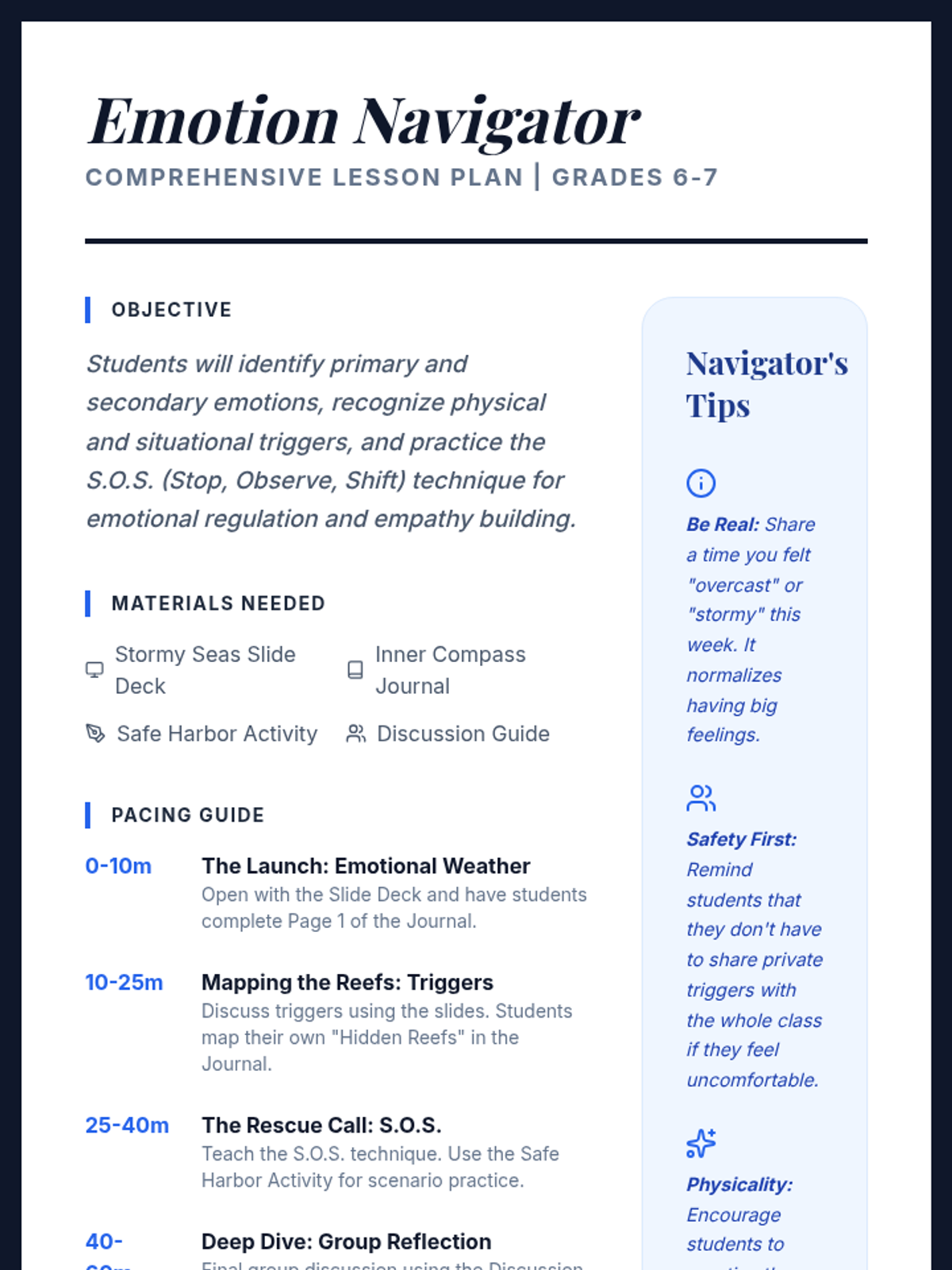 A comprehensive guide for 6th-7th graders to develop emotional intelligence through self-awareness and empathy, using a maritime navigation theme.