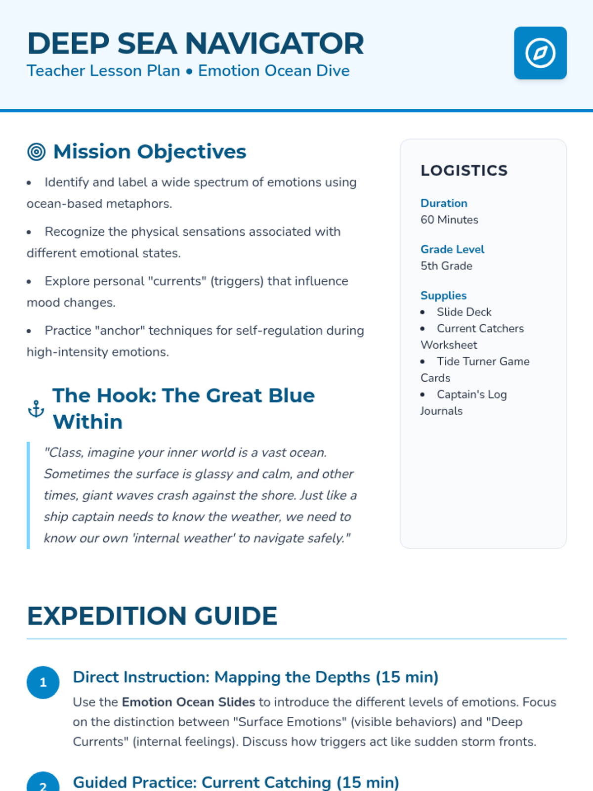 A deep-dive exploration into emotional literacy for 5th graders, using ocean metaphors to understand, label, and navigate complex feelings and self-regulation.