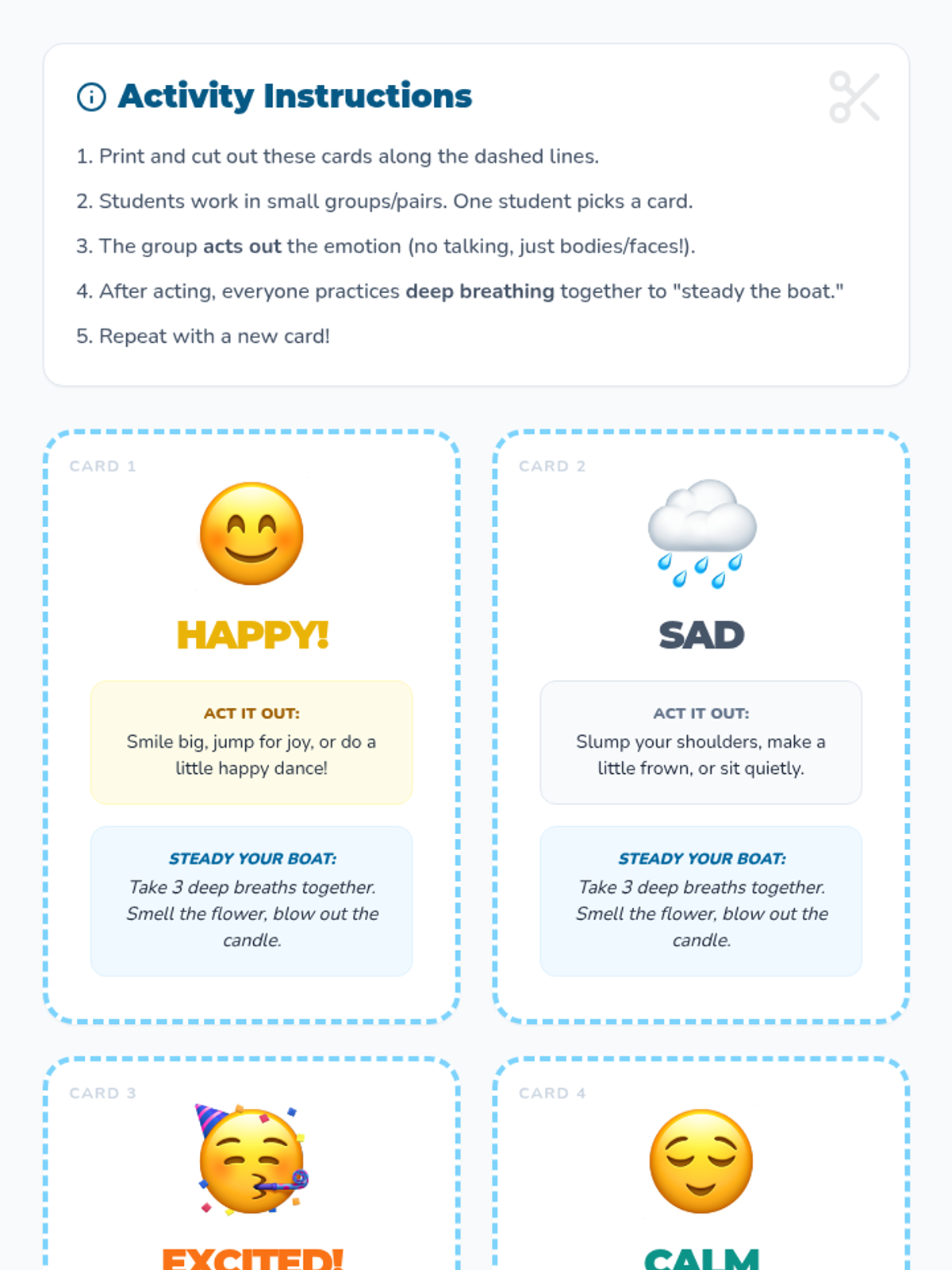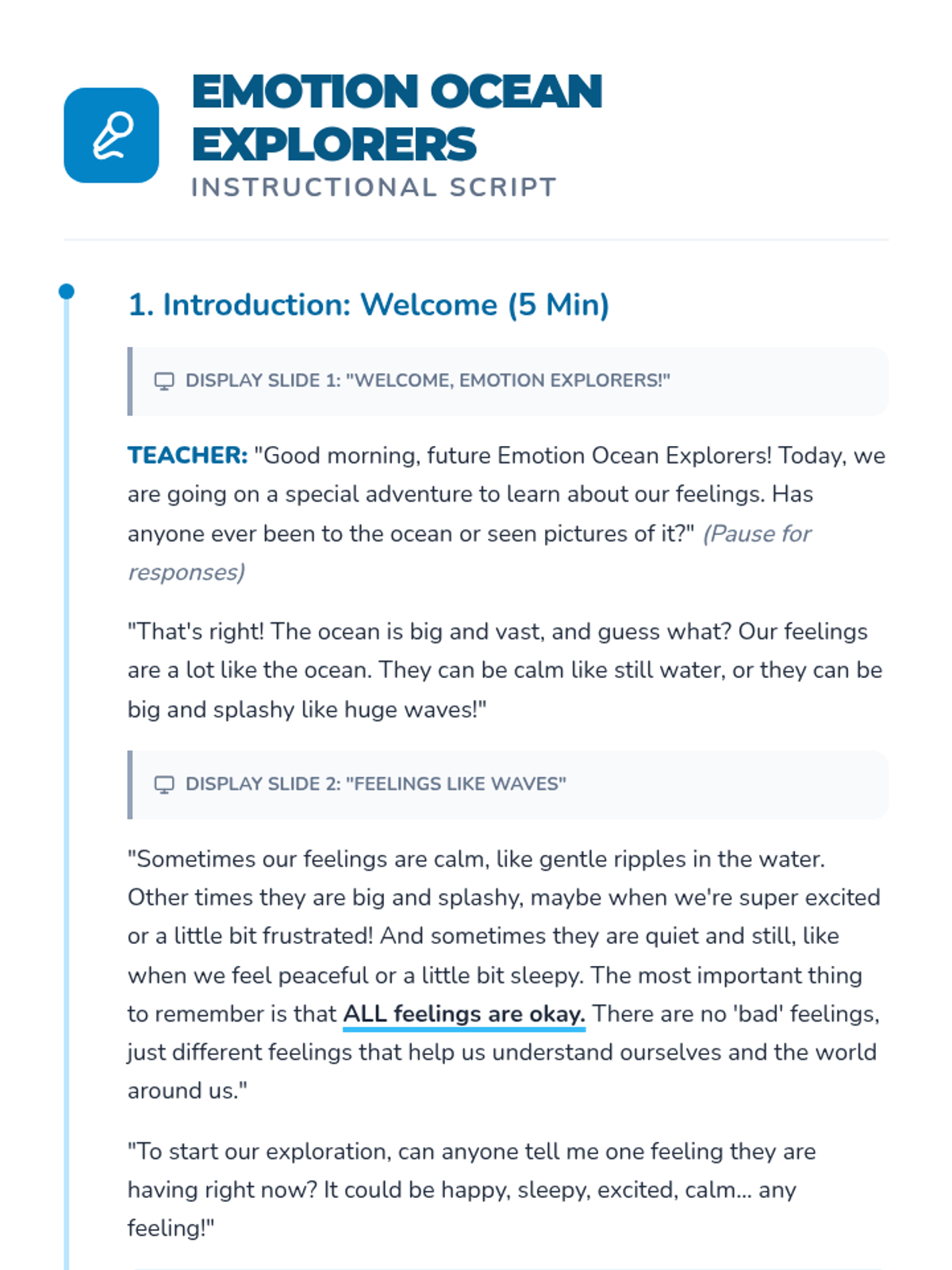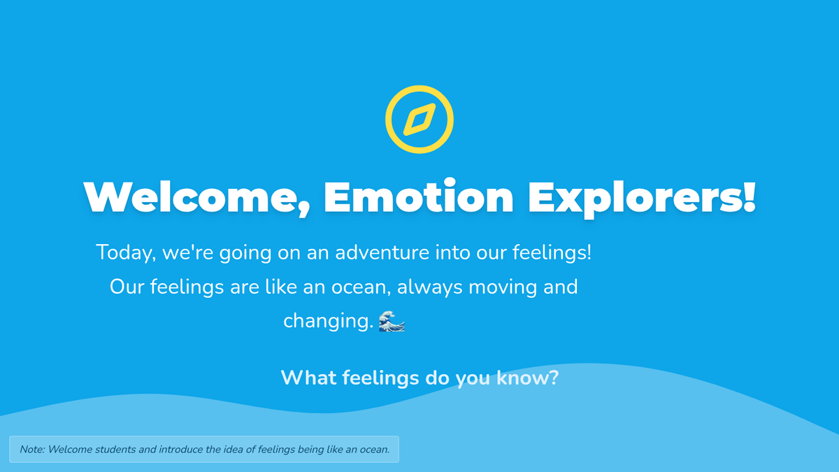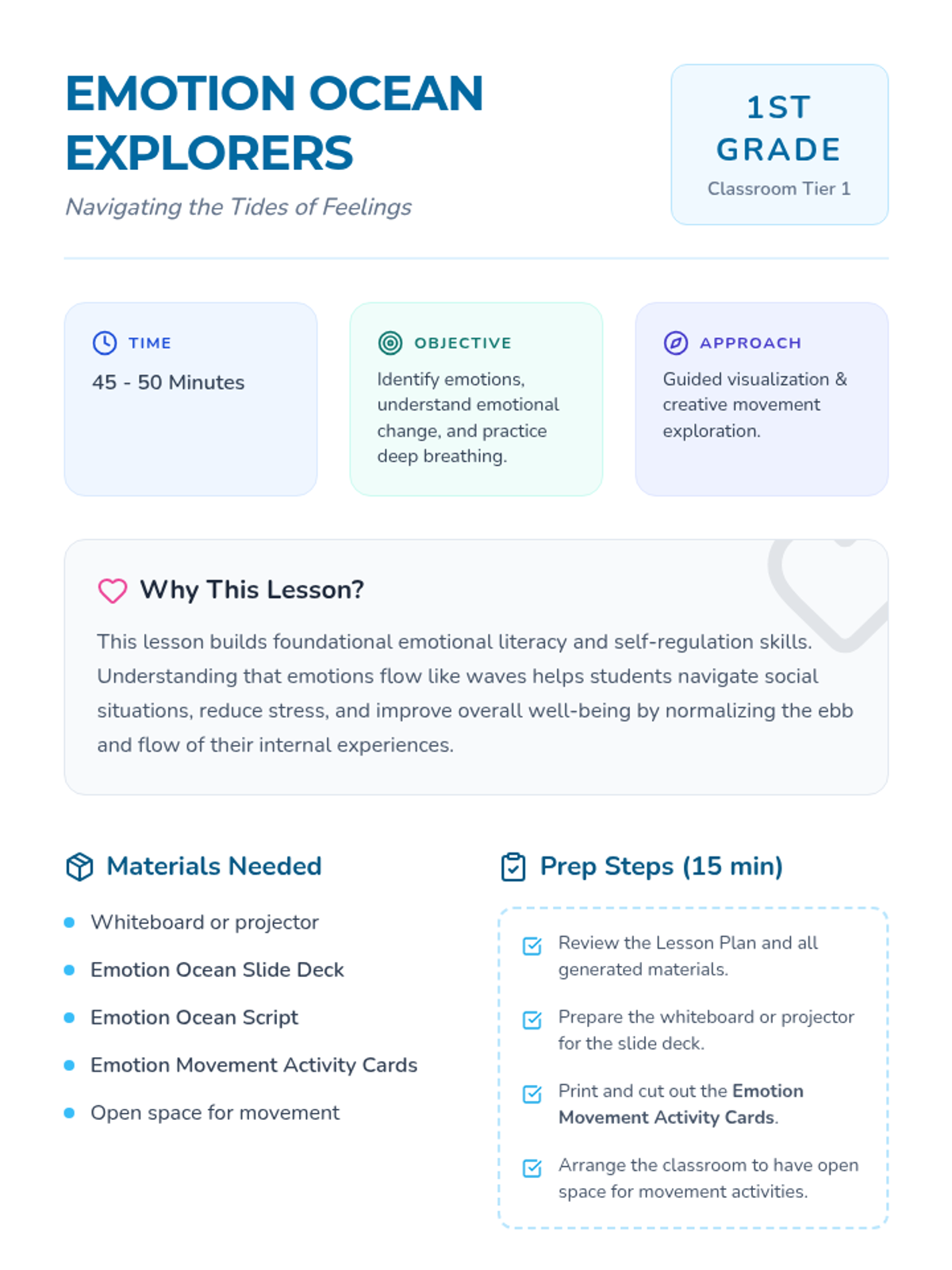 A 45-50 minute SEL lesson for 1st graders that uses an ocean metaphor to teach emotional literacy and self-regulation. Students explore how feelings change like waves and practice deep breathing as a tool for navigation.