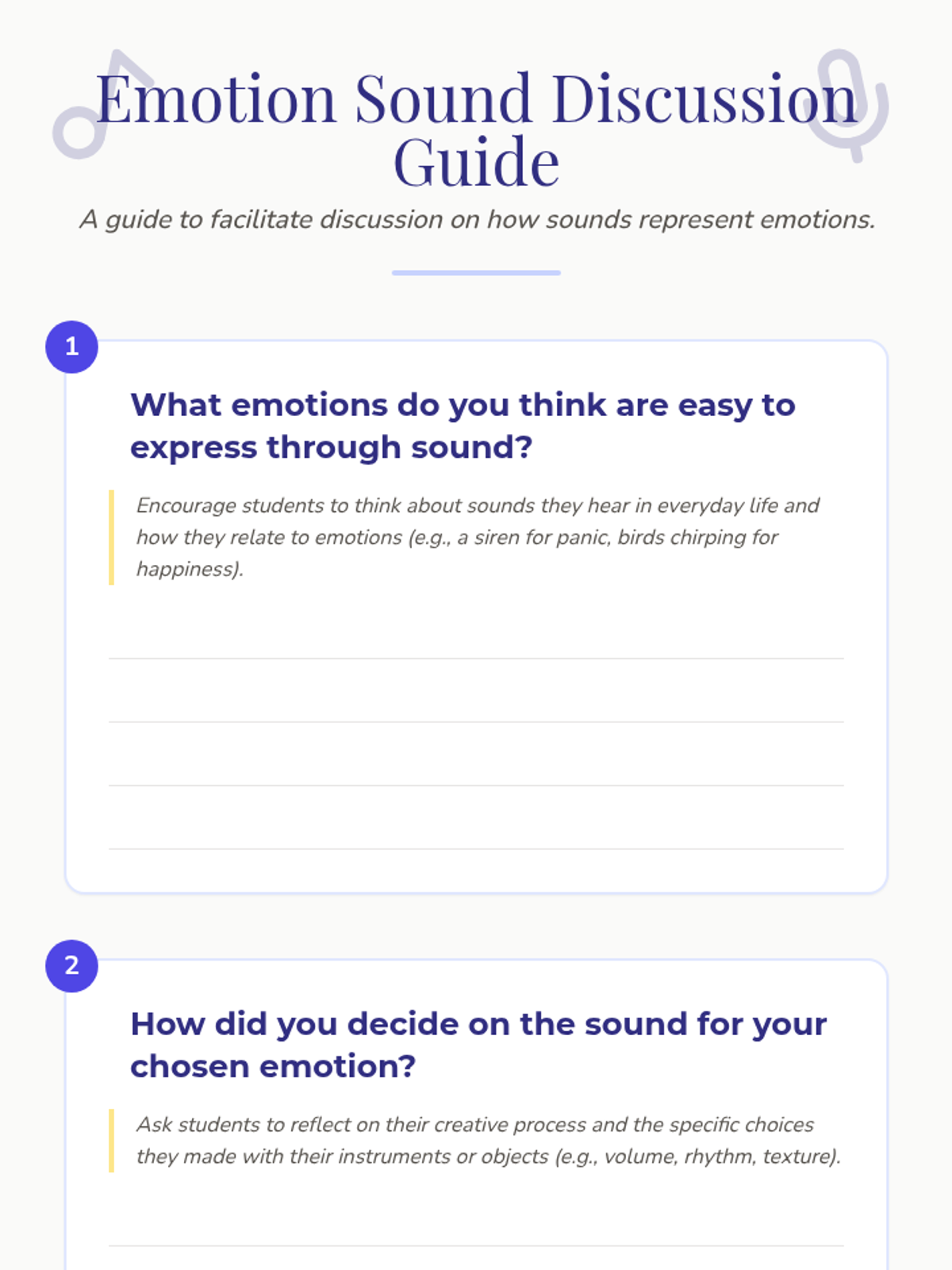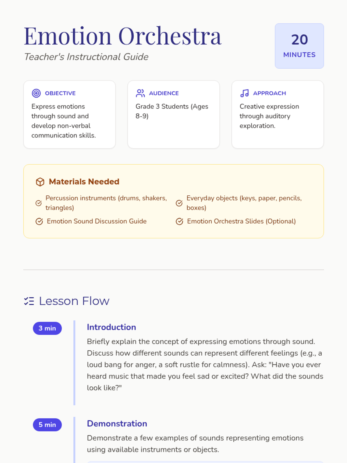 Students explore how to express emotions using percussion and everyday objects, developing non-verbal communication and auditory skills through creative sound design.