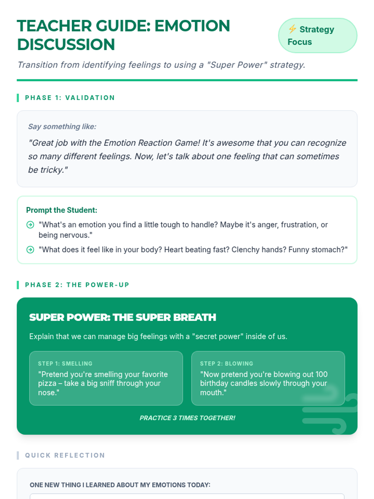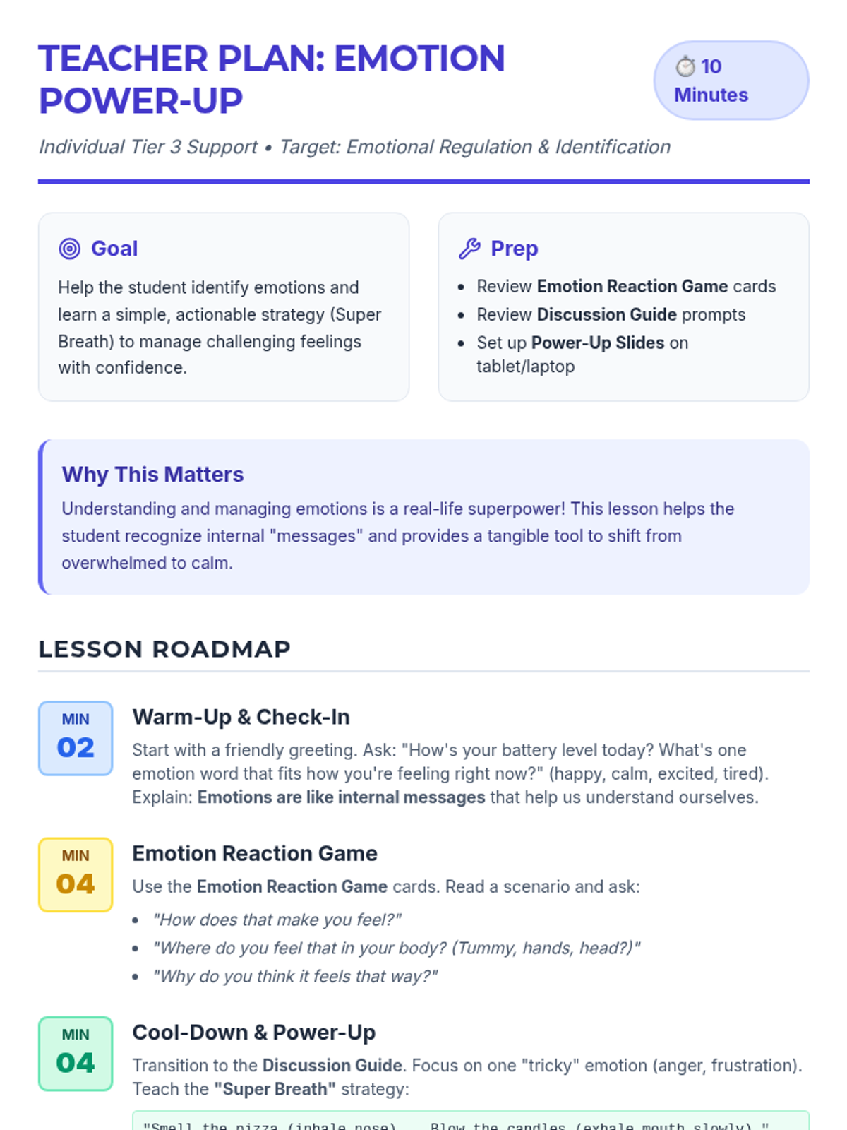 A 10-minute individual Tier 3 lesson designed to help a 9-year-old boy identify emotions and use 'Super Breaths' as a coping strategy through a video-game-themed 'Power-Up' approach.