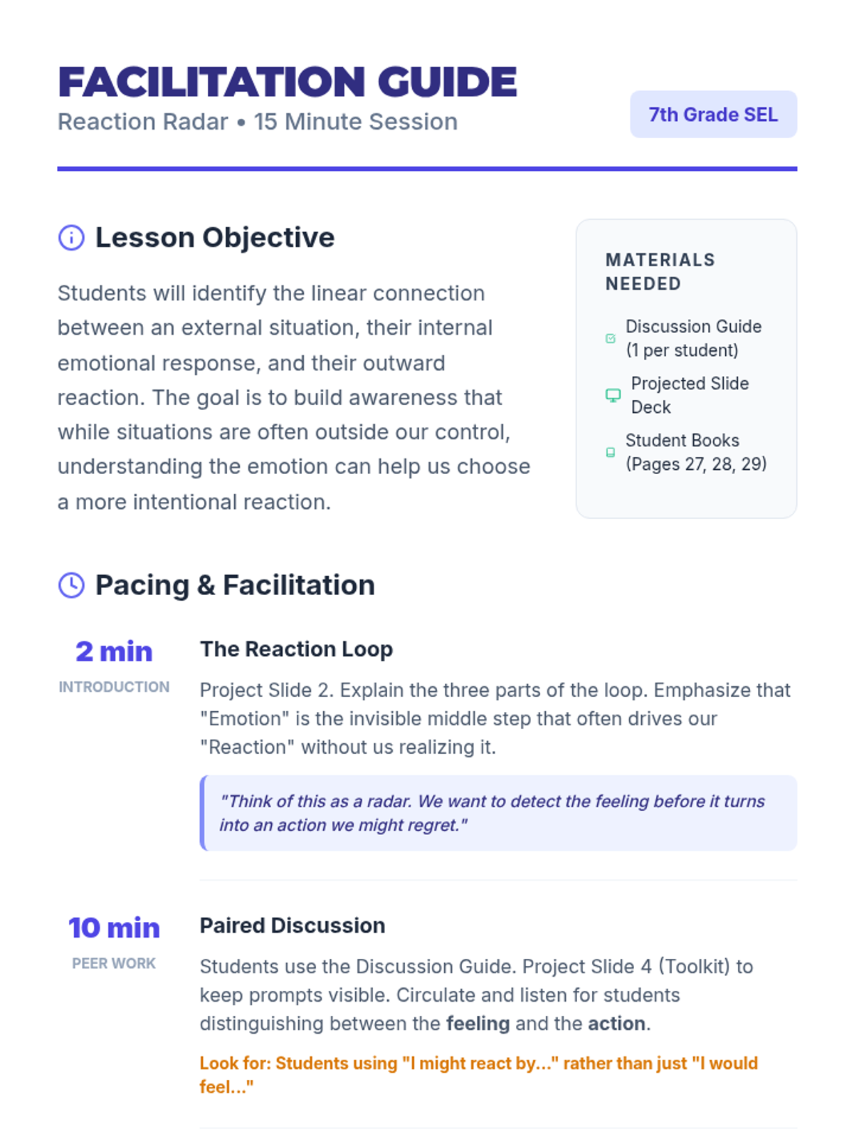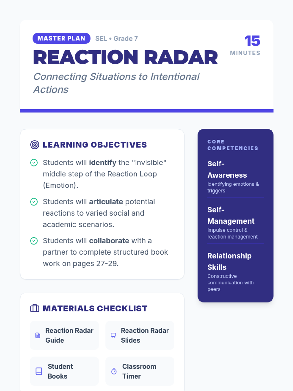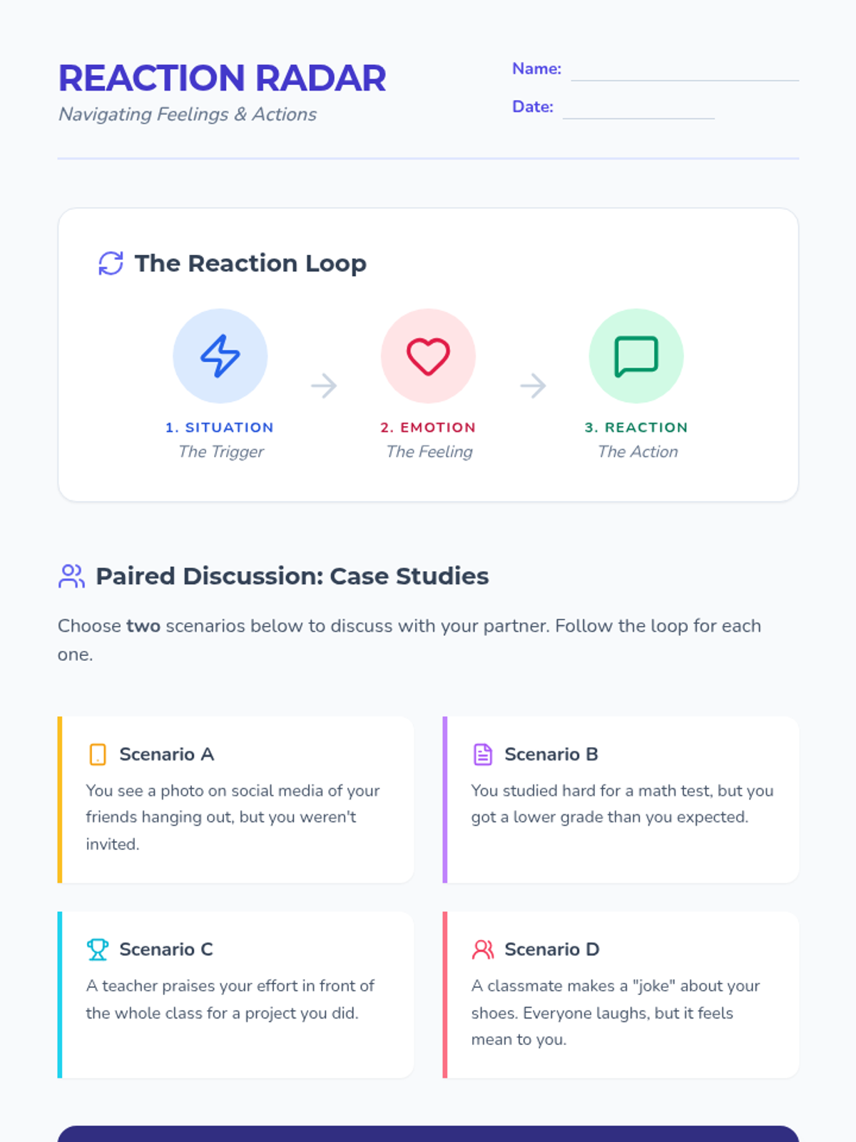 A short, high-impact lesson for 7th graders to explore the connection between situations, emotions, and their subsequent reactions through peer discussion.