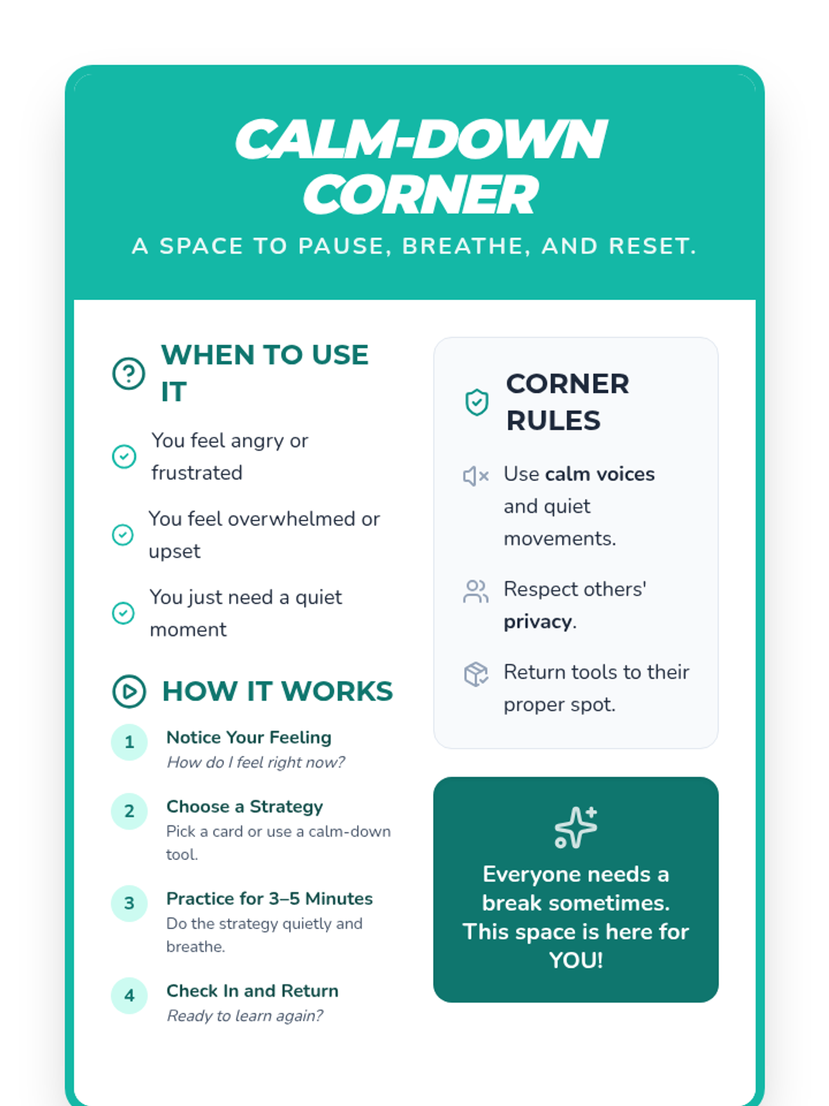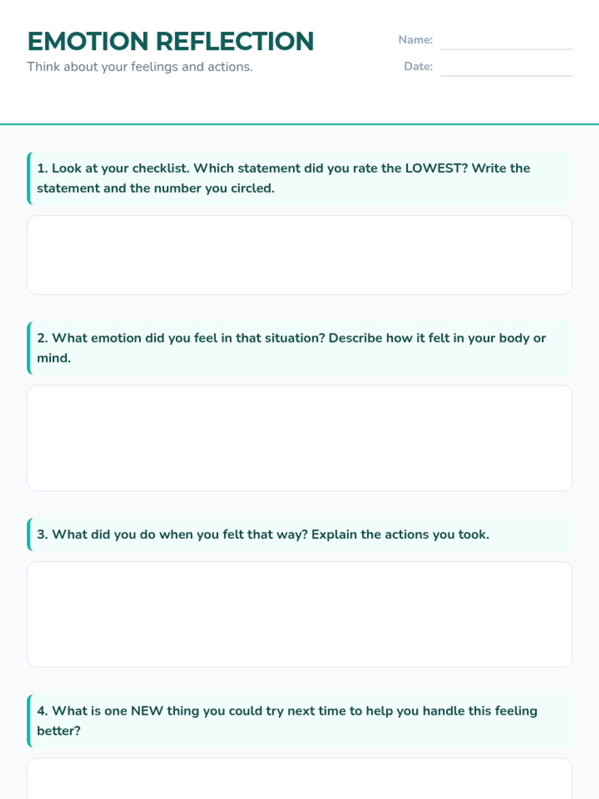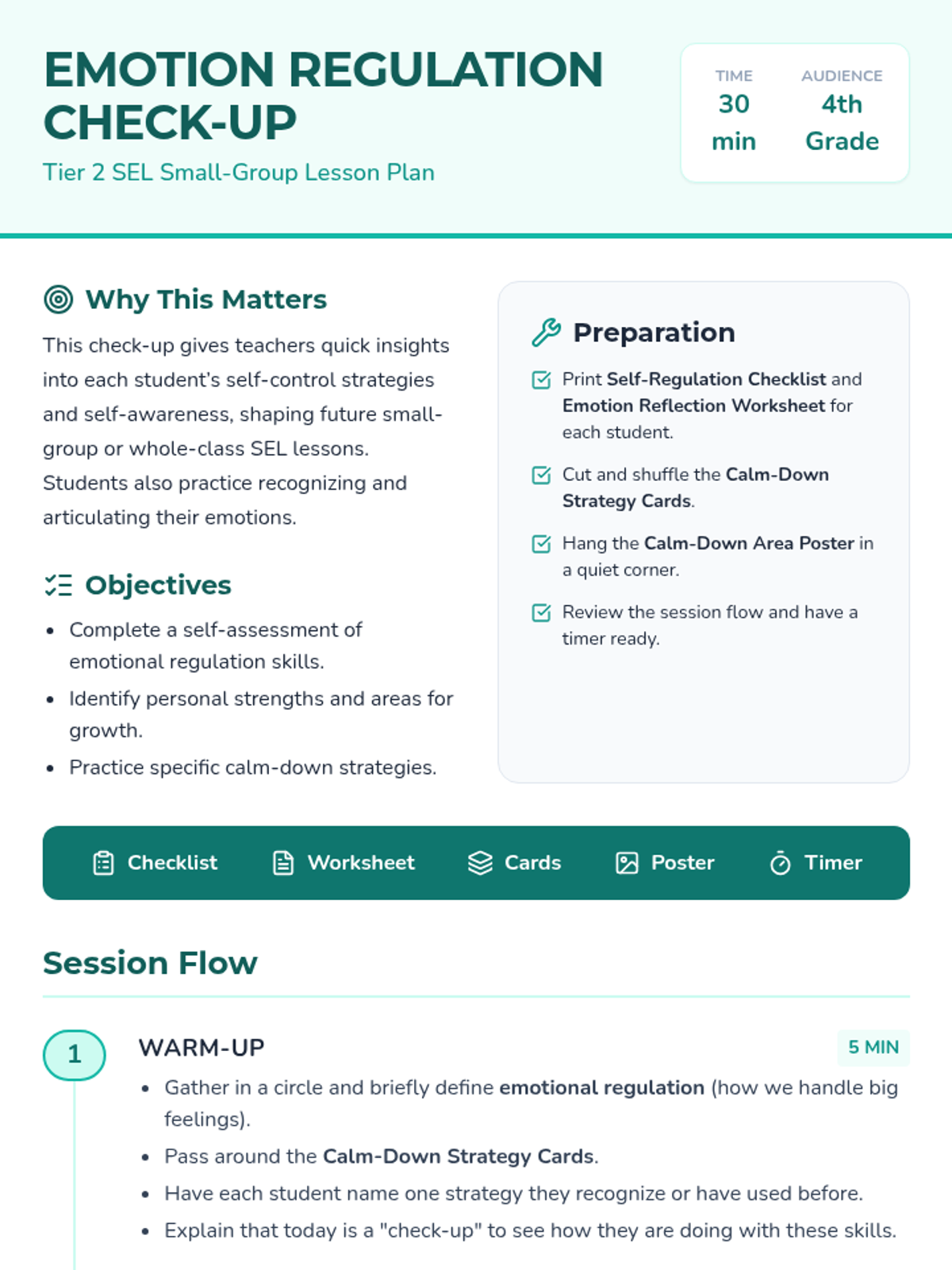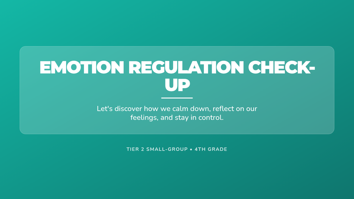 A 30-minute Tier 2 small-group session for 4th graders to assess their emotional regulation skills and learn calm-down strategies through self-reflection and guided practice.