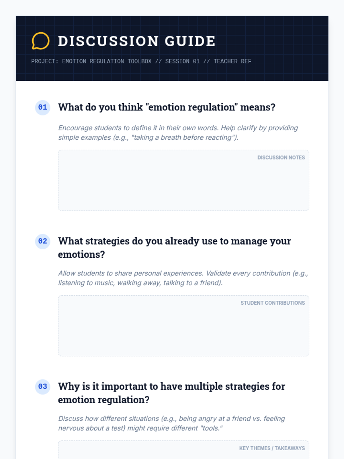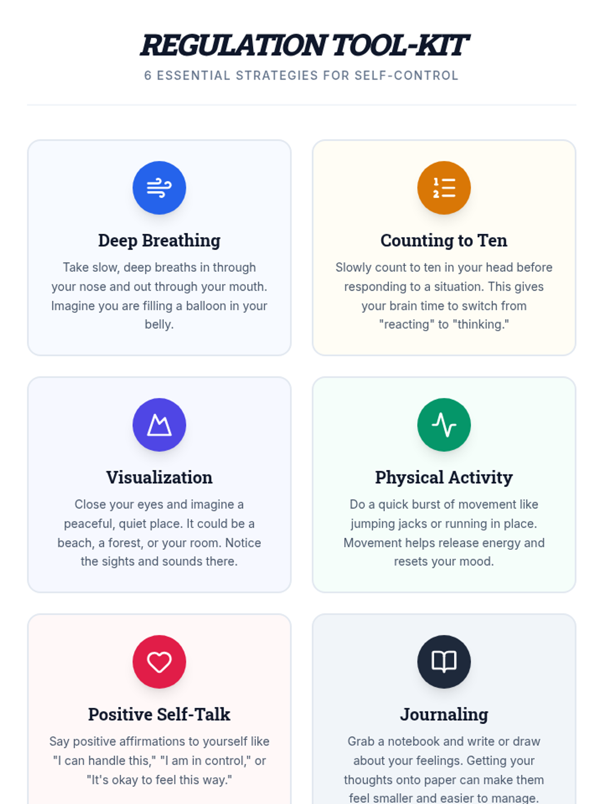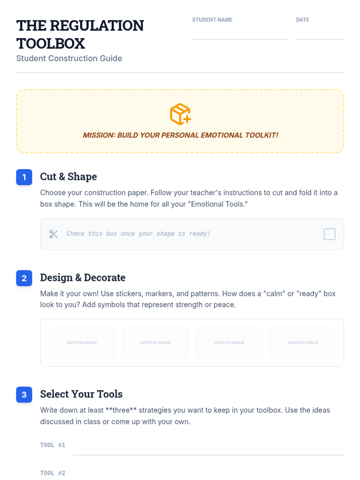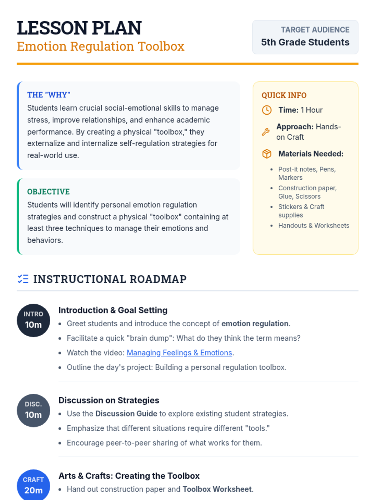 A comprehensive lesson where 5th-grade students learn to identify and manage their emotions by building a personal 'toolbox' of regulation strategies. Through discussion, creative crafts, and practical exercise, students develop self-awareness and self-control skills.