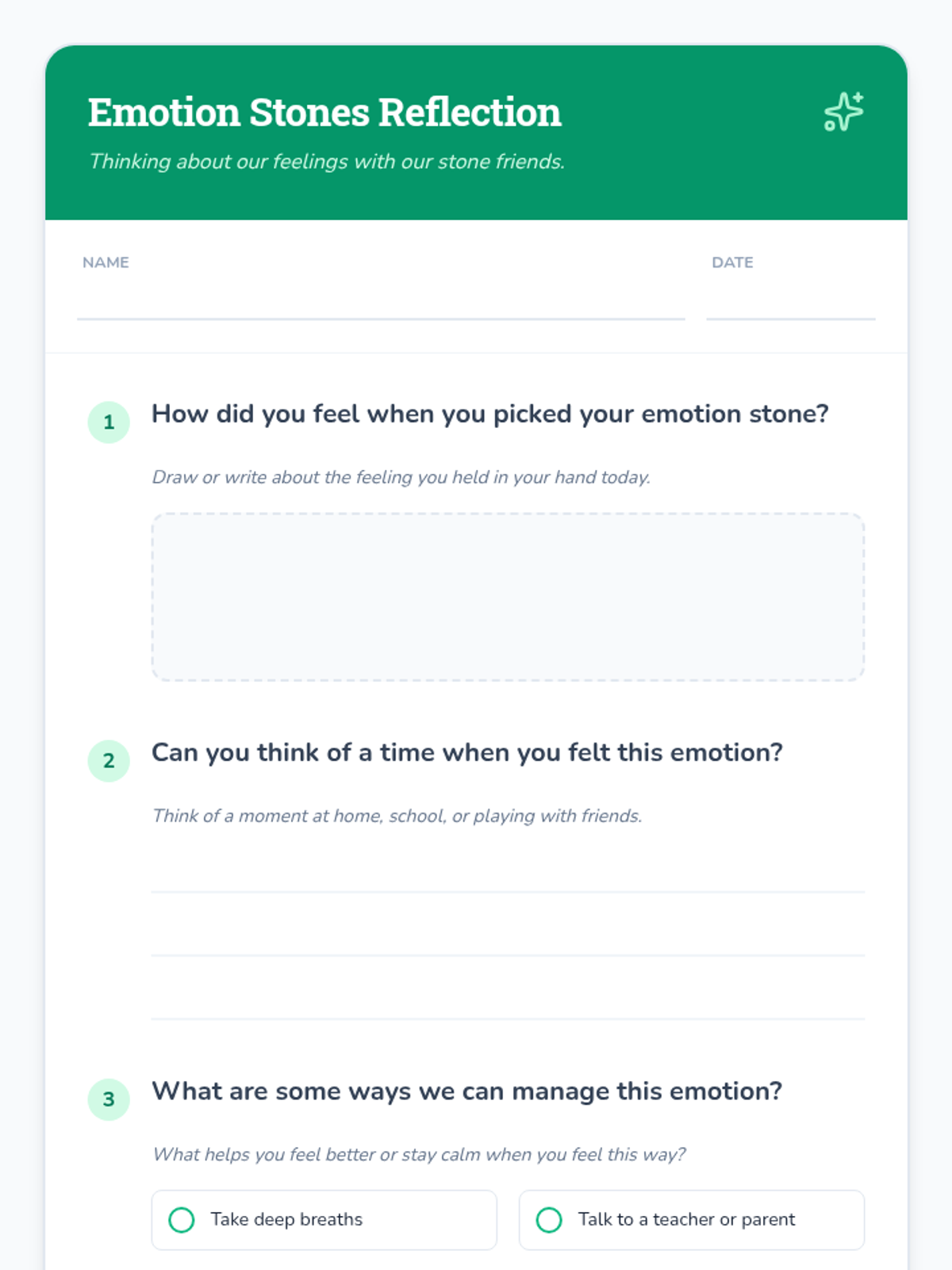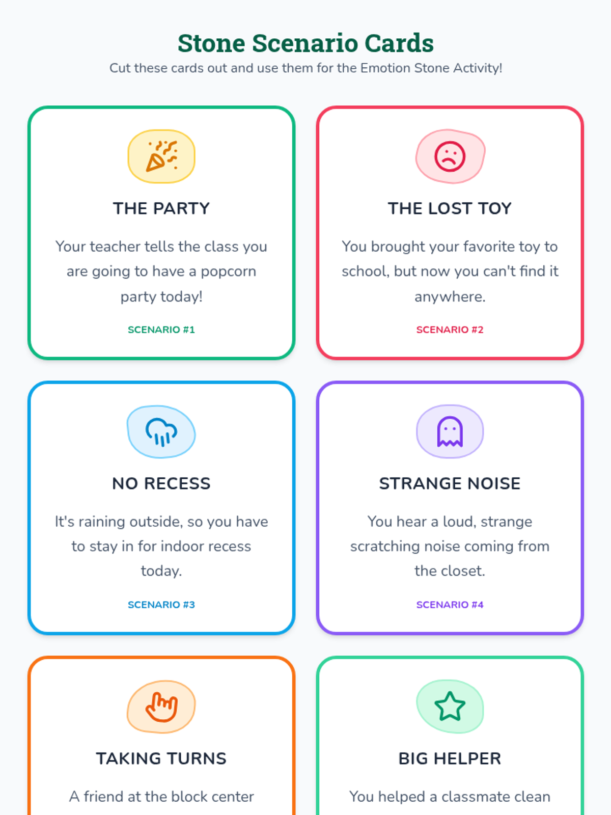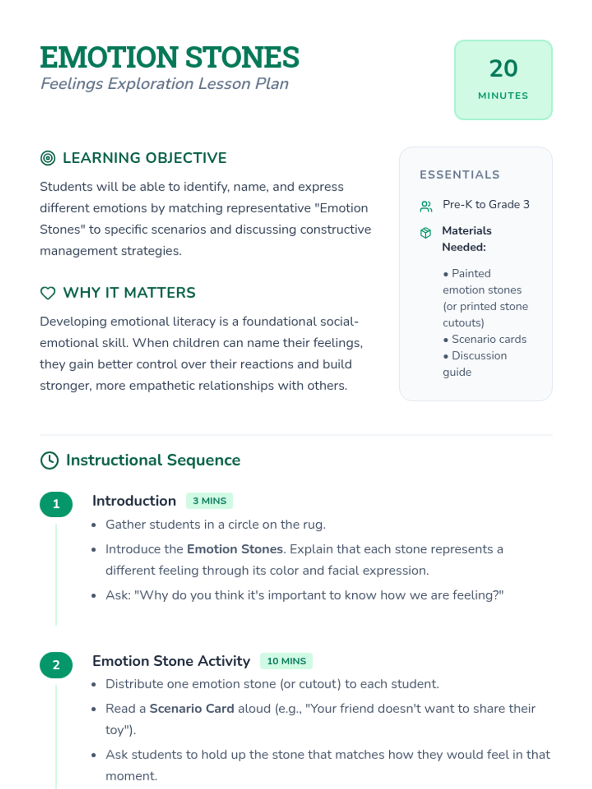 A social-emotional learning lesson where students use painted stones to identify, express, and manage various emotions through scenarios and discussion.