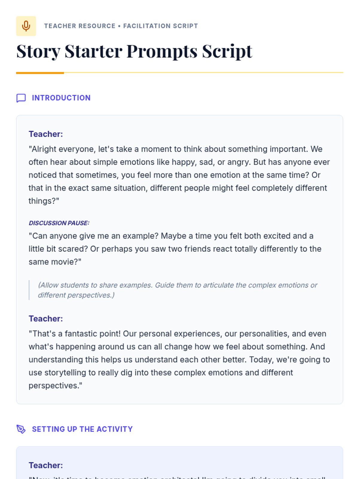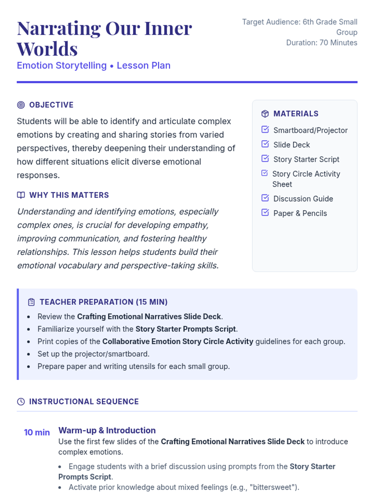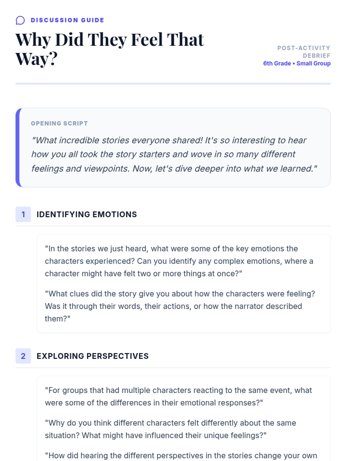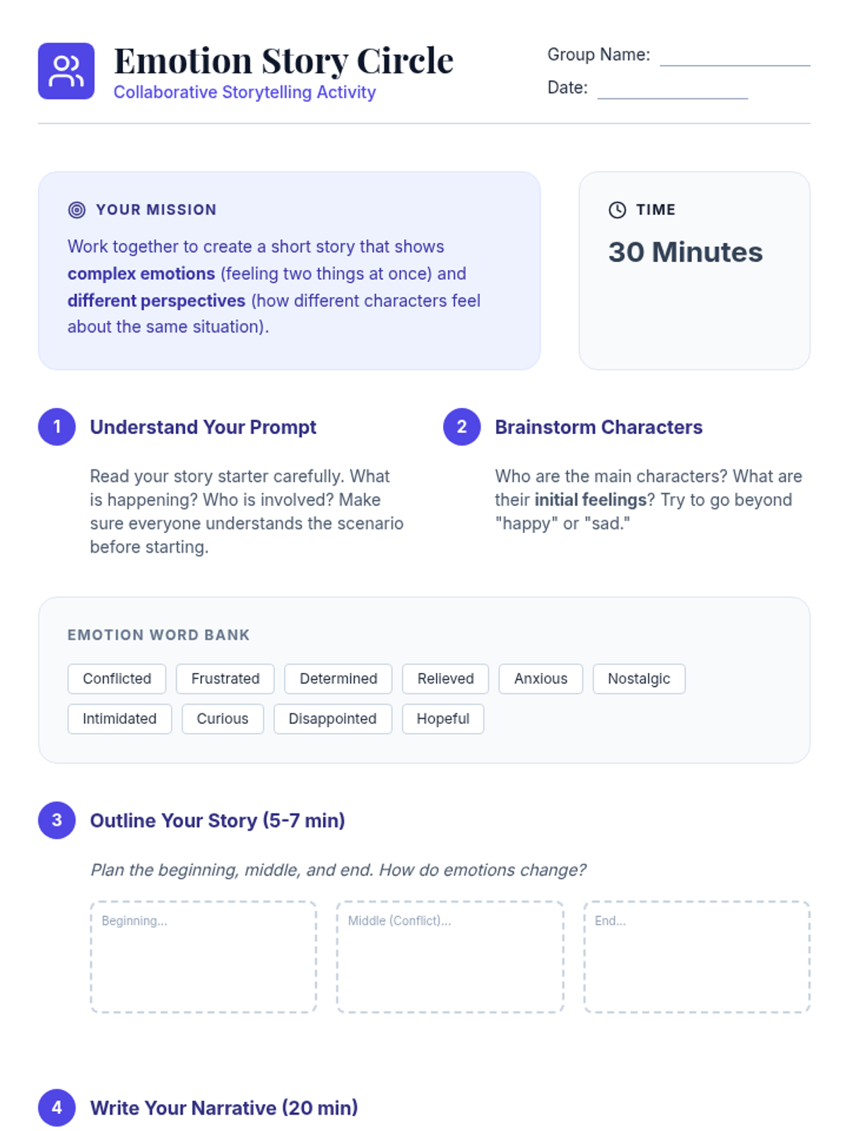 A 6th-grade small group lesson where students explore complex emotions and perspective-taking through collaborative storytelling and discussion.