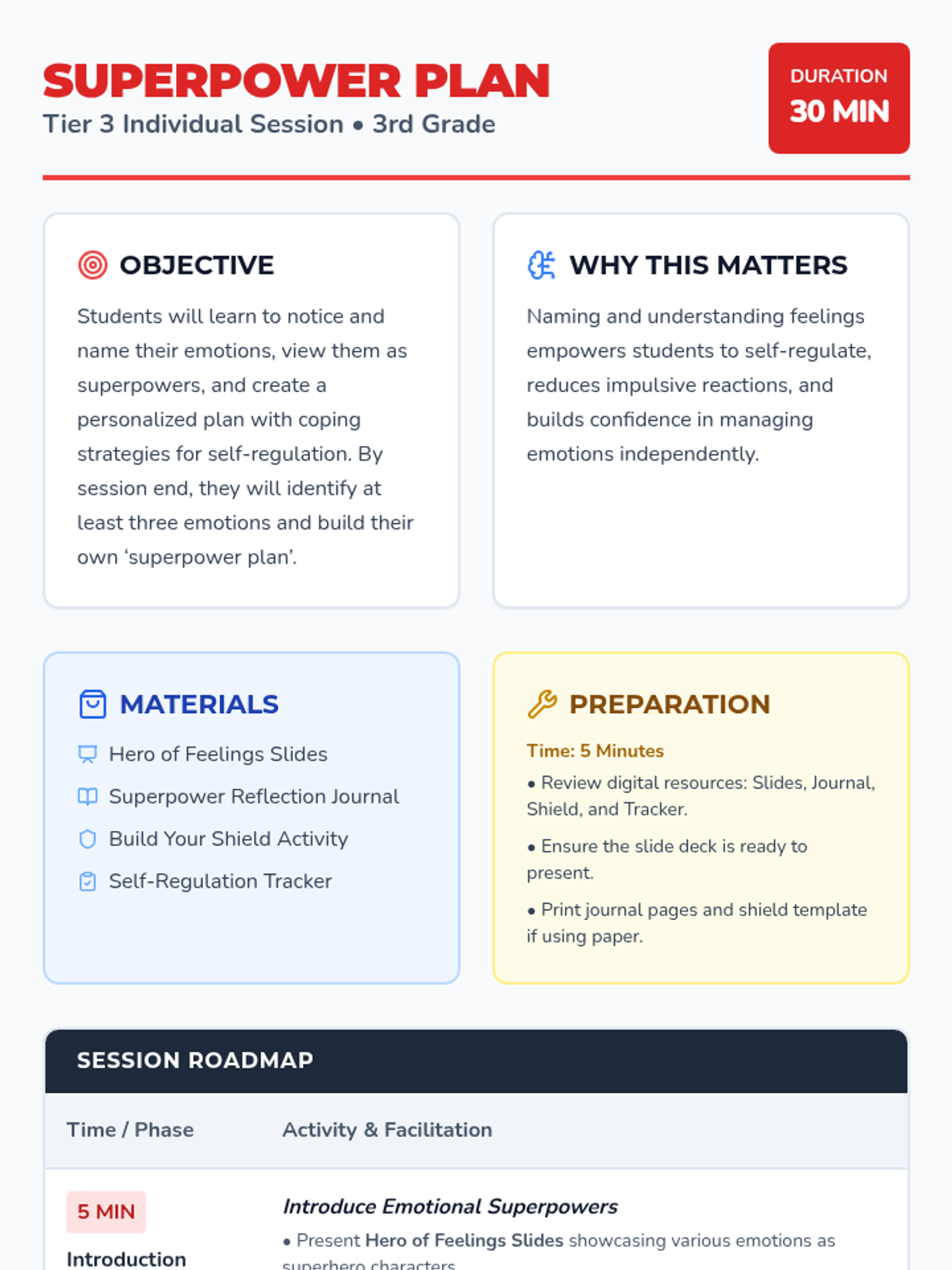 A Tier 3 social-emotional learning lesson for 3rd graders that frames emotion identification and regulation as discovering and using 'superpowers'. Students will name their feelings and build a personalized 'superpower plan' with coping strategies.