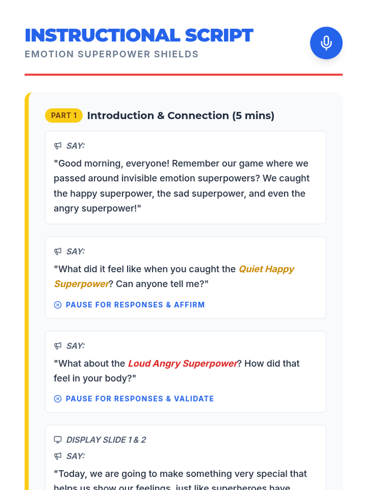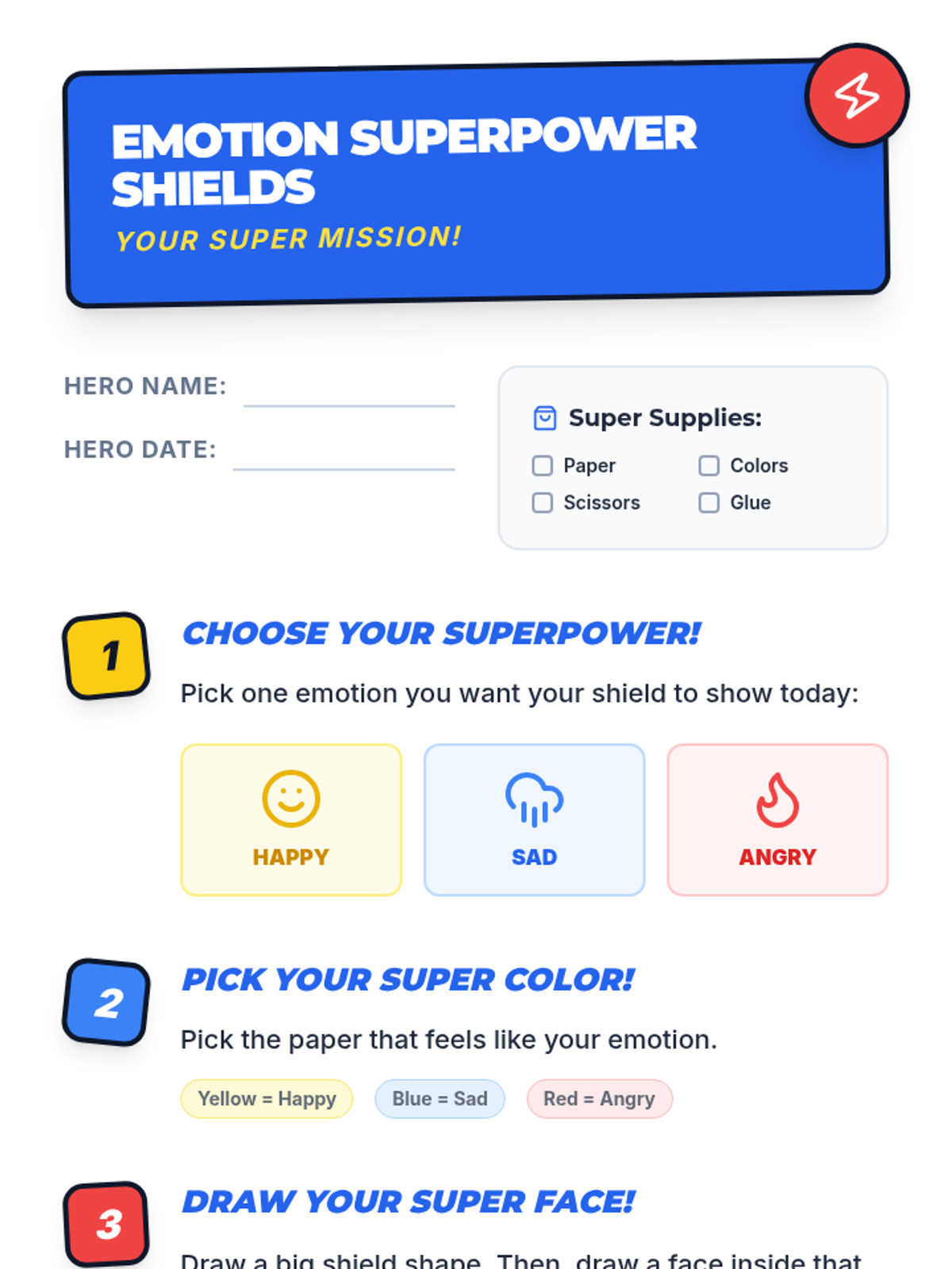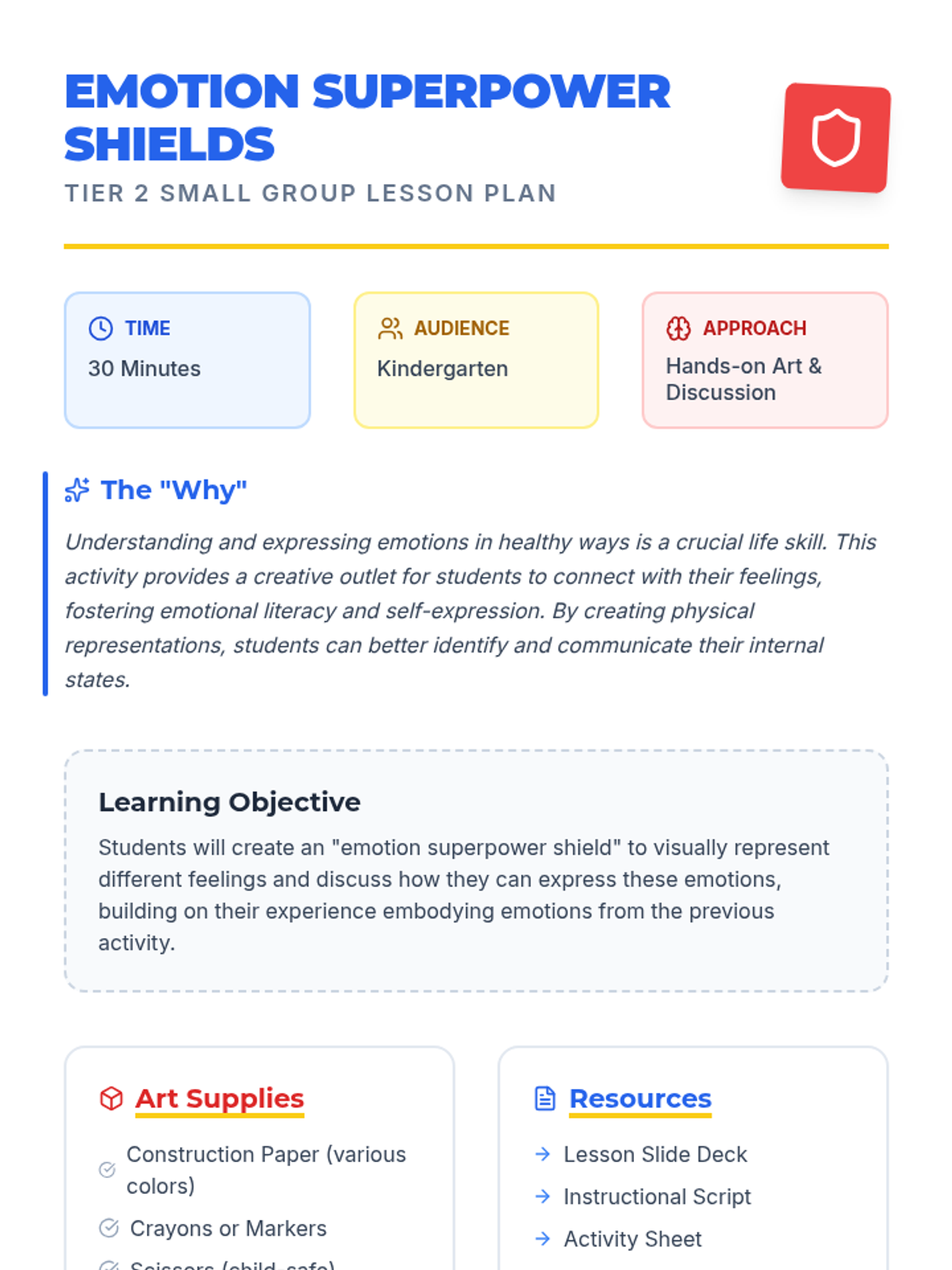 A 30-minute Tier 2 small group lesson for Kindergarten students to explore and express emotions by creating 'emotion superpower shields.' Students build emotional literacy through art and discussion.